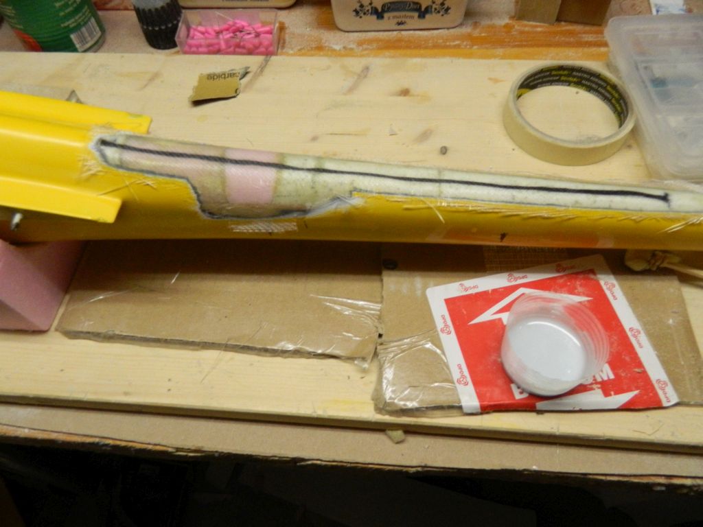 Kadłub jednak już nie. Przednia część kadłuba - kabina - włącznie z centro, oraz tylna część kadłuba - strefa mocowania usterzenia, bez uwag. Najgorsze usterki wykryłem w belce ogonowej, czyli strefą między krawędzią spływu płata a krawędzią natarcia statecznika pionowego. Dwa pęknięcia kadłuba w tej strefie, na górnym obrysie, powiększające się pod wpływem nacisku :( . Decyzja jedna. Zdarcie poszycia i dokładna kontrola struktury. Po sprawdzeniu okazało się, że popękany jest laminat pokrywający styro na górze kadłuba, Pęknięcia zatrzymują się na podłużnicach. Wycięcie popękanych miejsc, wklejenie nowego kawałka styro, szlif, fazowanie całej góry kadłuba i położenia rowingu z węgla a na to kilku warstw tkaniny 80 g/m^2 powinno załatwić temat. Oczywiście czeka mnie szpachlowanie i malowanie całego kadłuba ;) .