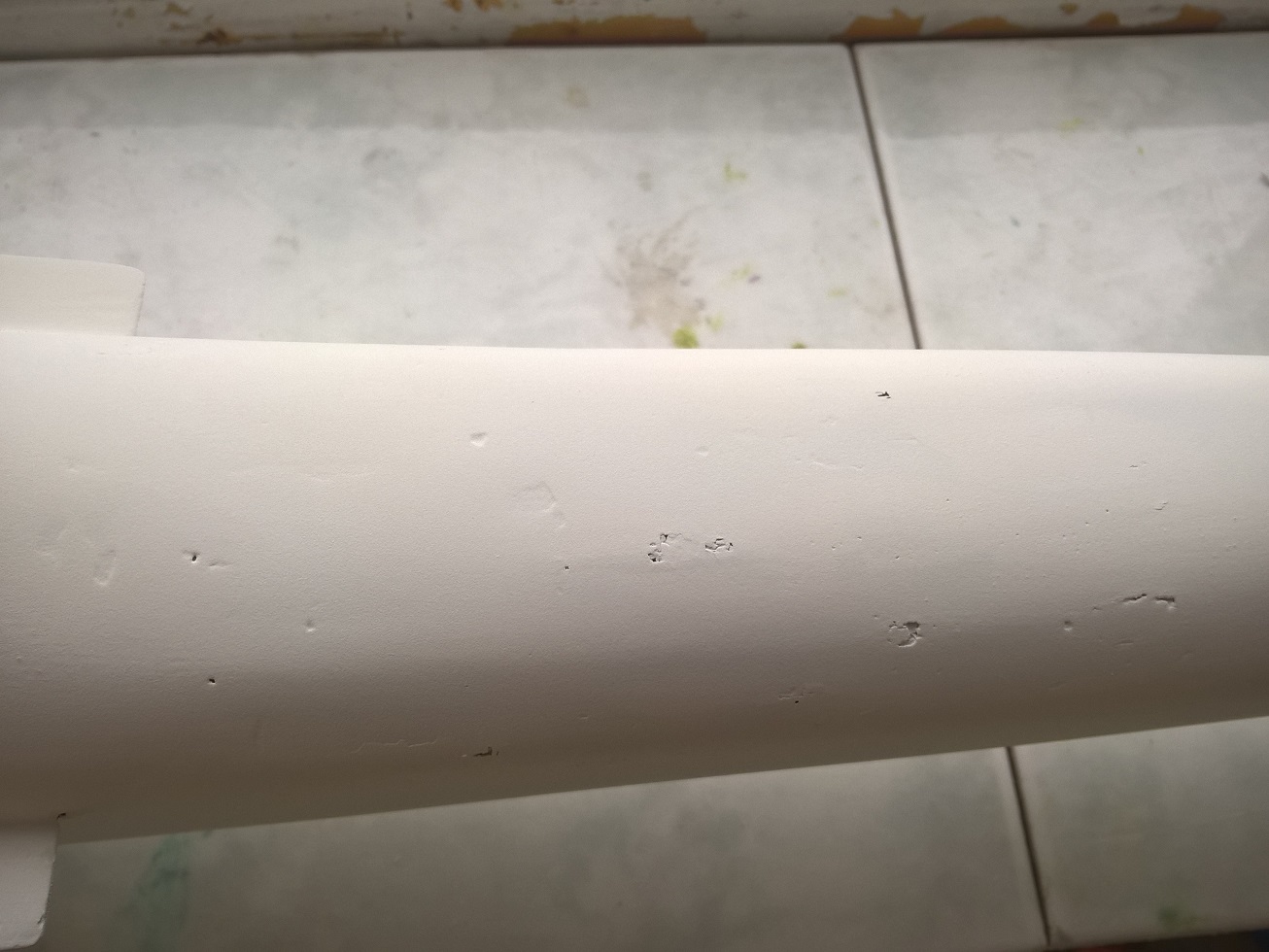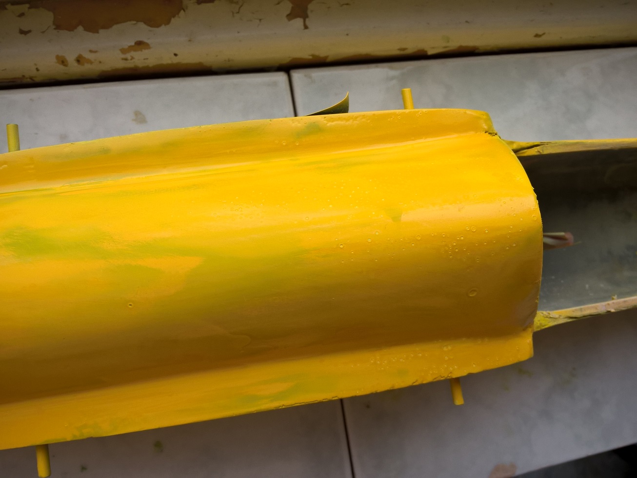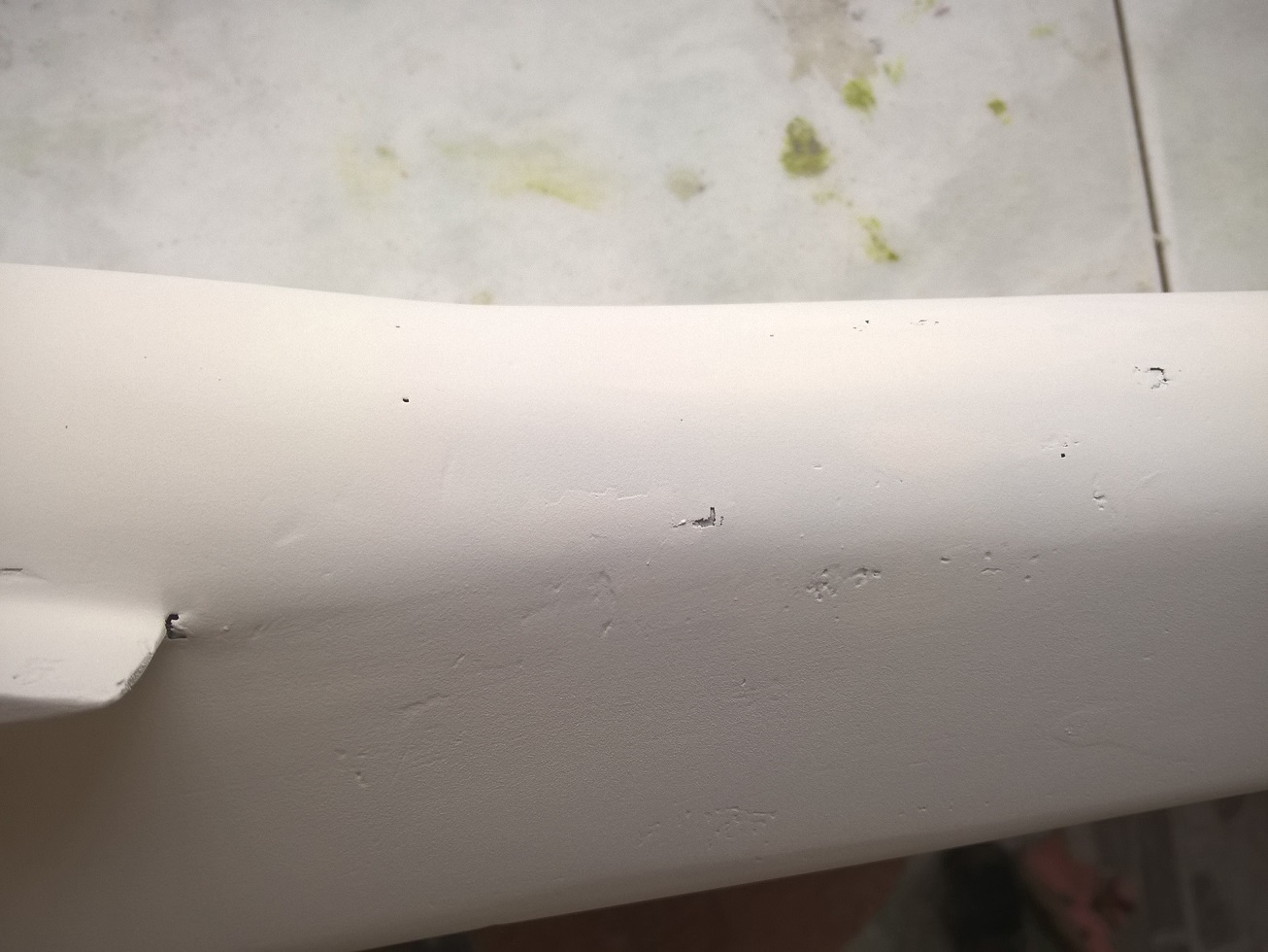 Komentarz: Zdarta powłoka lakieru, wycięte i zaklejone na nowo miejsca gdzie były opisane wyżej pęknięcia - są tam wsadzone szpilki modelarskie - wszystko fazowane pod nową warstwę laminatu.