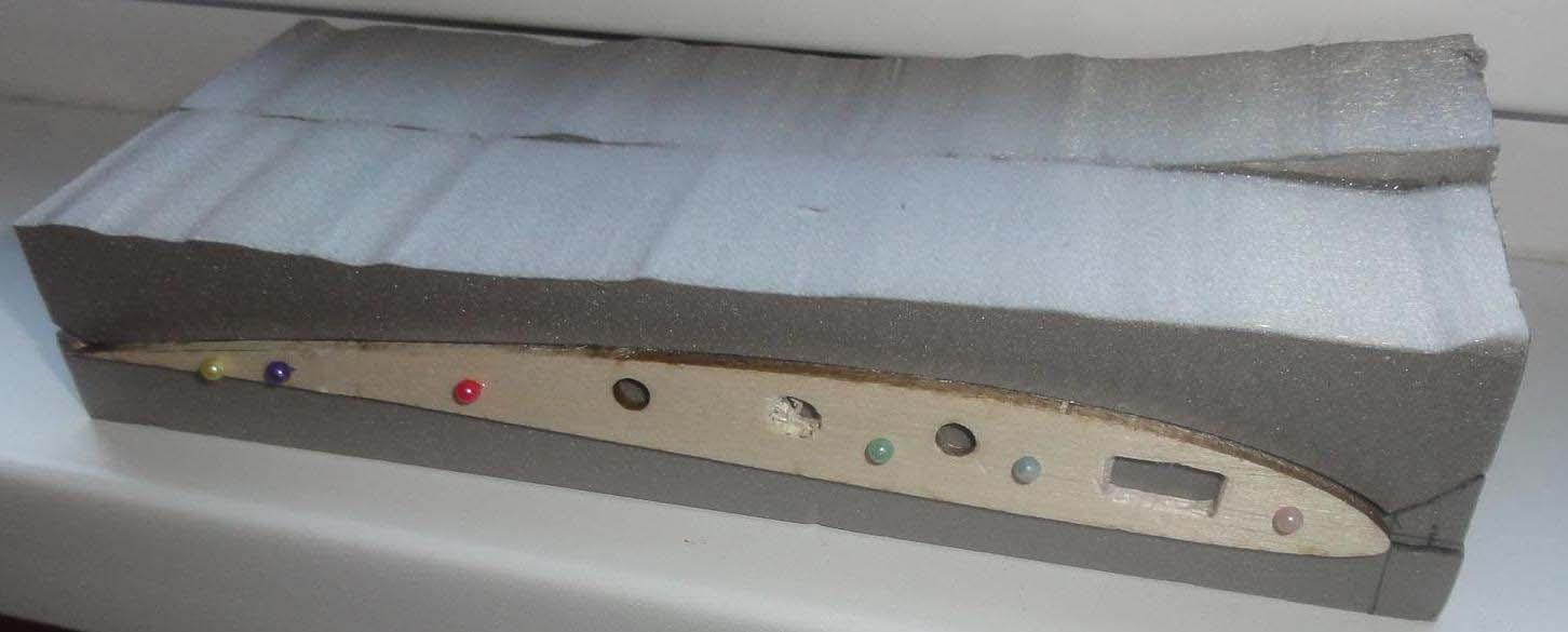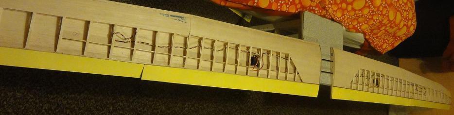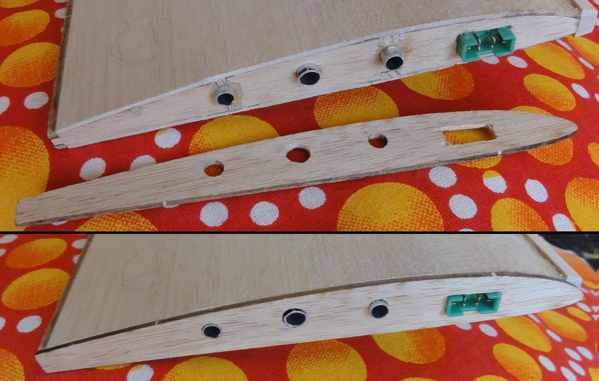 Centropłat wykonam również ze styroduru. Skleiłem ze sobą 2 kawałki styroduru i przymocowałem balsowe żebra przykadłubowe. Musiałem w nich wykonać ręcznie wycięcia pod wtyk MPX oraz otwór na środkowy łącznik (na razie prowizorycznie)