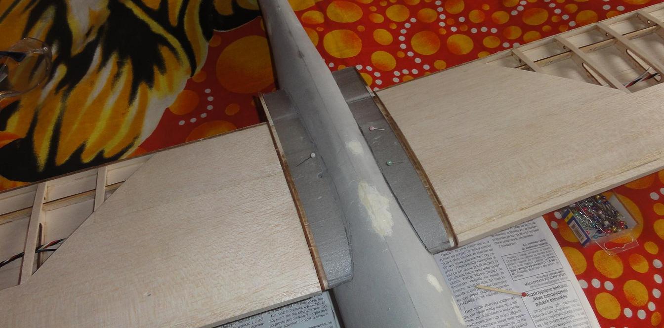 Kolejnym etapem - jest przyklejenie rurek laminatowych do kadłuba. Jeśli tylko one będą dobrze wklejone - centropłat ze styroduru też będzie równo. Smaruję soudalem 66A same rurki i ustawiam całość łącznie z płatami. Kontroluję odpowiedni kąt oraz prostopadłość względem kadłuba (np. mierzę odległości od końcówek skrzydeł do steru kierunku)