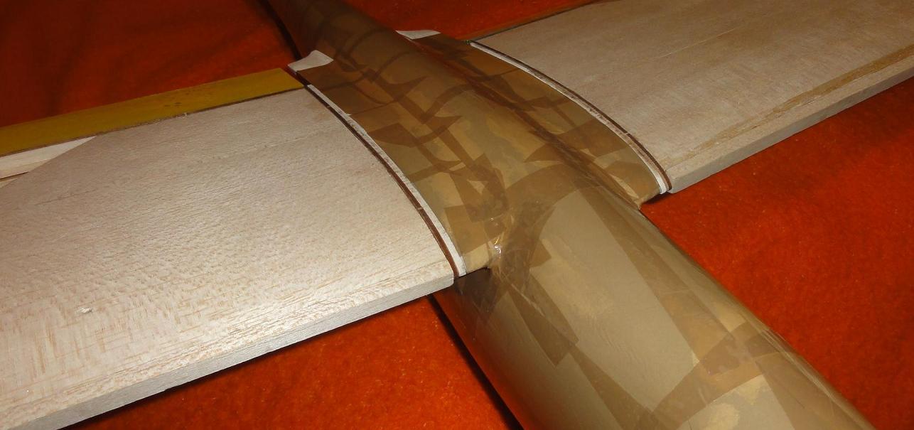 Na rurki nałożyłem wycięty centropłat. Do jednej strony mocuję szablon z papieru z zarysem górnym kadłuba. Ma to na celu ustawienie płata pod odpowiednim kątem w stosunku do kadłuba. Na poniższym zdjęciu widać że ten kąt jest zbyt duży - tył musi "pójść" wyżej