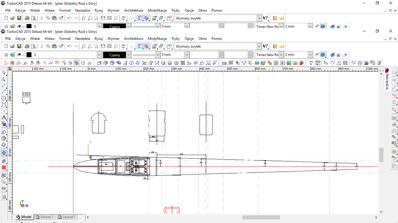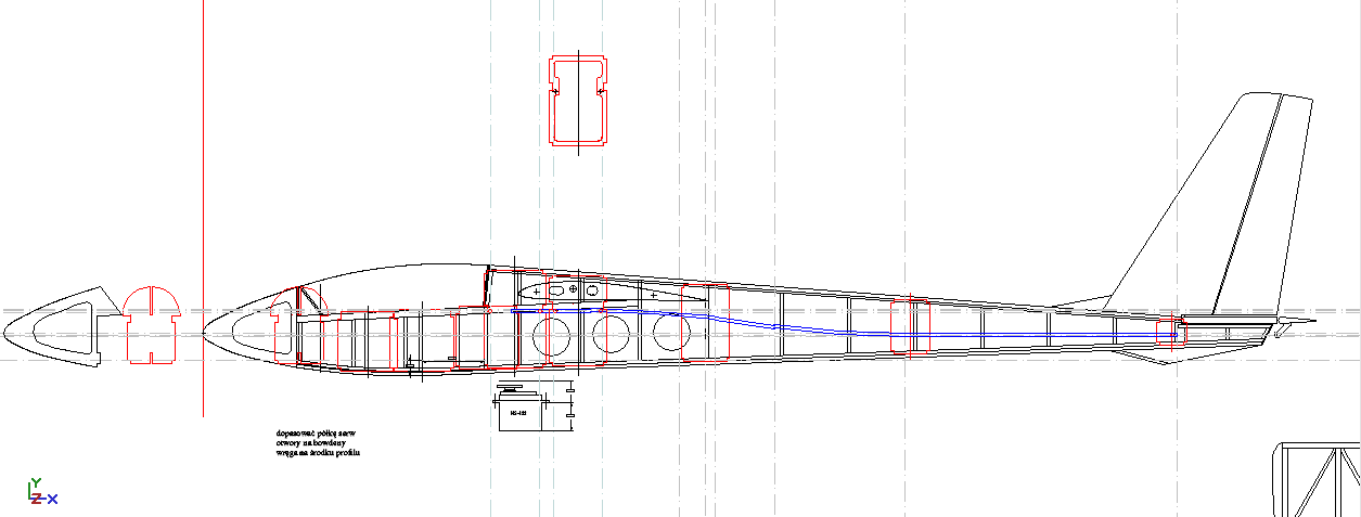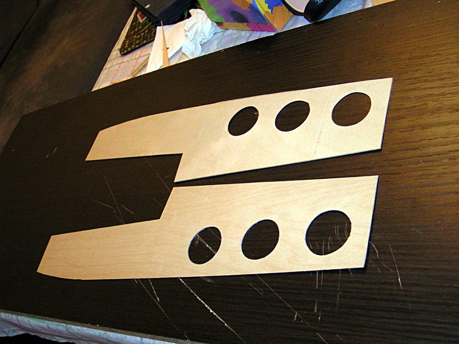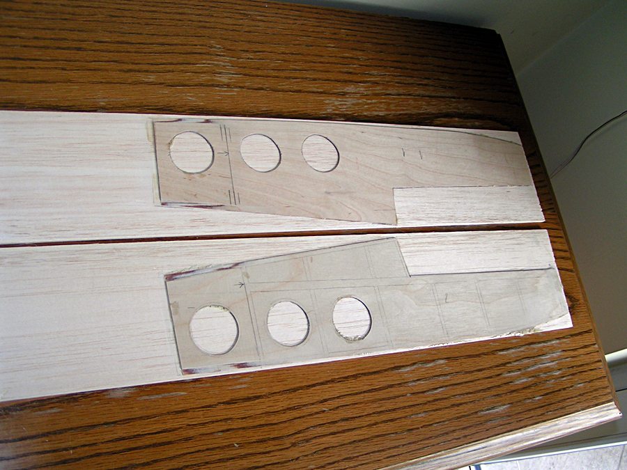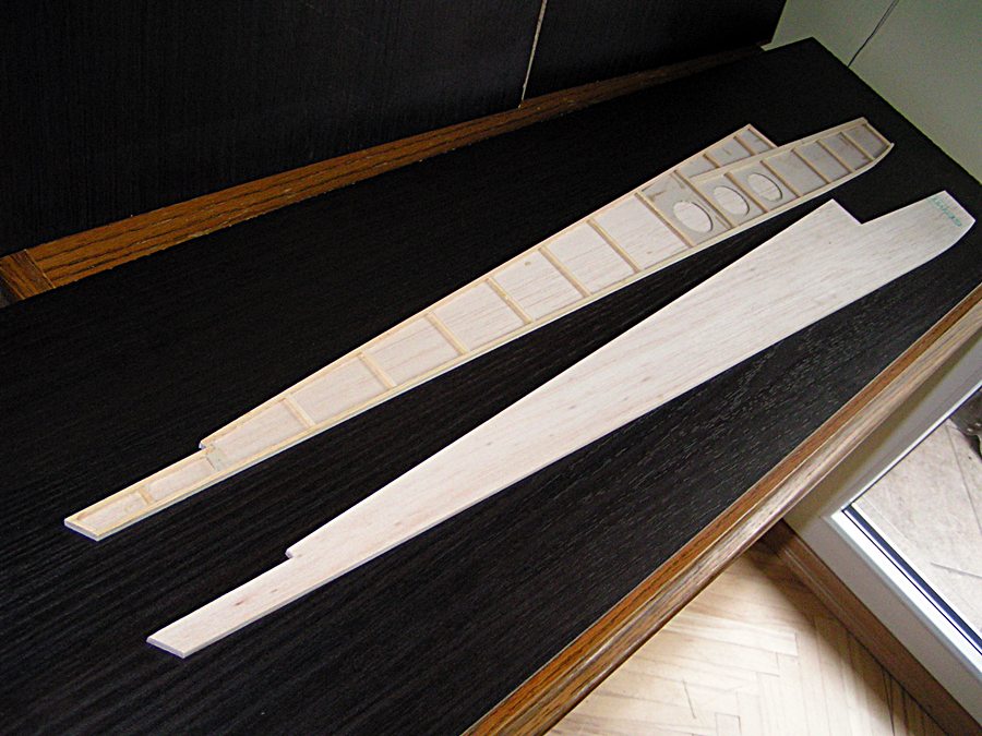 Na tym zdjęciu już wycięte i oszlifowane boki kadłuba, gotowe do dalszych prac, czyli montowania wręg, żeber przykadłubowych, kołków dla płatów i rurki na bagnet.