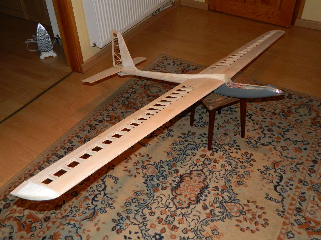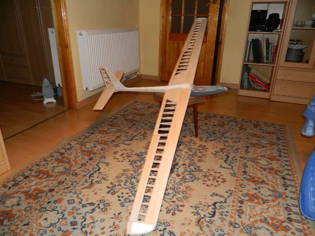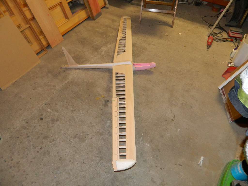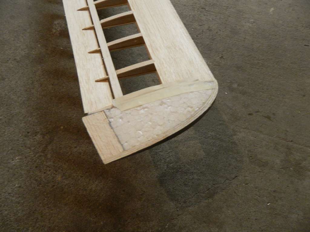 Skrzydełka dostały pełny obrys :) .....natarcie przyklejone i wstępnie oszlifowane, koncowki "wyrzeźbione" z balsy i kawałka styropianu. Teraz wszystko trzeba dopieścić......końcówki po dopasowaniu przelaminuję, tkanina 80 g/m^2, około. Zasadniczo zostały do dokończenia lotki i mocowania serw.