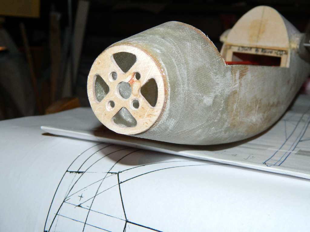 Akurat dzisiaj przykleiłem wręgę silnikową :) ....Ta "ślepa" wręga została zeszlifowana na ok 2 mm, po wewnętrznej części obwodu. Do niej na styk na żywicę /Distal/ przyklejona wręga, widać na zdjęciu. Z zewnątrz będzie to wszystko przelaminowane. Oczywiście musisz znać wymiary silnika, żeby odpowiednio zaprojektować tą wręgę....rozstaw śrub, średnica silnika no i średnicę kołpaka, jeżeli taki przewidujesz. U mnie będzie silnik z serii 28xx, dokładnie 2836 - 28 mm średnica i 36 mm długości i kołpak fi 40 mm.