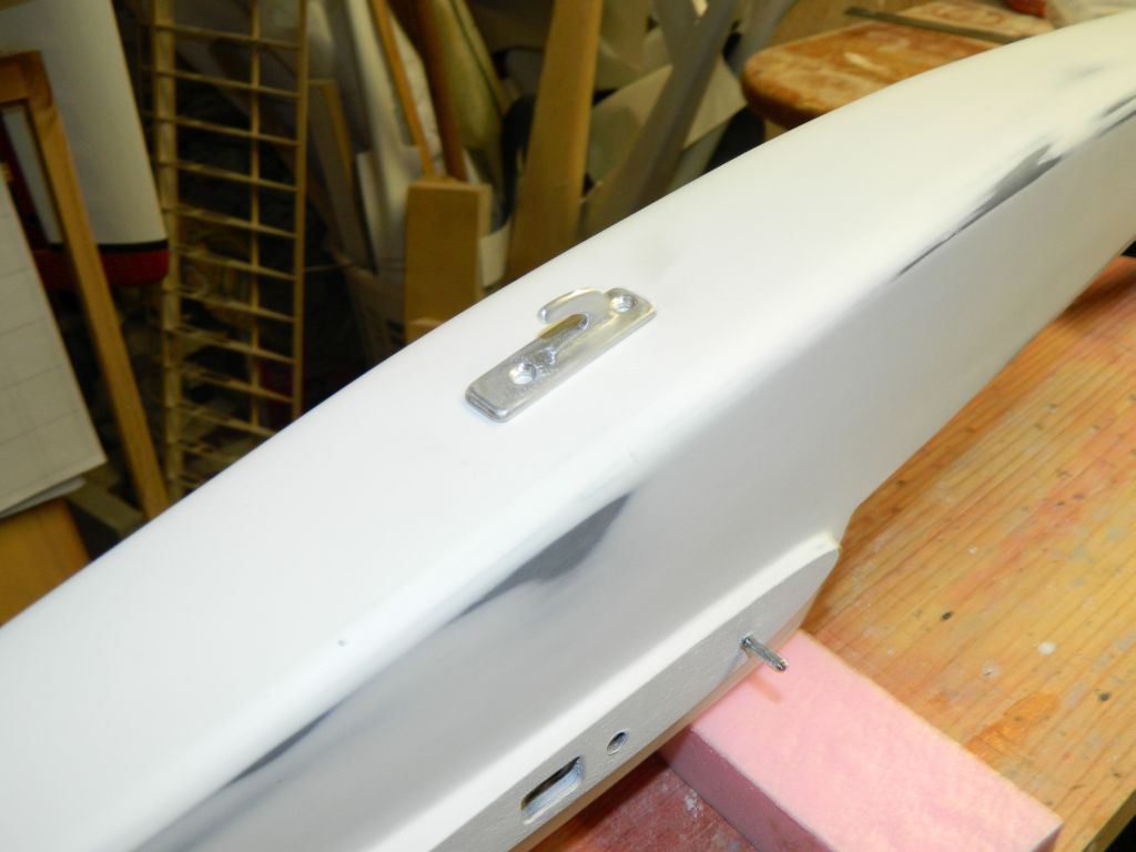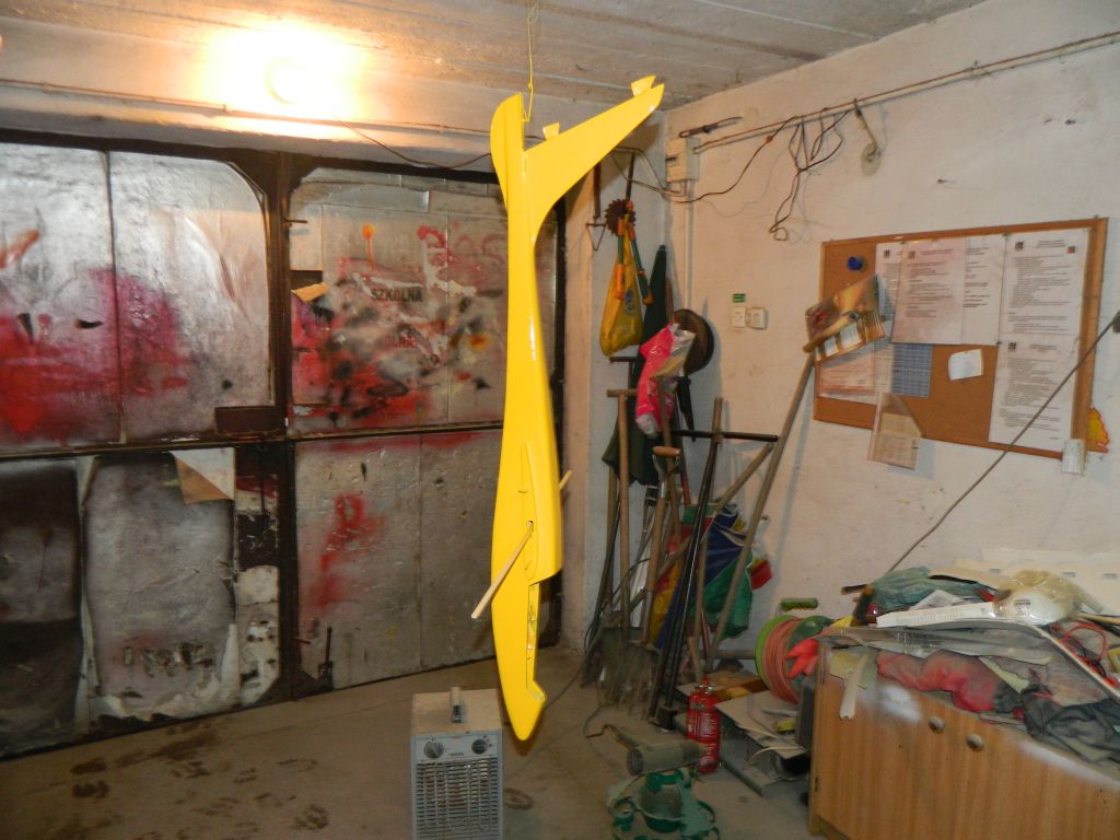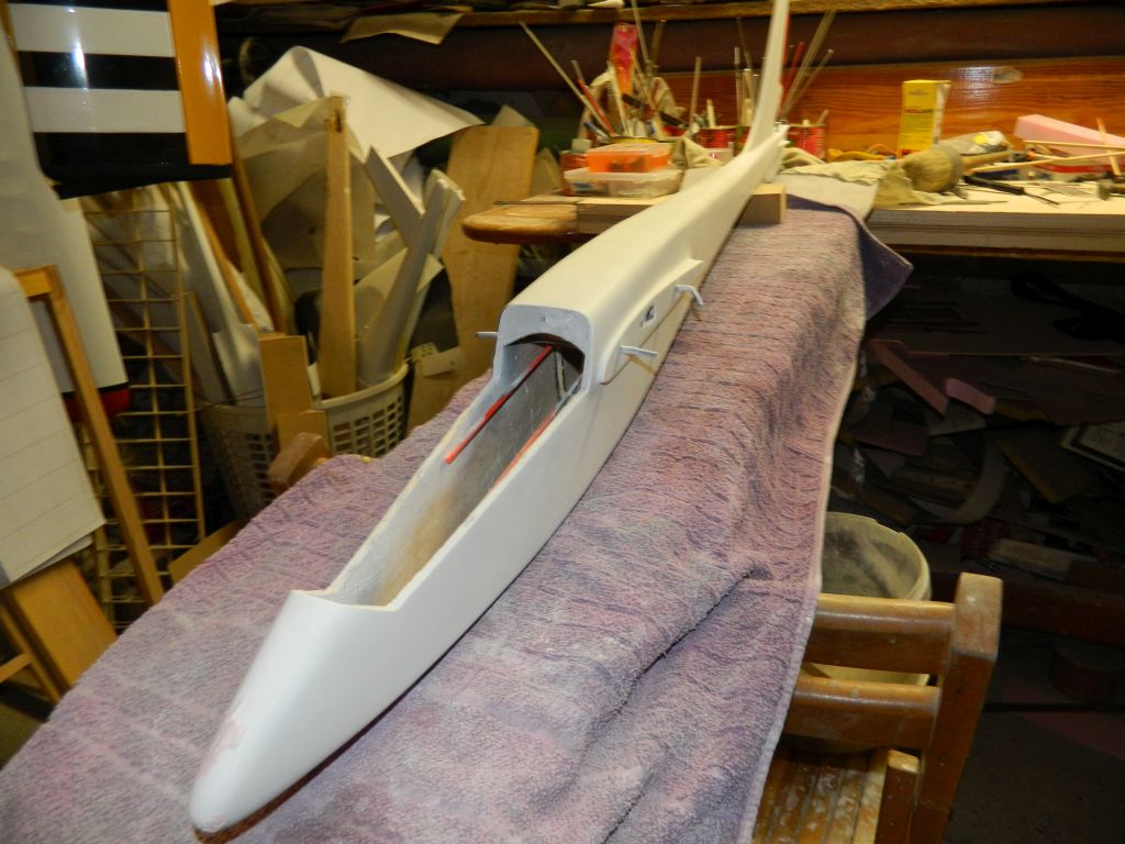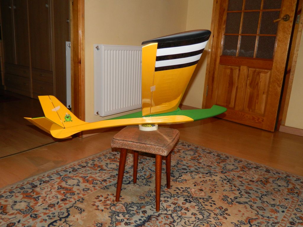 Niepowodzeń ciąg dalszy ;) Położyłem dzisiaj ostateczną warstwę podkładu białego pod lakier i podczas przenoszenia kadłuba z garażu do piwnicy, uderzyłem o coś....efekt, wgniecenie w tylnej części kadłuba, na przodzie i sama końcówka pionu :x , chyba jakieś fatum wisi nad modelem. Ale wszystko zaszpachlowałem, myślę , że jutro albo pojutrze trysnę lakierem, na razie na żółto.