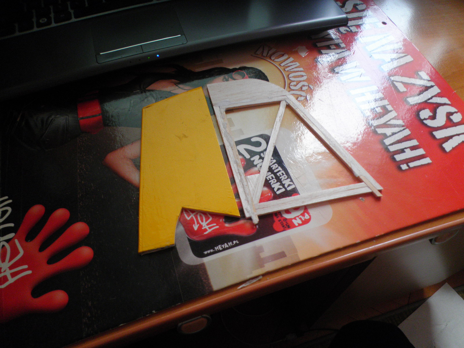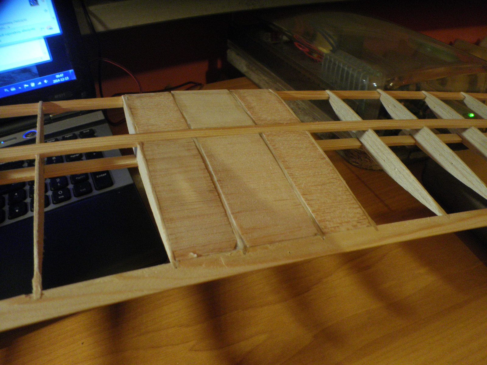 Jak skrzydła wyszły względnie nieźle to stateczniki żyły własnym życiem. Czemu? Nie mam pojęcia, wziąłem papier innej firmy :P, może jeszcze potem nitrocellon im pomoże, ale sezonowanie pod obciążeniem będzie obowiązkowe. Normalnie bym to wywalił na śmietnik, no ale gruz to gruz. SK prawie pod pasowało z prototypowego statecznika od V1 :P A budowa stateczników rozpoczęła się od docięcia paru listewek z resztki jakiejś 3mm balsy. Wzmocnienie natarcia SW z sosny, i usztywnienie SK też sosna ;)