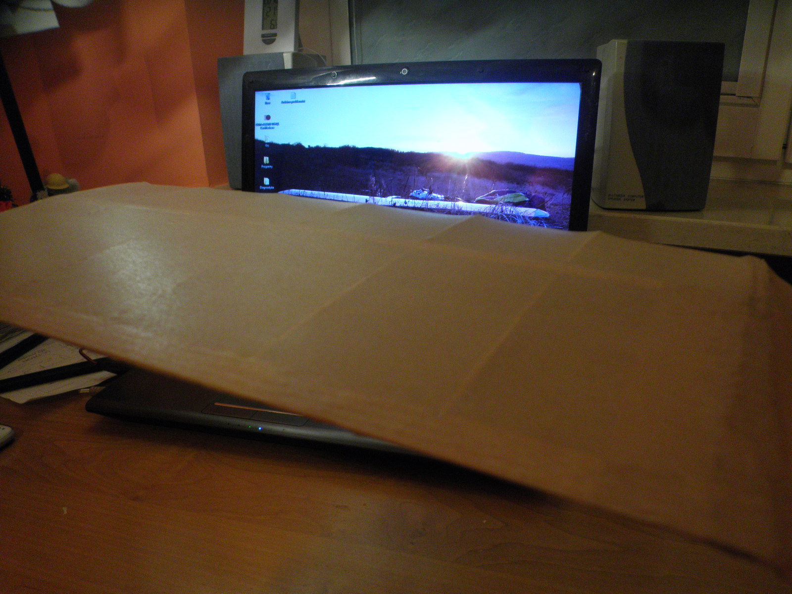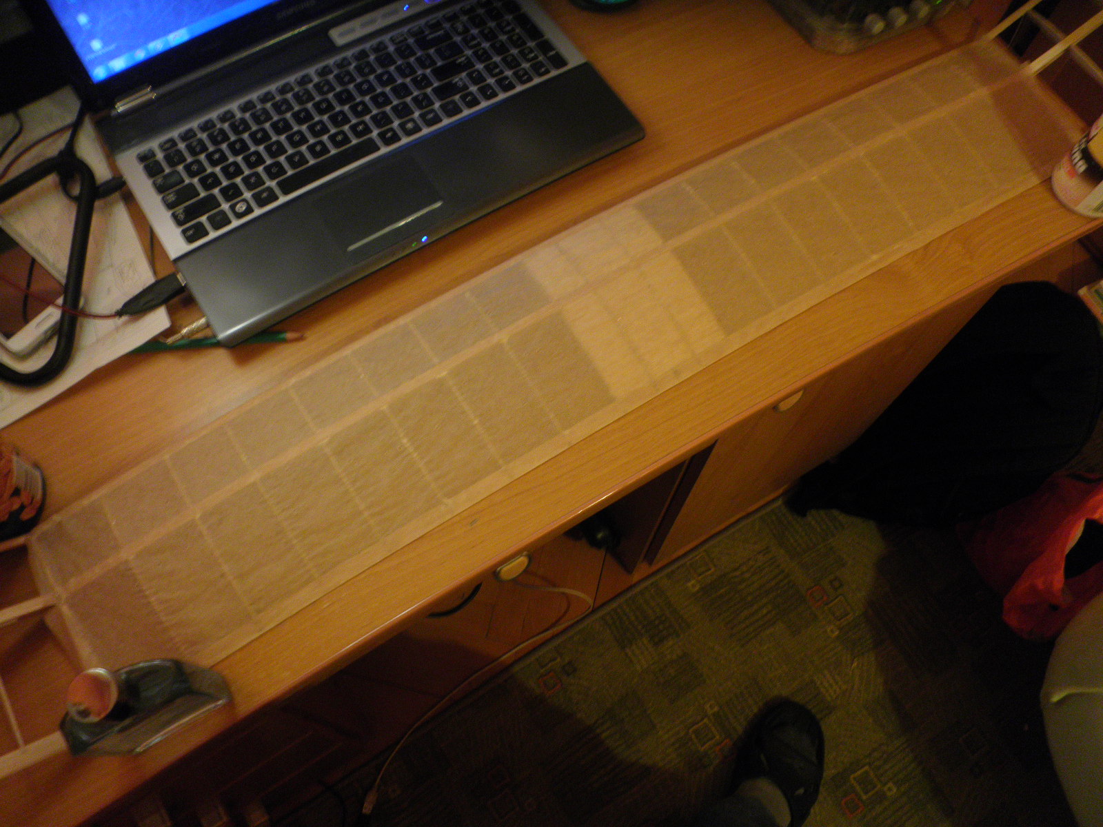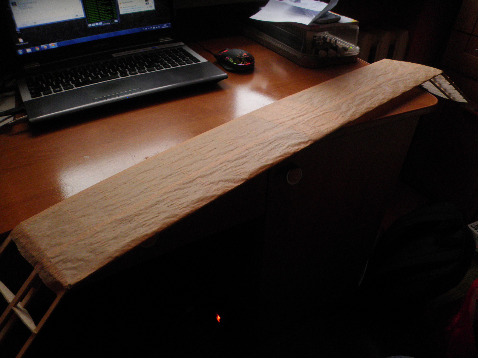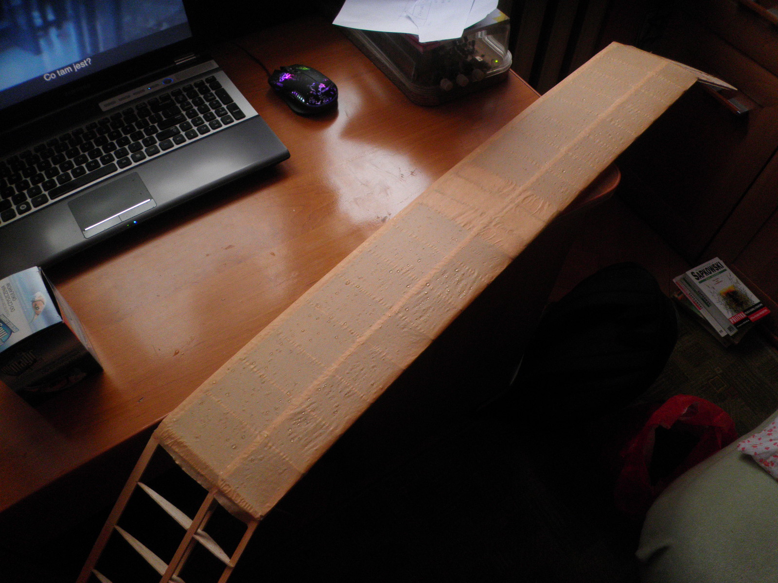 Centropłat oszlifowany, brakujące żeberko dosztukowane. No to oklejamy. Pierwszą metodą oklejania powierzchni nośnych ( a zaczynało się od latawca ) było oklejanie papierem na mokro. Więc tanio i czysto oldschoolowo poszłedł w ruch wikol, papier do pieczenia ( jest w miare lekki i długi, mogłem go dociąć jak chciałem ), woda, gąbka ( do przesączenia papieru wodą ) no i papier ścierny na załamanie struktury papieru i odcięcie resztek :) Oczywiście spływ był dociśnięty a i tak go lekko zwichrowało :)