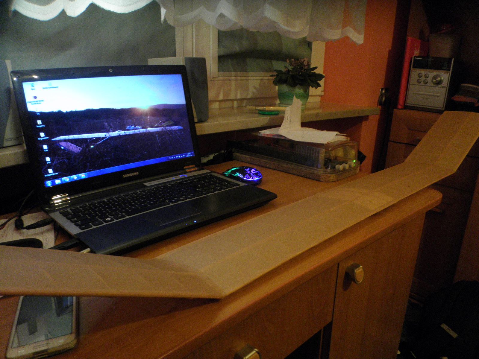 Składania coś z niczego, ciąg dalszy. Dużo paćkania sie w Soudalu, kadłub gięty w 2 miejscach, w tym celu został nacięty a potem zabrakło mi szpilek :) W międzyczasie zorinetowałem się, że popełniłem bład w projektowaniu, nie uwzględniając grubości ścianek. I dlatego przód zamiast być kwadratowy, jest prostokątny.