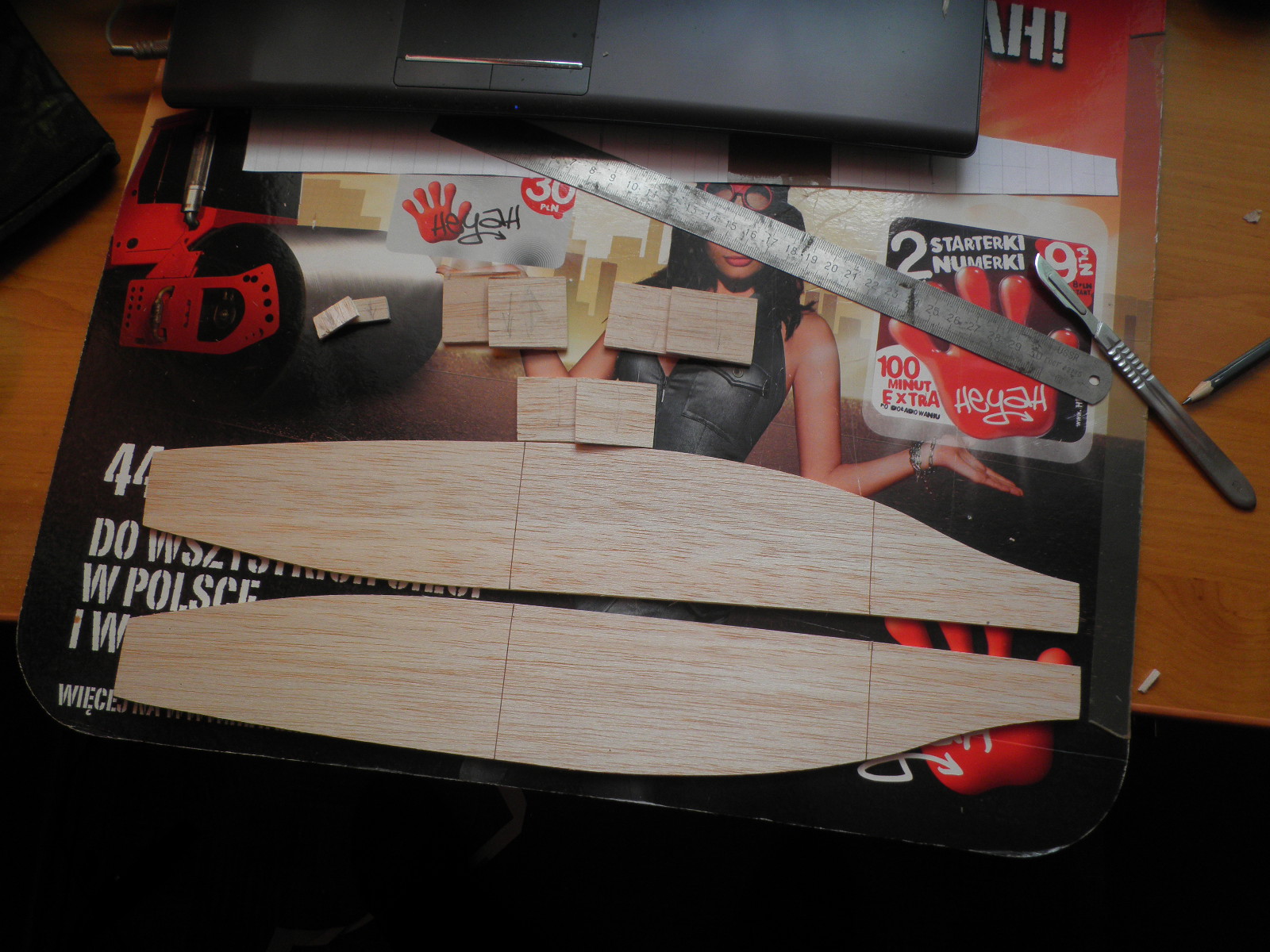 Kolejną nowością jest to że kadłub został wycięty z... twardej balsy. Zorientowałem się dopiero jak wziąłem inny kawałek o tej samej grubości :)