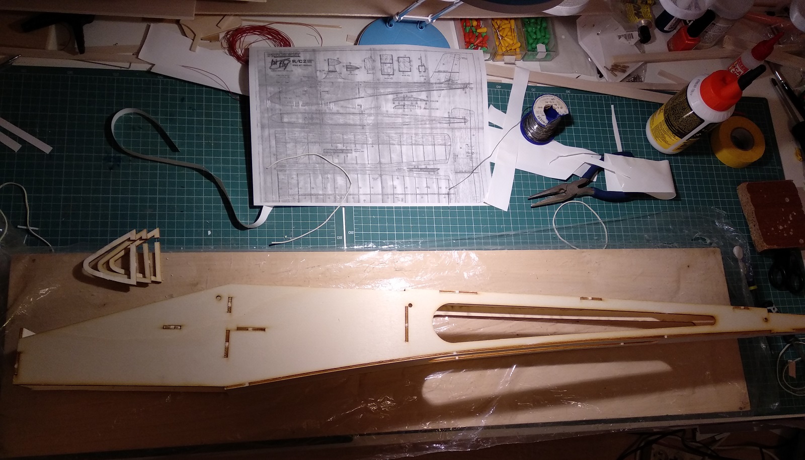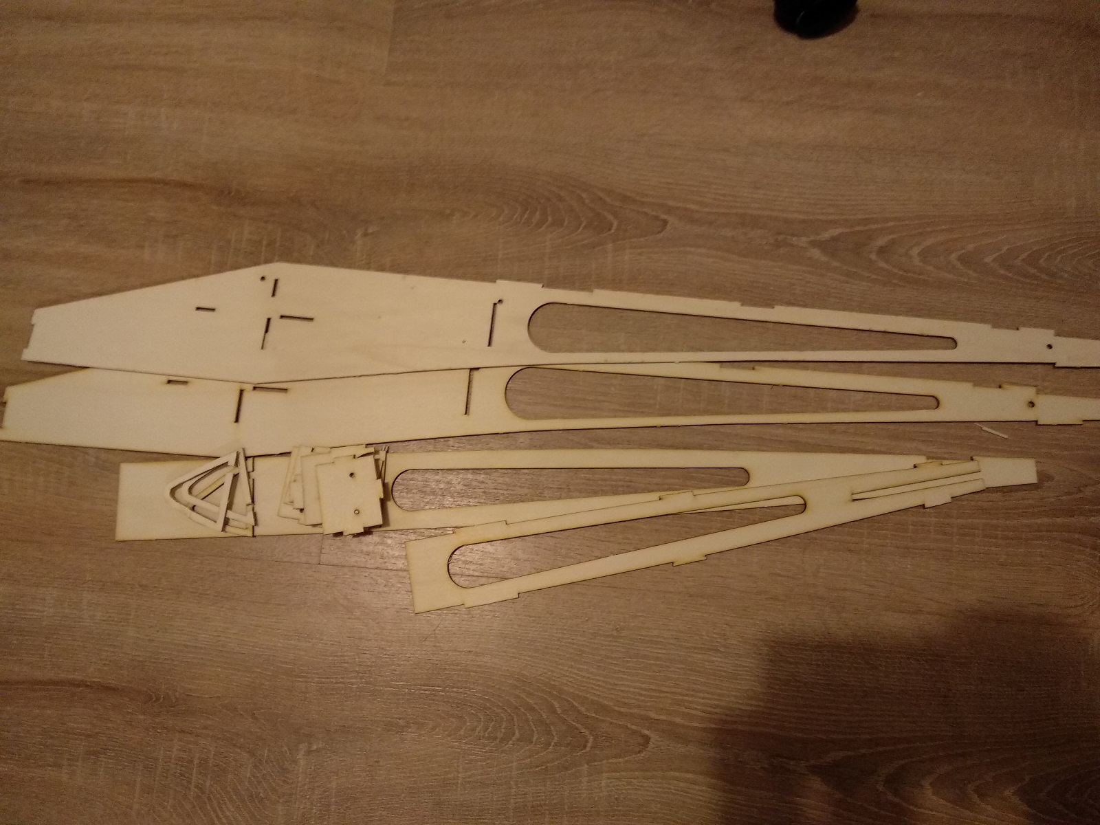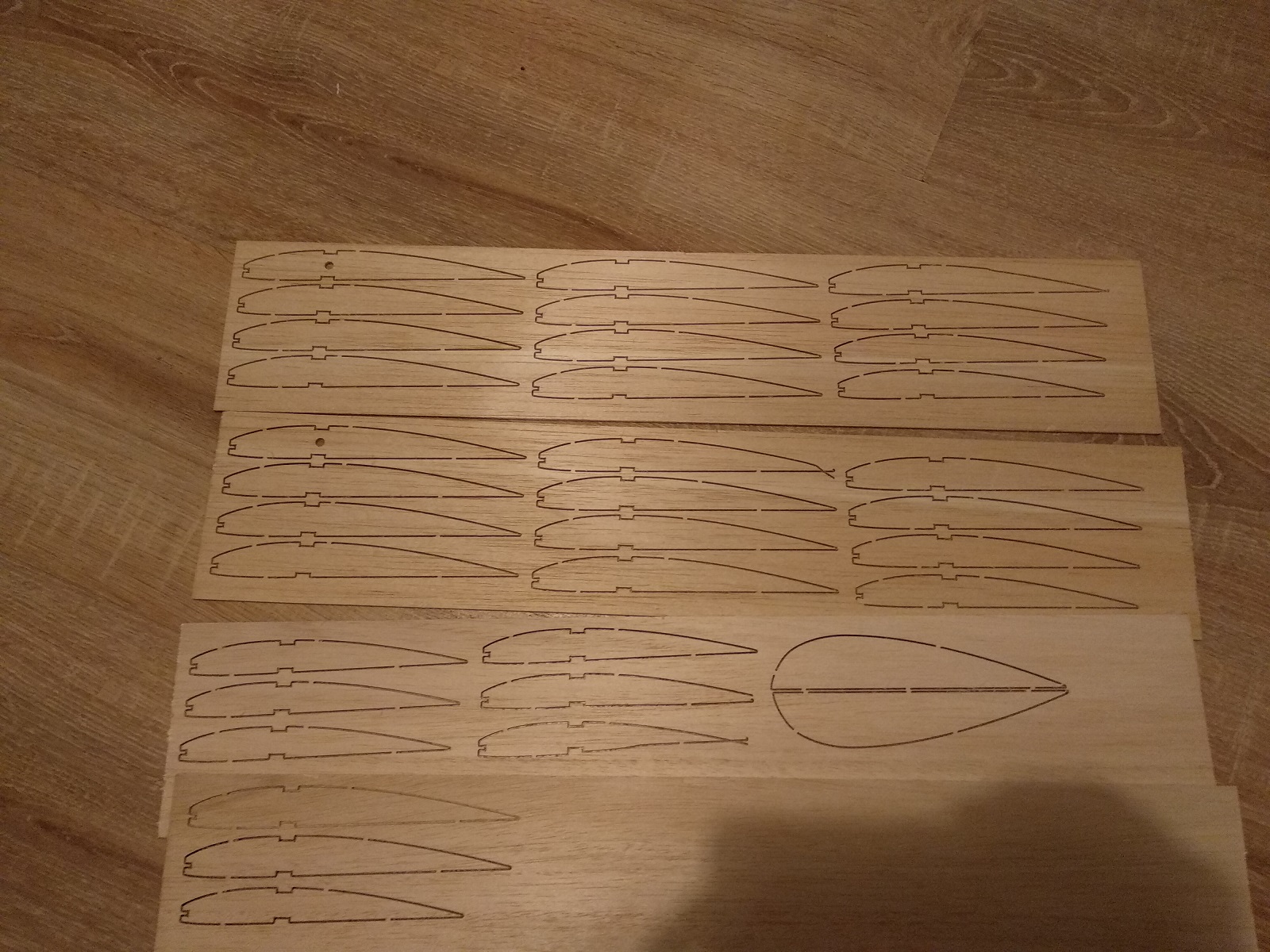 Plany przerysowałem i przygotowałem formatki, kadłub poszedł na laser, żeberka na frezarkę.