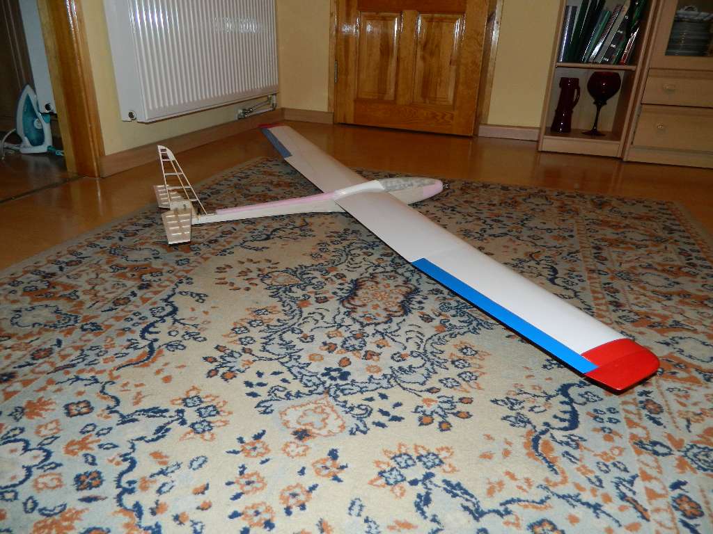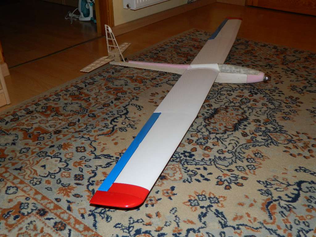 Skrzydła na profilu S3021 prostokątno-trapezowe, rozpiętość 220 cm, usterzenie pisalem jakie, silnik Silver Blue 2830 750 kV / ten od Grzegorza :) /, lub zamiennie Tur 2836 1000 kV, pakiet 3S 2,2 A, śmigło 10x6 /9x6/ kołpak turbo 40 mm, regulator 25A lub 40A.