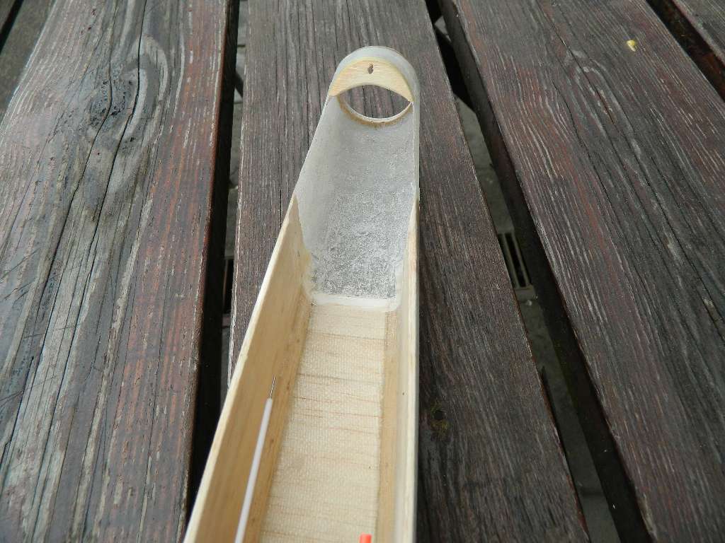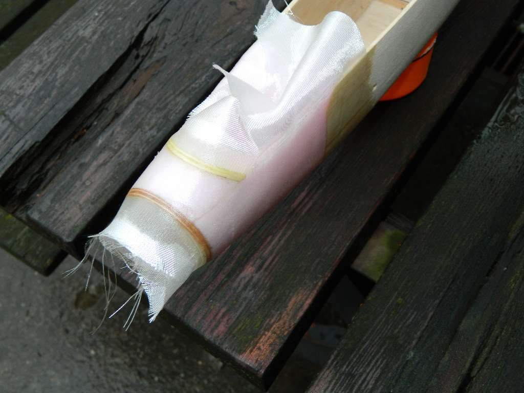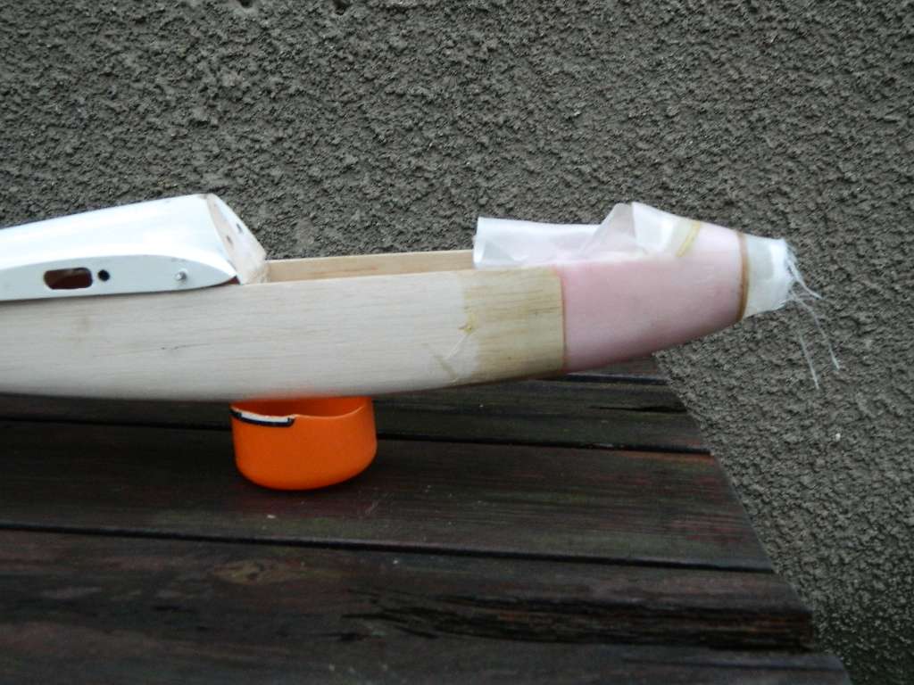 Styro wypłukane. Zdecydowanie lepiej płucze się nitro niż acetonem, to tak na marginesie. Myślę, że zdjęcia wszystko wyjaśniają. Po płukance i osuszeniu, wręga technologiczna została zcieniona do 1,5-2 mm szerokości, wszystkie nadlewki żywicy zeskrobane. Teraz od wewnątrz zalaminuję 2-3 warstwy tkaniny. Obecnie przód modelu jest w miarę sztywny, ale moim zdaniem za mało. Na zdjęciach widać fazę, jaką zostawiłem od wewnątrz na boczkach balsowych, na niej będzie przewiązany laminat, miejsca dość.