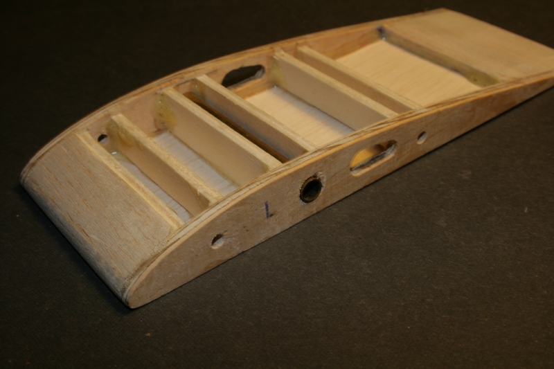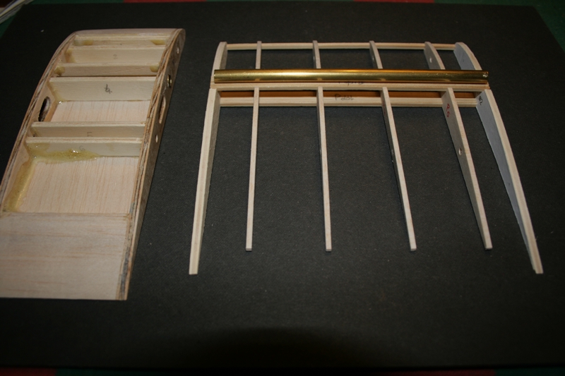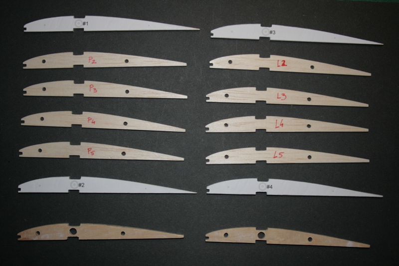 A więc tak: Wyciąłem wszystkie żeberka centropłata (balsa 2mm, skrajne sklejka 3 mm). Skrajne jeszcze nie mają otworów. Oczywiście te balsowe będą rozcięte. Z widocznych na fotografii dźwigarów zrobię skrzynki na mosiężne rurki kryjące stalowy bagnet. Pracuję obecnie nad krawędzią natarcia. Teraz jest tylko listwa 2x2 mm.