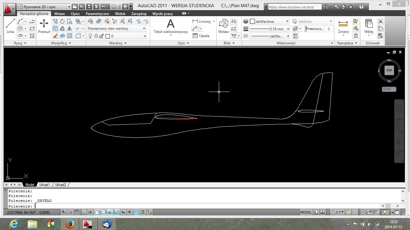 Troszeczkę w wolnych chwilach "dopieszczałem" kadłub 47-emki......dobrą metodą jest zapomnieć o projekcie i za kilka dni sobie przypomnieć, otworzyć pliki i spojrzeć świeżym okiem ;) .....Wydłużyłem przód kadłuba o ok 7 cm i belkę ogonową o ok 6 cm, posiedziałem nad krzywiznami kadłuba i pionowego, efekt na załączonym zrzucie z ekranu.....Czy to wersja końcowa? Zobaczymy ;)