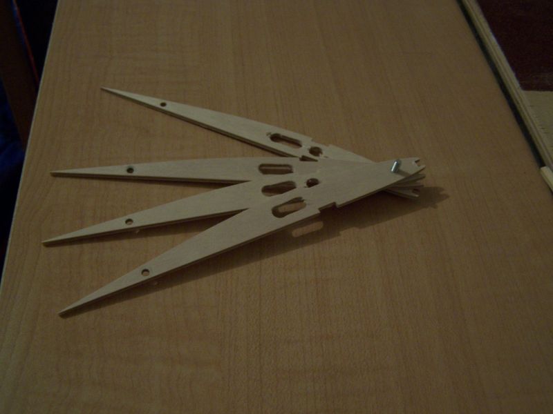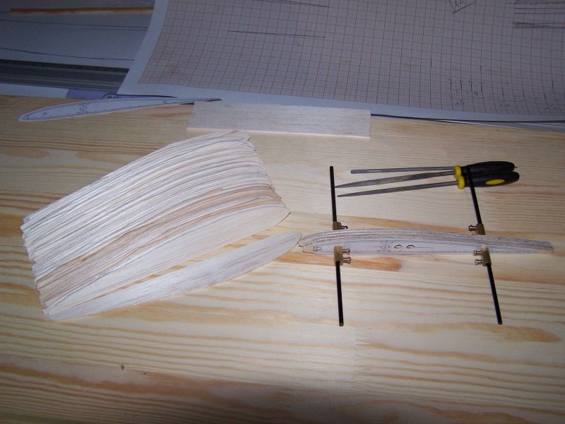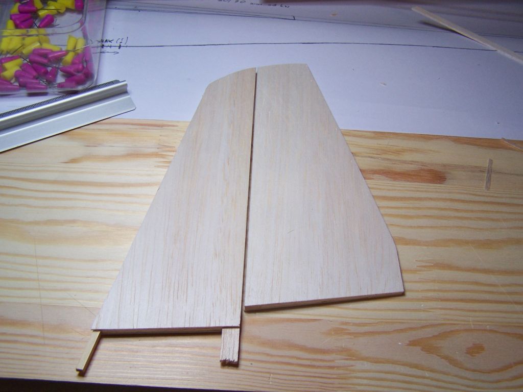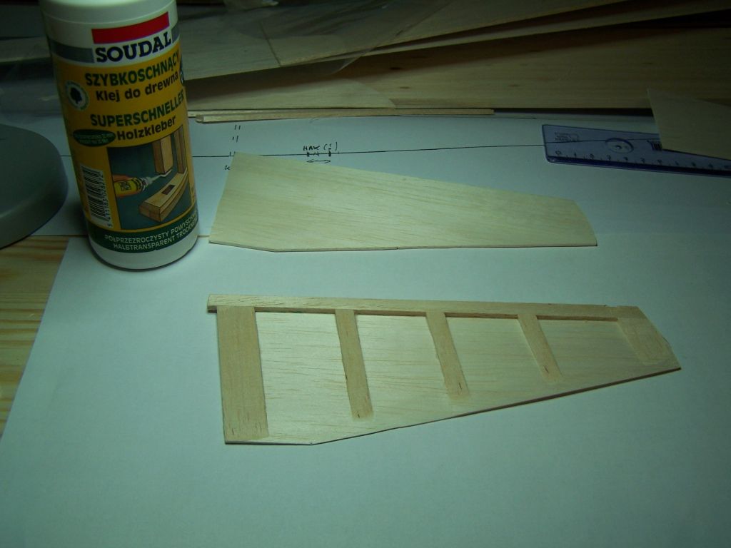 Na początek ster kierunku, pokrycie balsa 1,5 mm wzmocnienia balsa 3mm, ścięte w klin.