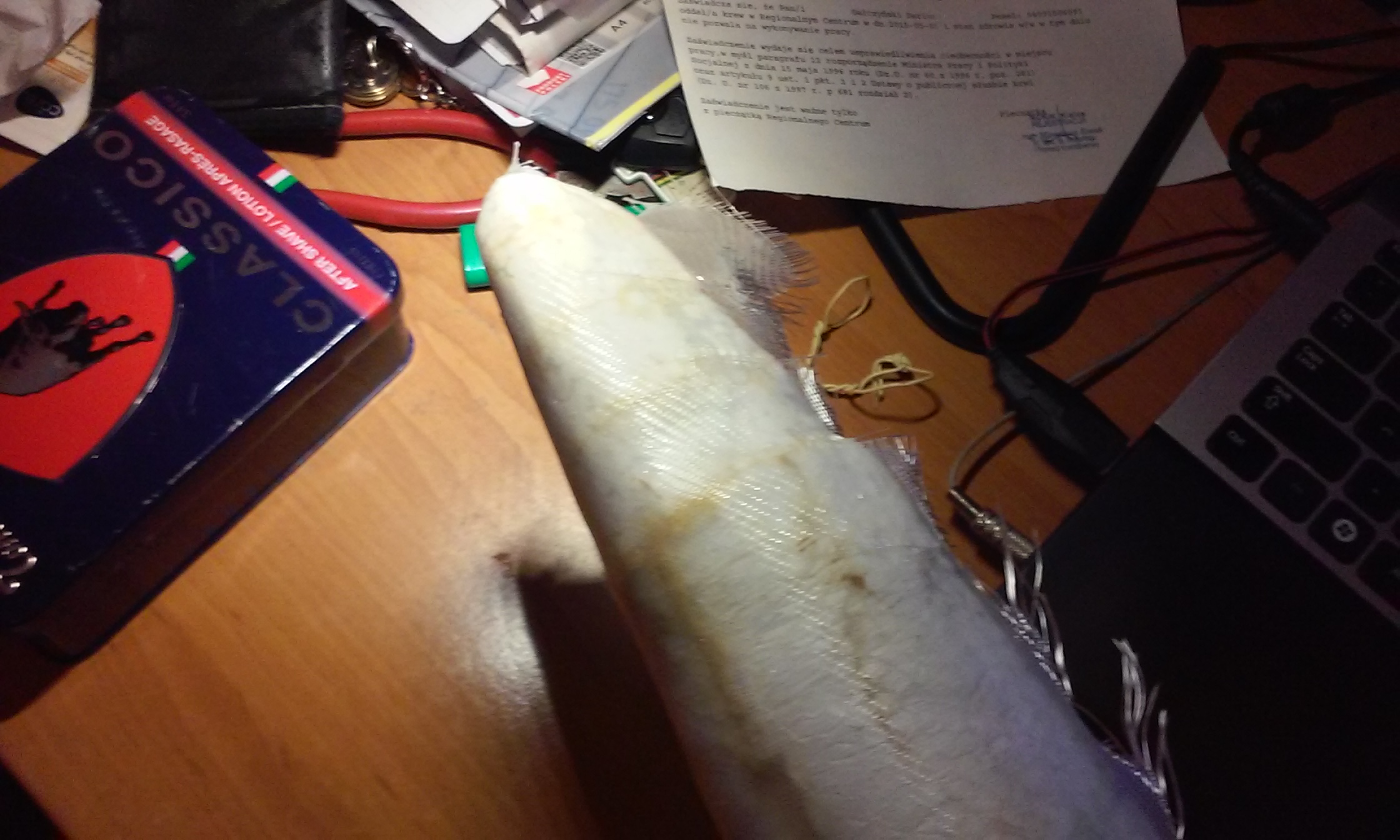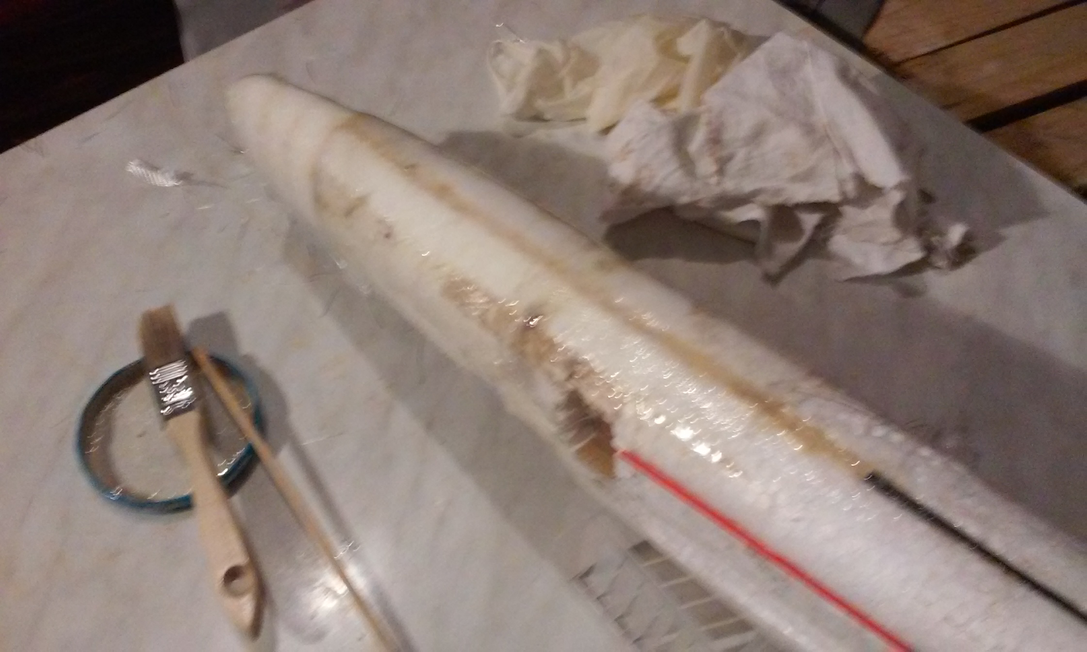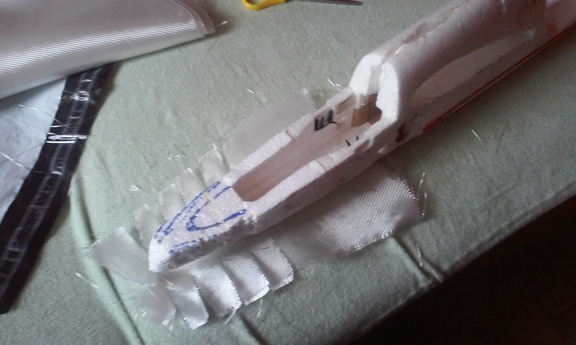 Dalej mi brakuje przedniej części kadłuba, w ruch poszła tkanina 160g/m^2 oraz epidian 53 + utw. Z1. Zakładałem, że jeden kawałek odpowiednio uformowanej tkaniny wystarczy aby kadłub był wystarczająco wytrzymały (część styropianu zostanie później usunięta). Po zżelowaniu dochodzę do wniosku że jedna warstwa to za mało, w miejscach nacięć konstrukcja jest zbyt osłabiona i konieczne będzie nałożenie drugiej warstwy. Po rozrobieniu żywicy postanawiam zalaminować jedną łatą z tkaniny tam gdzie robiłem nacięcia, dwie małe łatki poszły jeszcze na dziób oraz trzecia łatka poszła jako dodatkowe przedłużenie wzmocnienie spodu kadłuba. Postanowiłem również zalać żywicą całkowicie pręt węglowy wklejony od spodu