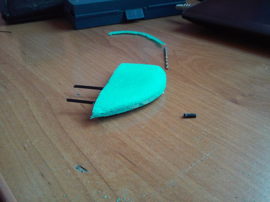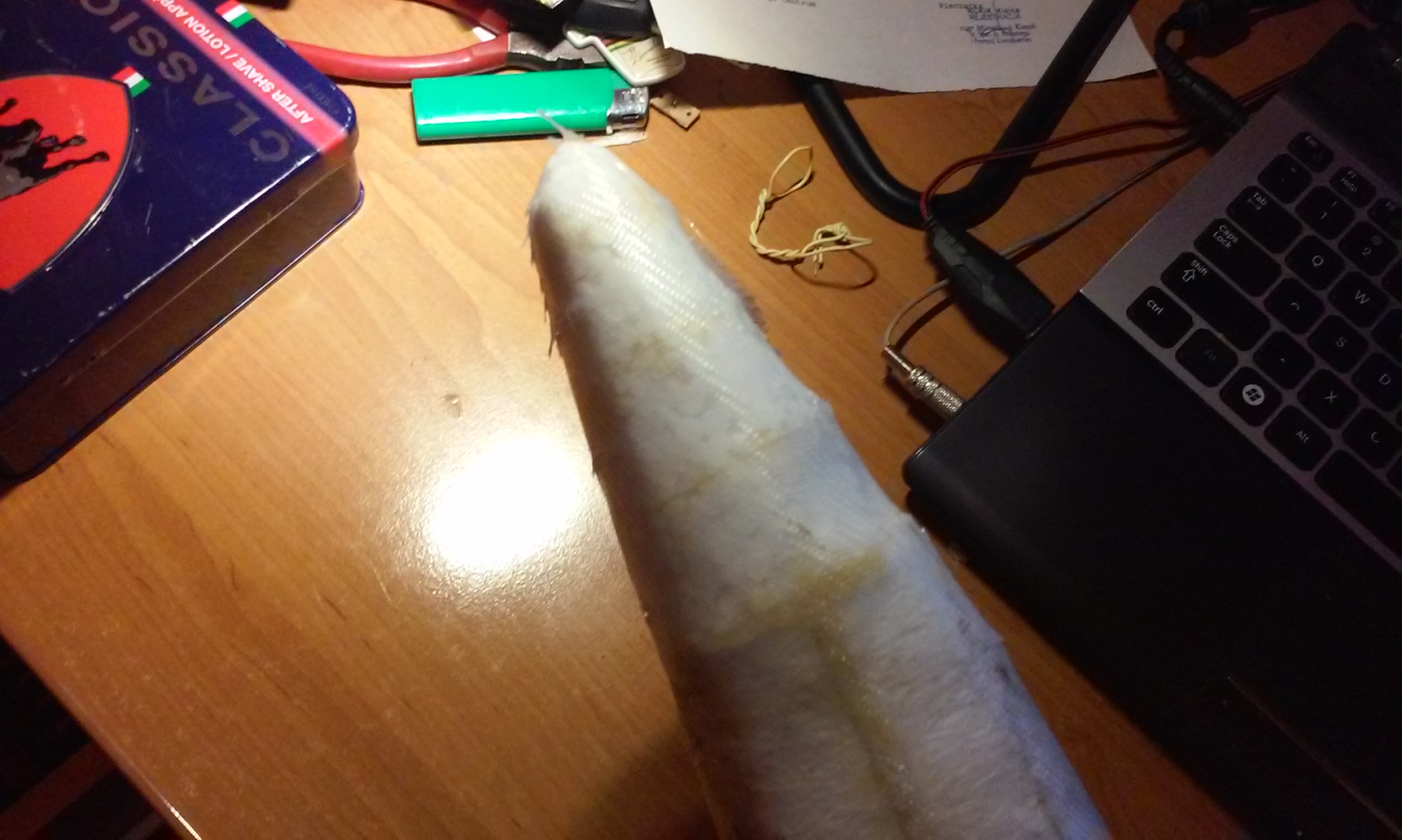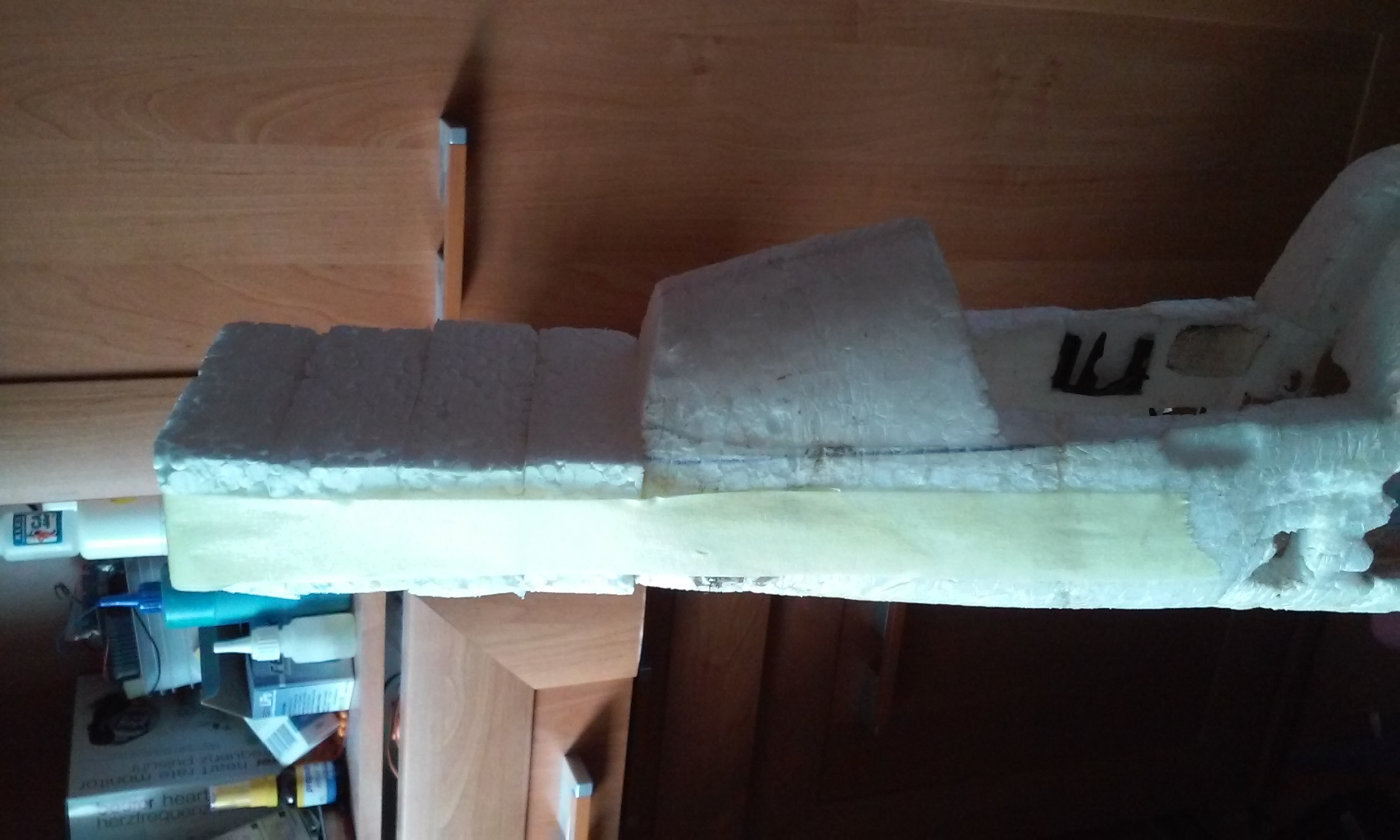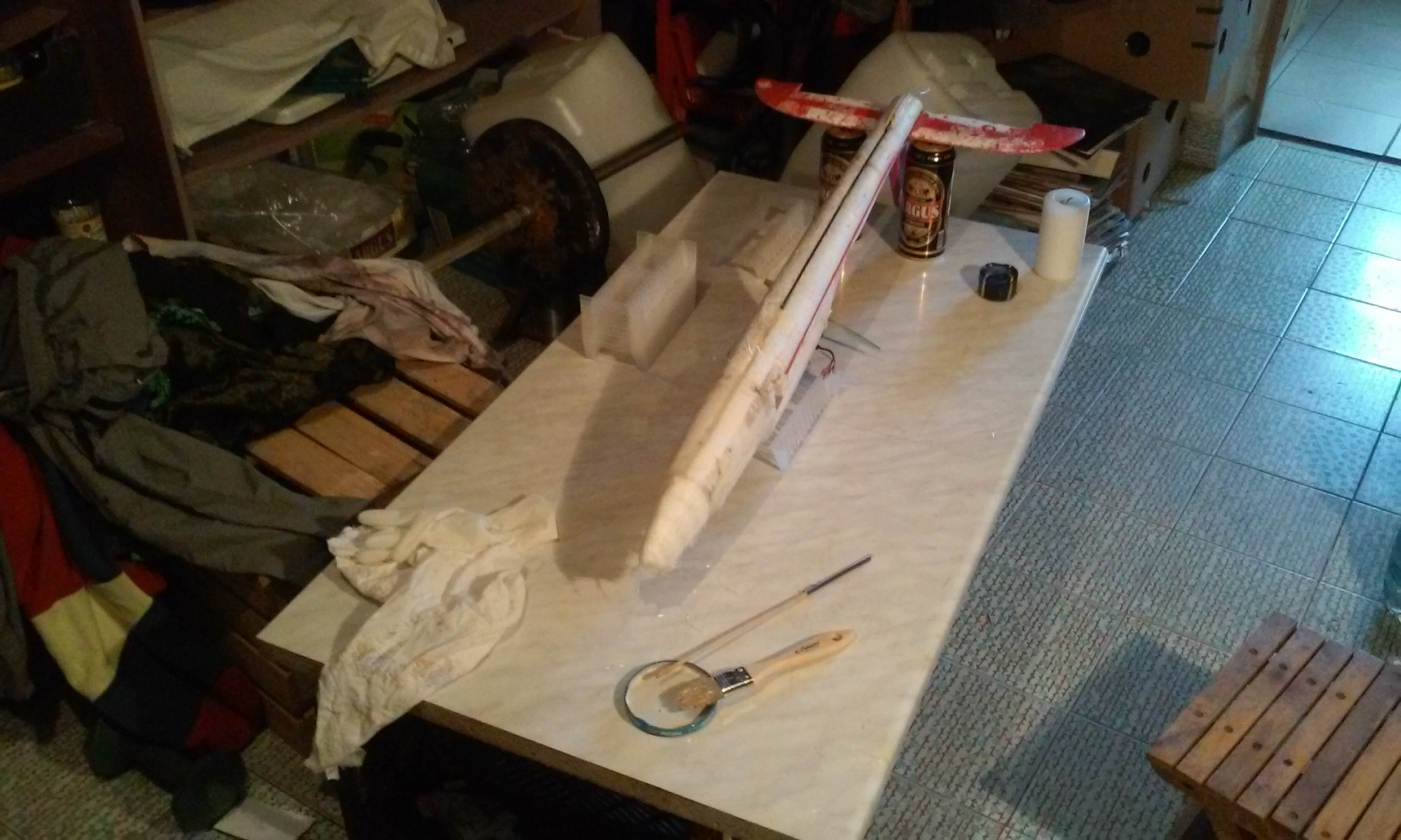 Dalej mi brakuje przedniej części kadłuba, w ruch poszła tkanina 160g/m^2 oraz epidian 53 + utw. Z1. Zakładałem, że jeden kawałek odpowiednio uformowanej tkaniny wystarczy aby kadłub był wystarczająco wytrzymały (część styropianu zostanie później usunięta). Po zżelowaniu dochodzę do wniosku że jedna warstwa to za mało, w miejscach nacięć konstrukcja jest zbyt osłabiona i konieczne będzie nałożenie drugiej warstwy. Po rozrobieniu żywicy postanawiam zalaminować jedną łatą z tkaniny tam gdzie robiłem nacięcia, dwie małe łatki poszły jeszcze na dziób oraz trzecia łatka poszła jako dodatkowe przedłużenie wzmocnienie spodu kadłuba. Postanowiłem również zalać żywicą całkowicie pręt węglowy wklejony od spodu