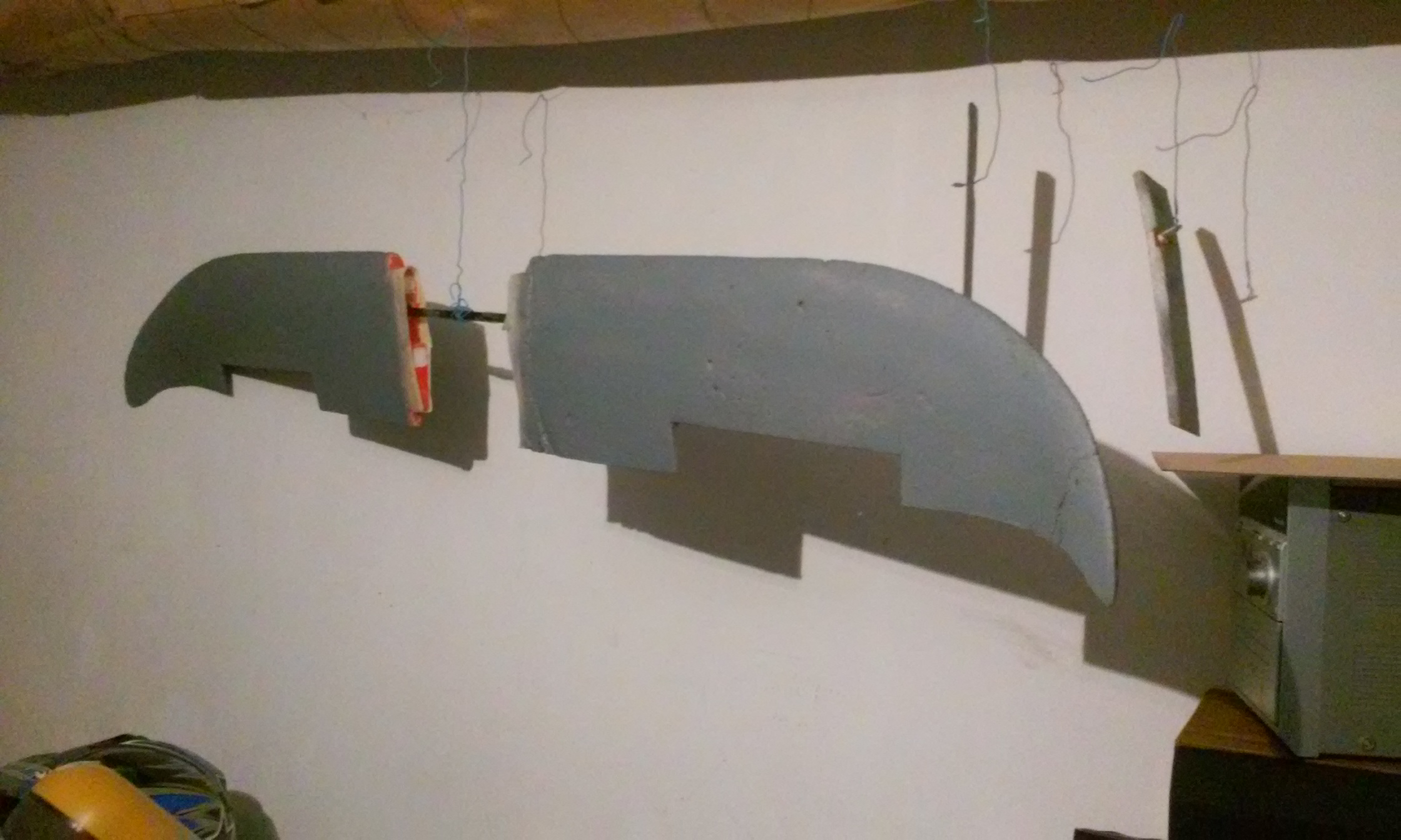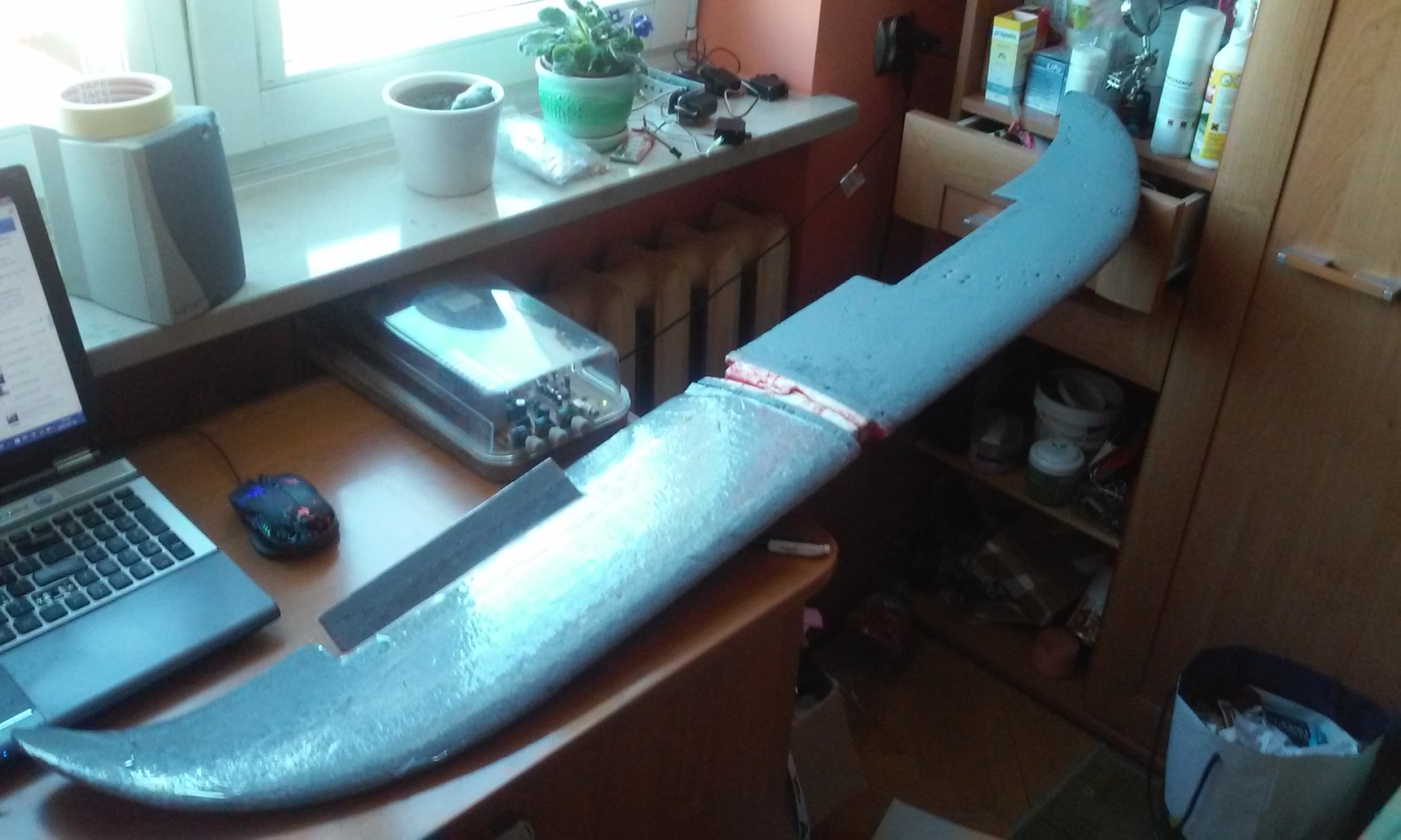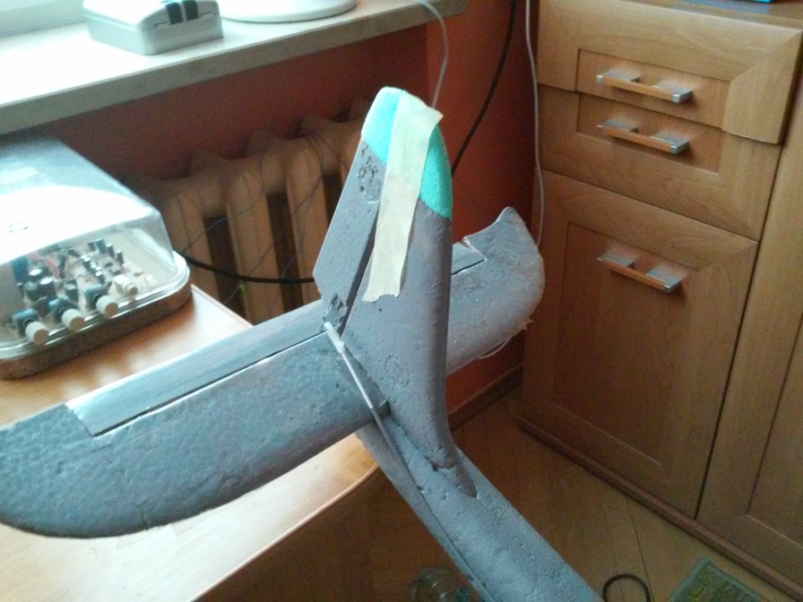 Skrzydła pozbawione farby i taśmy wyglądem błagają o dobicie strzałem w potylice, zamiast tego dostają nowy kolor ( szary, ot tak jak typowe UAVO ) i nowe pokrycie w celu zakrycia dziur po przygodach, za pokrycie służy bezbarwna taśma, klejona na zakładkę, lotki też wklejone na taśmę. Najwięcej problemu sprawiło oklejanie owali ( uszy ), mnóstwo nacięć, starania się a wyszło przeciętnie, no trudno
