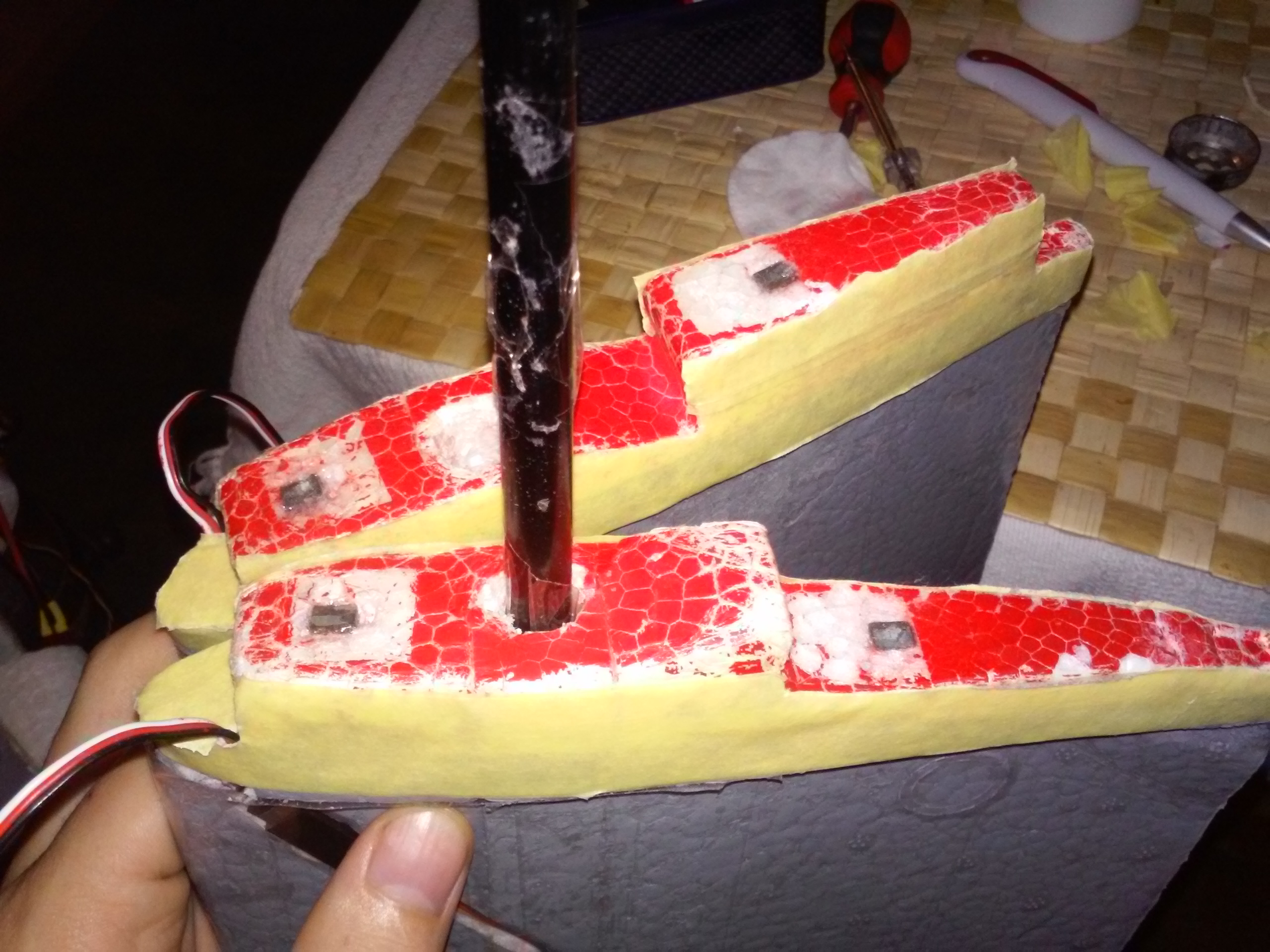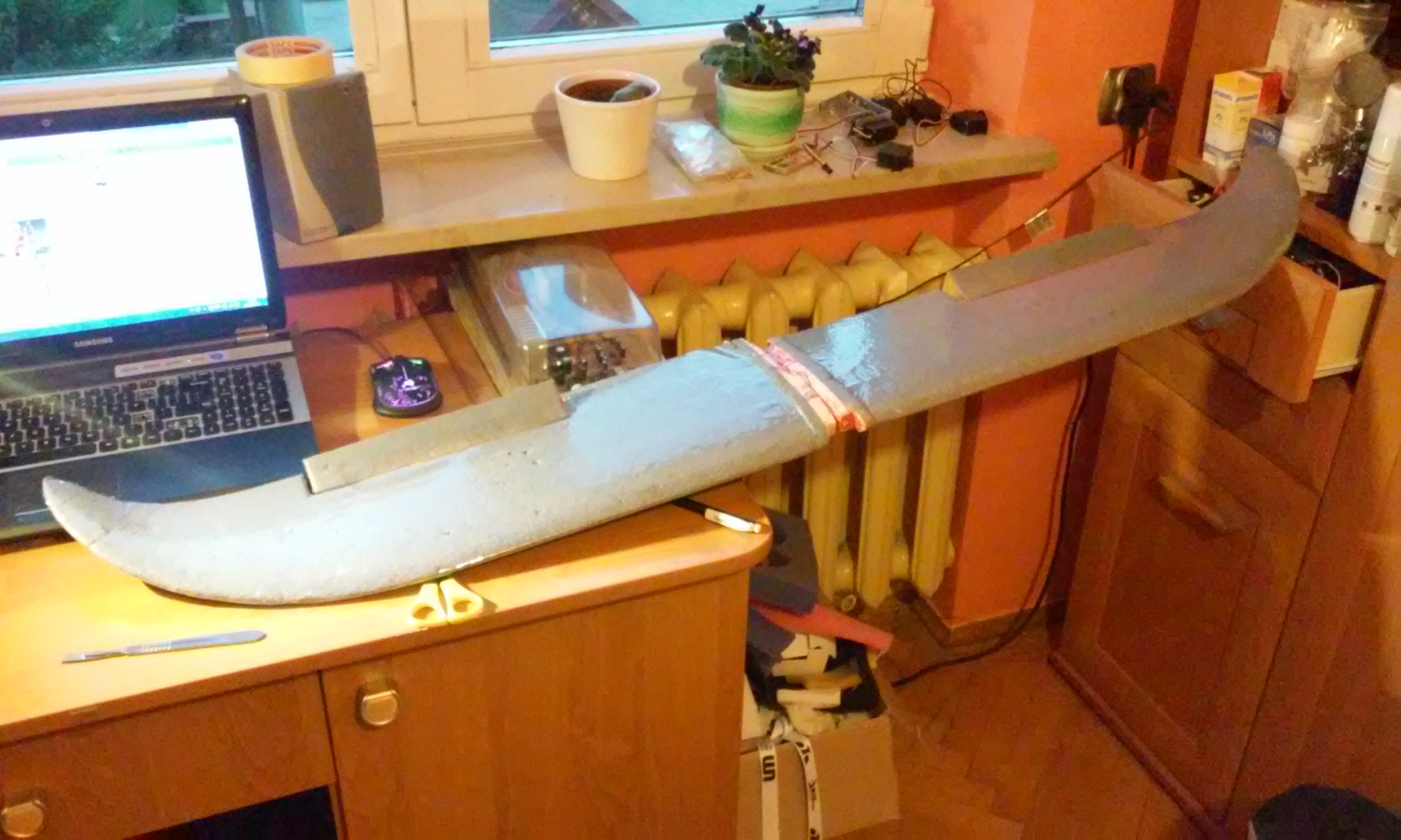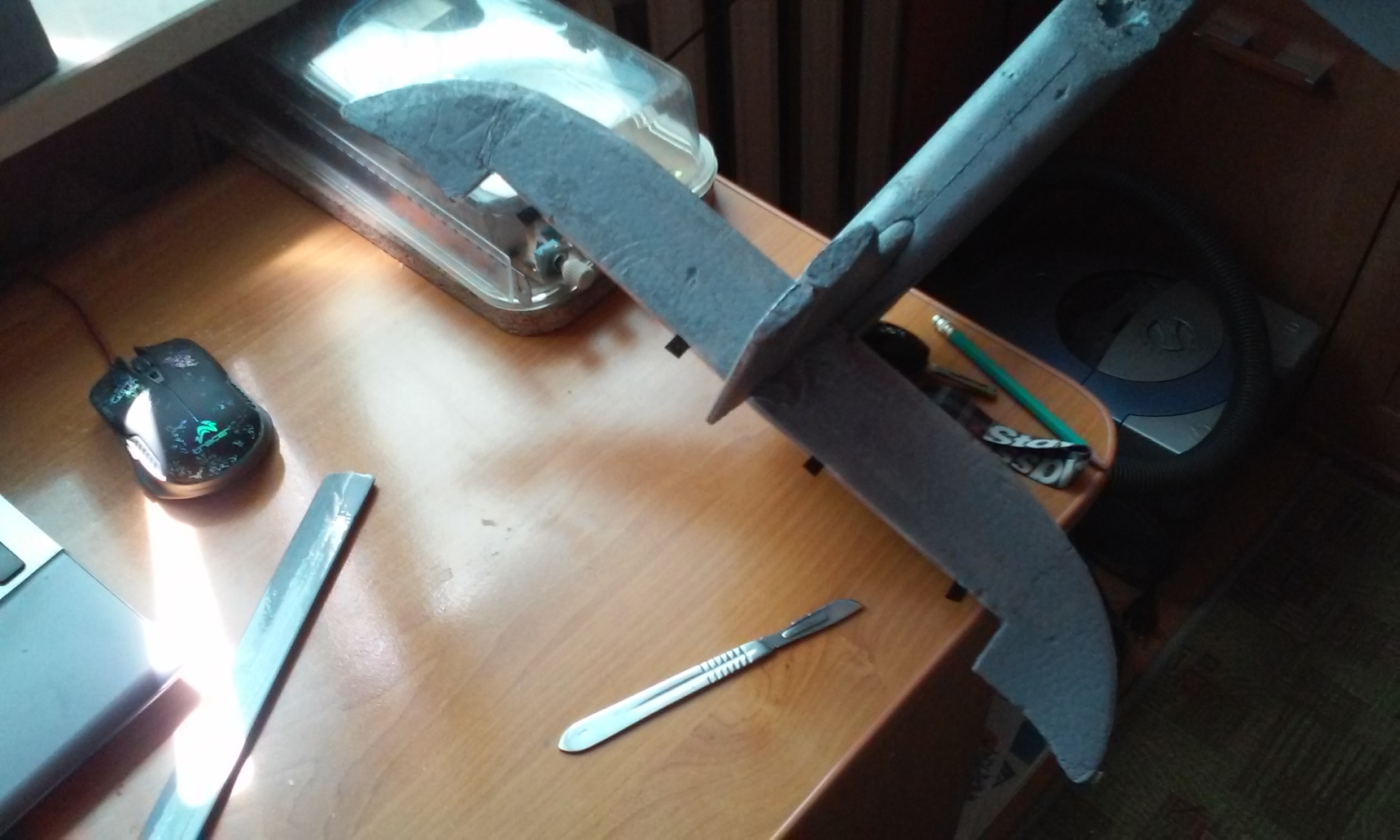 Skrzydła pozbawione farby i taśmy wyglądem błagają o dobicie strzałem w potylice, zamiast tego dostają nowy kolor ( szary, ot tak jak typowe UAVO ) i nowe pokrycie w celu zakrycia dziur po przygodach, za pokrycie służy bezbarwna taśma, klejona na zakładkę, lotki też wklejone na taśmę. Najwięcej problemu sprawiło oklejanie owali ( uszy ), mnóstwo nacięć, starania się a wyszło przeciętnie, no trudno