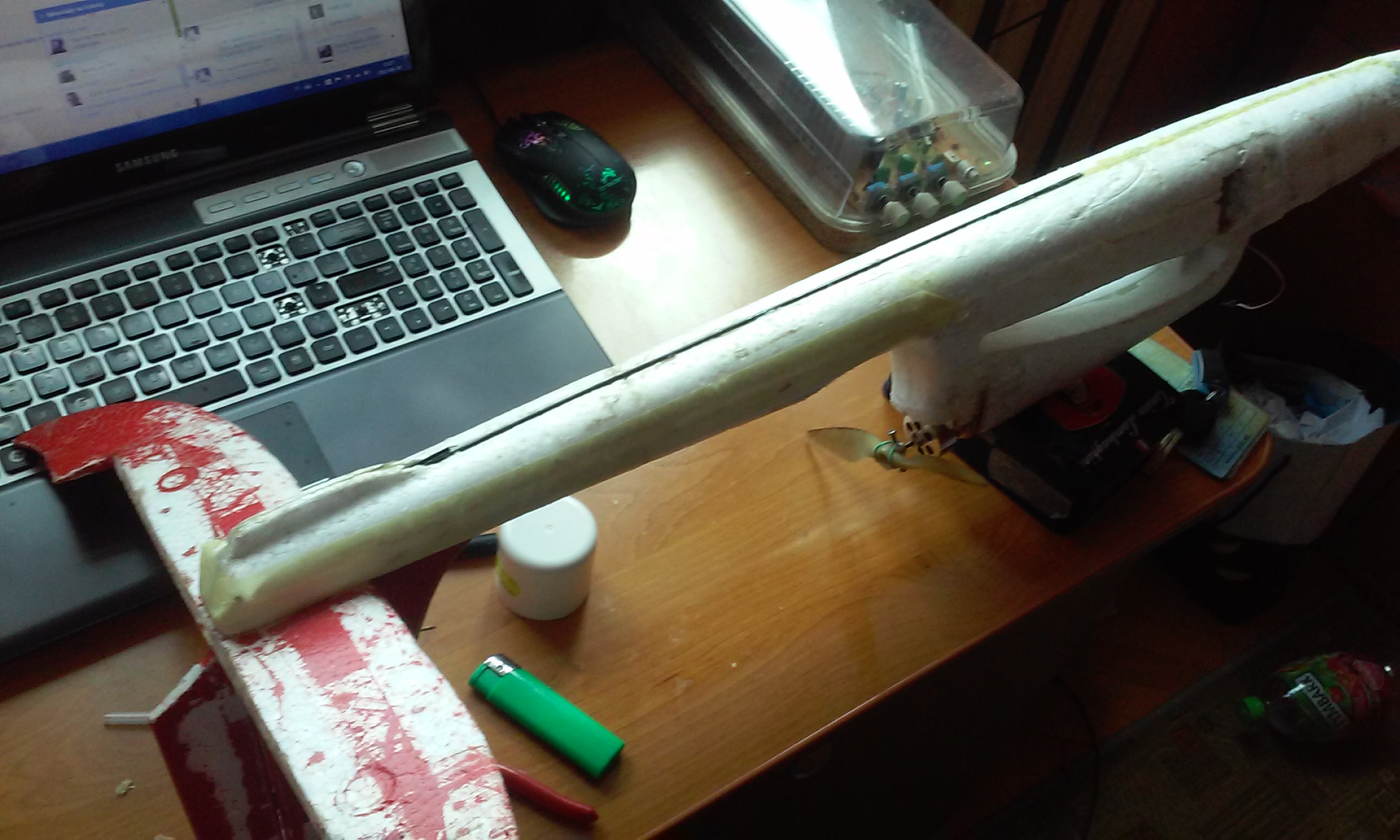 Stan był opłakany, w zasadzie nadawał się jedynie tam skąd go wyciągnąłem, czyli na śmietnik. Zamiast bowdenów były słomki z miedzianym drutem, dziób ucięty, silnik wyrwany, brak statecznika poziomego, skrzywiony ogon, pocięty kadłub, cały zakurzony, poklejony taśmą, pęknięcia w wielu miejscach ogólna sodoma i gomora. Powstaje jak Fenix z popiołów.