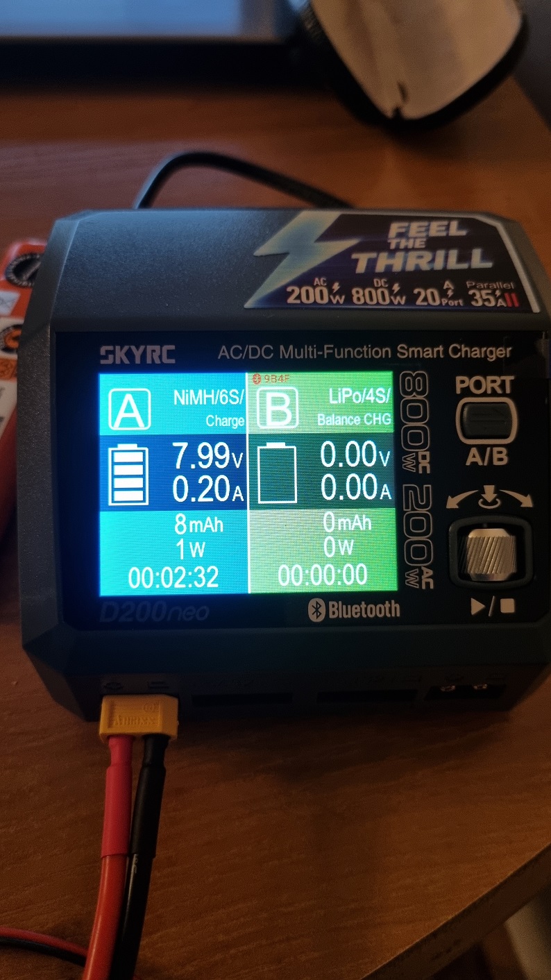 Zakupiłem ładowarkę SkyRC D200NEO. Przez kilkanaście lat używałem Sharka 20 która ma tam swoje ograniczenia. Jedak wracając do modelarstwa postanowiłem kupić jakieś lepsze urządzenie ale za kwotę w granicach rozsądku. Padło na Sky RC D200 NEO. Ogólne wrażenia w miarę dobre. Czuć że to produkcja chińska ale użytkownicy chwalą ten sprzęt w przeciwieństwie do Q200 które lubią się "utleniać" Parametrów nie będę przytaczał bo dokładniejsze opisy są w internecie. Tyle co warto powiedzieć to że ładowarka ma dwa porty ładowania z których można pociągnąć łącznie 800W przy jej zasilaniu z wydajnego prądowo źródła DC ( przez tylne złącze zasilanai DC) Jeżeli zasilamy ładowarkę z sieci 230V AC to maksymalna łączna moc ładowania wynosi 200W. Dla mnie wystarczająco dużo. Wyświetlacz jest co prawda kolorowy ale odstaje jakością od przyjętych w obecnych czasach standardów. Po prostu patrząc pod różnymi kątami na LCD zmieniają się kolory a także spada czytelność. Przypomina mi się pierwszy laptop którego używałem w połowie lat 90-tych CompacQ 286. Miał dokładnie ten sam problem tyle tylko że jego monitor był monochromatyczny. Nie ma tragedii ale za to 125Euro to mogli by już wsadzić jakiś lepszy LCD. Druga toporna rzecz to pokrętło wyboru menu które dodatkowo się naciska w celu zatwierdzenia zmiany. Samo wciskanie wymaga trochę siły. Chociaż może jestem przewrażliwiony. Ładowarka nie mierzy cały czas rezystancji wewnętrznej akumulatora, podaje ją tylko przy rozpoczęciu ładowania i ta wartość zostaje do samego końca. Jest w menu opcja żeby sprawdzić rezystancję wewnętrzną pakietu w dowolnym stanie ale nie ma opcji żeby mieć aktualne rezystancje podczas ładowania. Dodam że mam najnowszą wersję firmware. Ładowarka może być sterowana przez BT i pokazywać aktulany stan ładowania, można zmienić program ładowania, ustawienia samej ładowarki itp. Działa to nawet dobrze. Jedak aktywne połączenie BT czasami uniemożliwia jakąkolwiek zmianę pracy ładowarki z jej lokalnych przycisków! Drugą opcją jest sterowanie z PC za pomocą portu USB i programu ChargerMaster. Niestety, ładowarka za nic nie chciała połączyć się z WIN8.1, problem wynika ze sterownika portu USB. SkyRC nie poradziło sobie najwyraźniej ze starszymi wersjami Windowsa albo nie wzięło ich pod uwagę. Sam program ChargerMaster to wg, mnie porażka. Po odpaleniu na Win10 i podłączeniu do ładowarki można nią sterować we wszystkich aspektach. Jednak co zauważyłem w chińskich sprzętach i co chyba jest standardem to fakt że po podłączeniu PC do danego urządzenia ( i sterowania przez PC) nie da się nic zmienić z lokalnej klawiatury ładowarki, to samo mam z genertorem sygnałowym UNI-T i z oscyloskopami Siglent i UNI-T. Kolejną wadą, dla mnie całkowicie dyskwalifikującą program jest to że jeżeli ładowarka jest w trakcie ładowania a my podepniemy do niej komputer to ładowarka nie wysyła swojego aktualnego stanu. Być może ja czegoś nie potrafię obsłużyć ale mój poczciwy SHARK 20 po podpięicu do komputera i odpaleniu programu odrazu wysyła wszystkie informacje o poziomie naładowania, prądach itp. Jednym słowem: zarówno obługa przez BT jak i PC pozostawia wiele do życzenia i jak dla mnie jest bardzo niedopracowana. Mimo wszystko jestem zadowolony z zakupu, mam nadzieję że nie padnie za szybko.