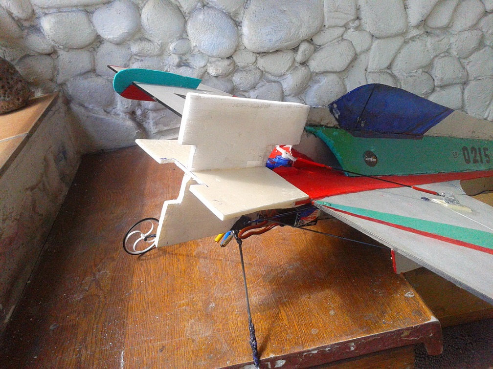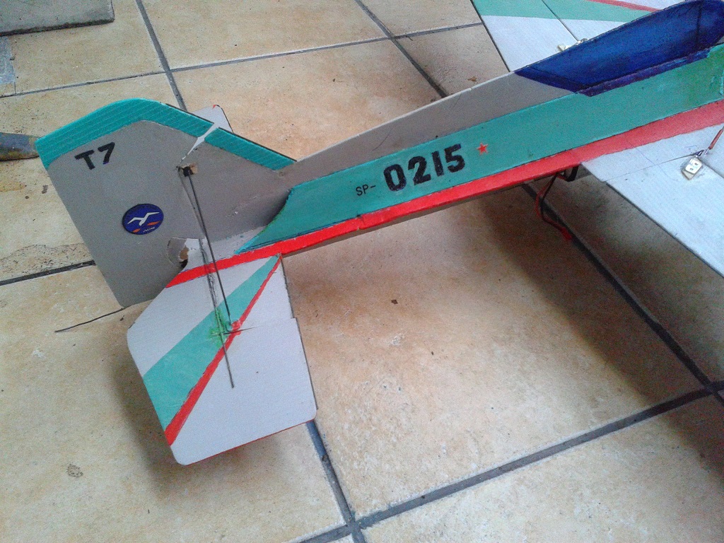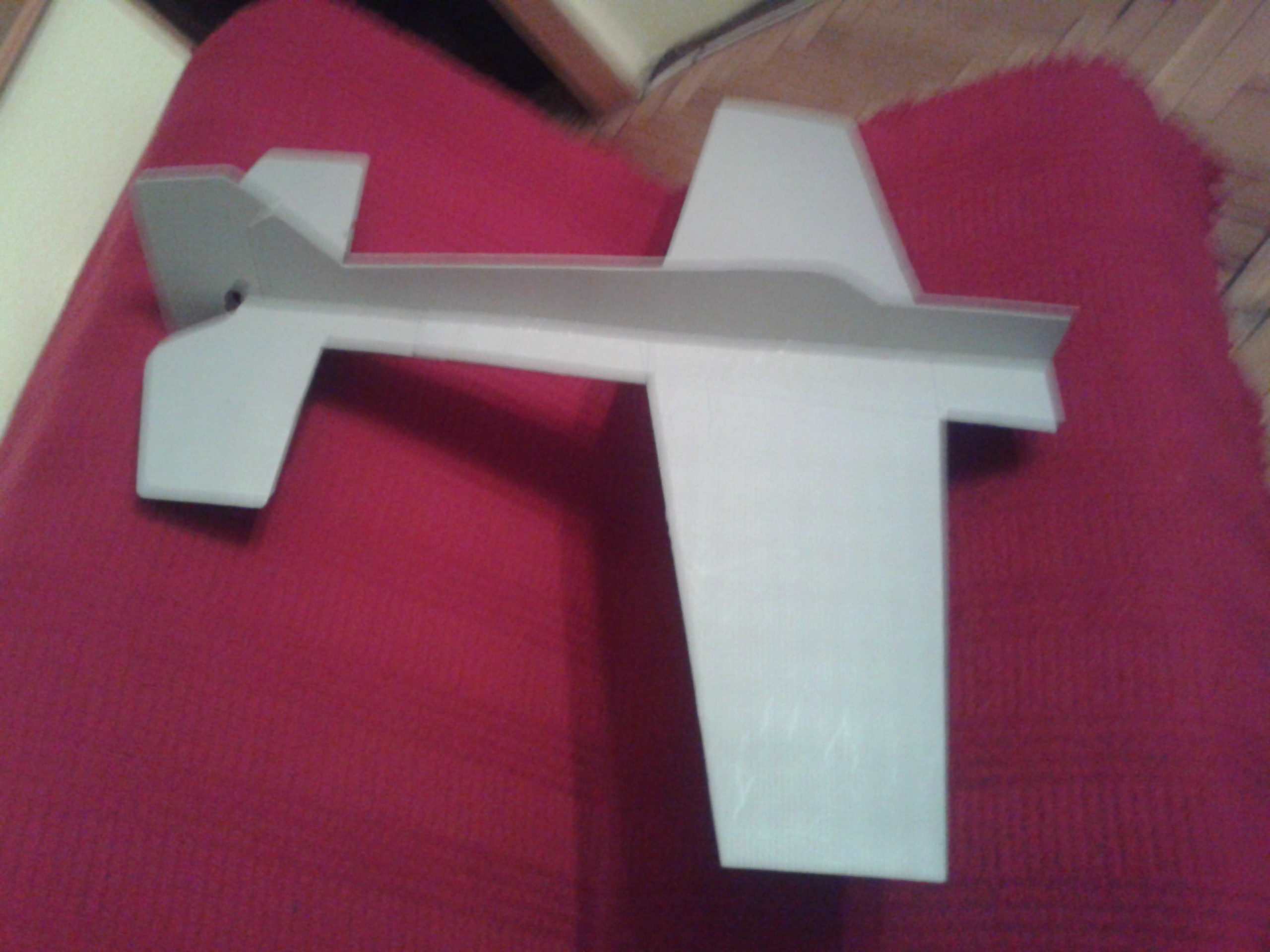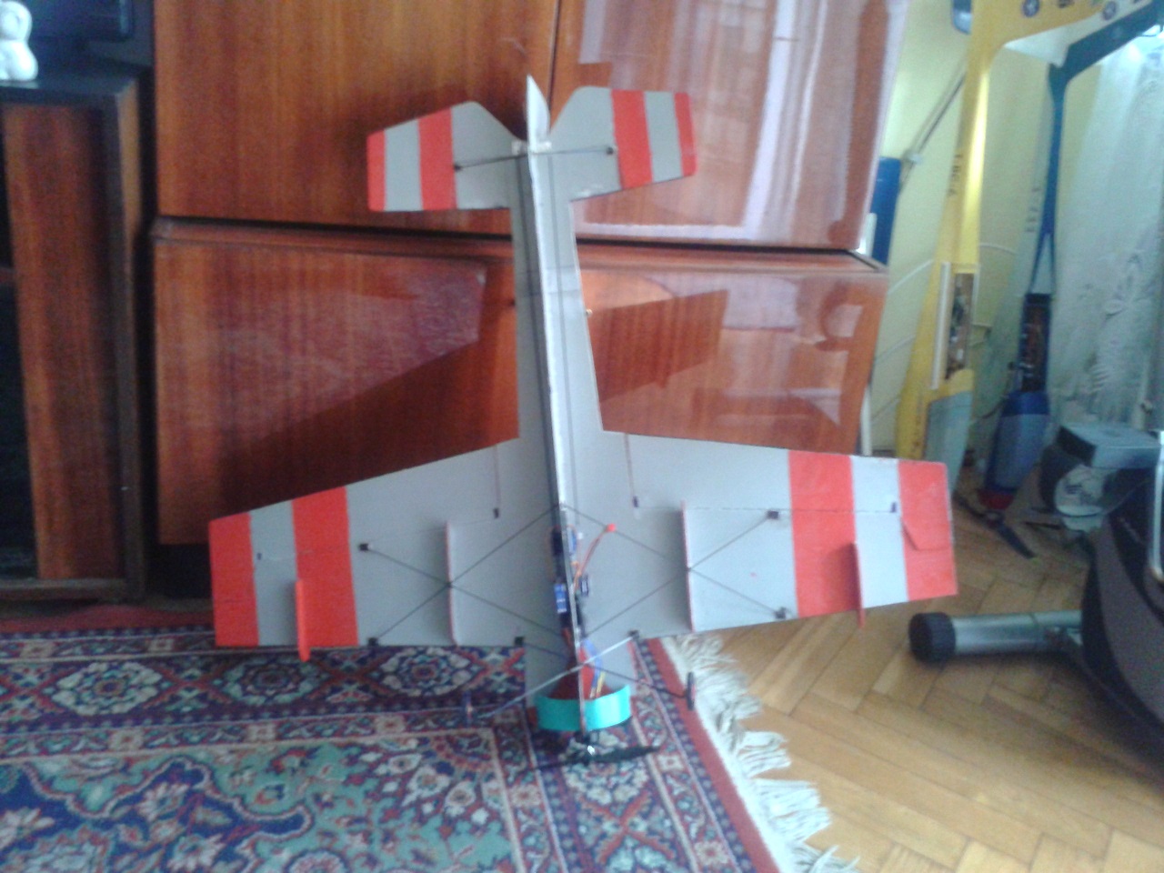 . Depron 3 mm jest tak kruchy i mało wytrzymały, ze w jednym locie po wykonaniu kilku ostrych pętli skrzydła przy kadłubie prawie się złożyły więc musiałem podkleić od spodu w części centralnej pianką EPP 5 mm. Teraz wytrzymałość jest wystarczająca. Zlikwidowałem tez podwozie, bo do niczego się nie nadawało, zwłaszcza, że latam w bardzo wysokiej "trawie". Wymieniłem też silnik na lżejszy E-max GT 2203. Model waży aż 200G więc do hali do której i tak nie mam dostępu nie bardzo się nadaje, ale na polu w sam raz. Fajne doświadczenie i zabawa, ale z motoszybowców nie zrezygnuje.