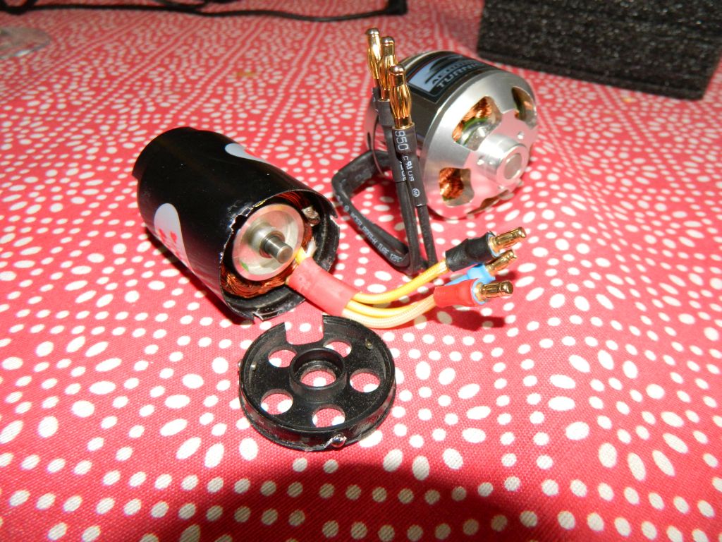 W krótkich przerwach podczas remontu klatki schodowej udało mi się naprawić Tukana. Uszkodzenia wydawały się poważne, jednak po dokładnej rewizji nie aż tak :) . Nie wdając się w szczegóły, samolocik naprawiony. Dzisiaj listonosz przyniósł paczuszkę z hk z nowym silnikiem, Turnigy SK3 5045 660kV. W porównaniu z Megą cięższy o ok 70 gram, będzie ciężko z wyważeniem ;) , no i o wiele większy. Zresztą możecie zobaczyć na zdjęciu. Na zdjęciu również widać uszkodzenia Megi, wyrwana z nitów tylna ściana obudowy silnika i rozwalone łożysko.