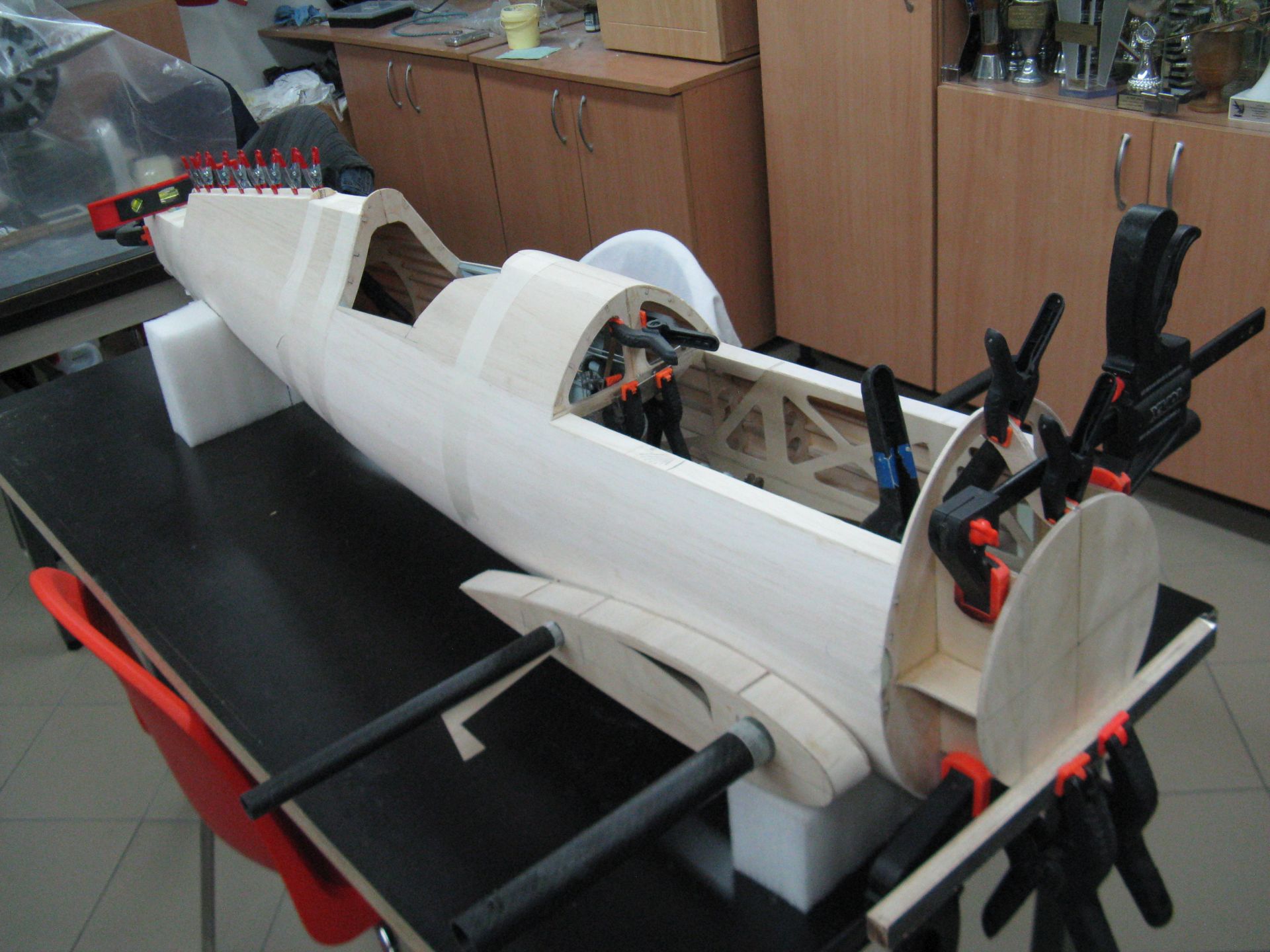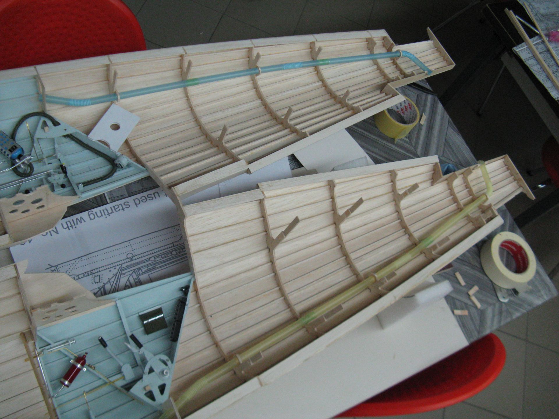 Prowadzenie przewodów od serw będzie w rurkach plastikowych. Skleiłem kadłub.