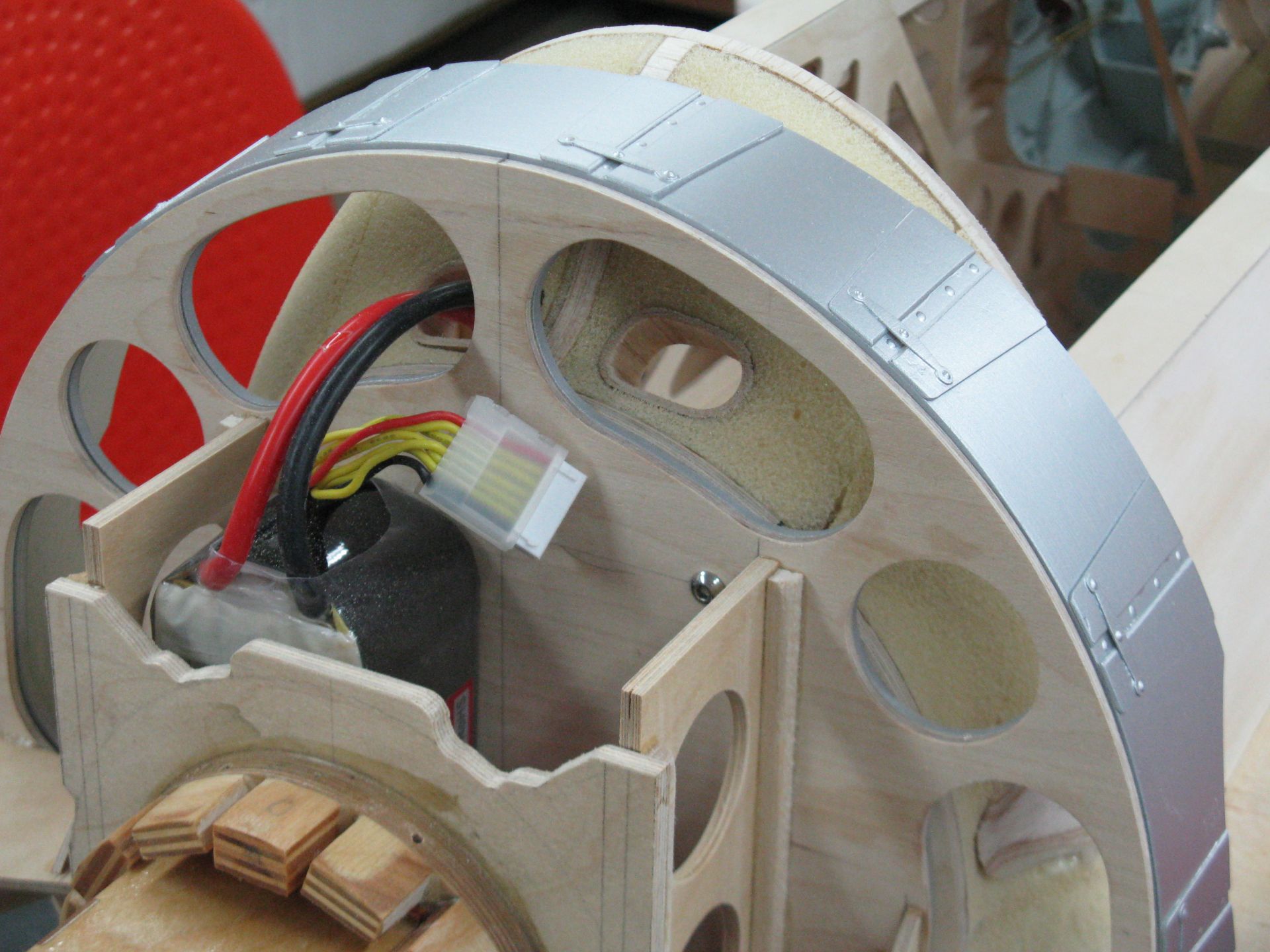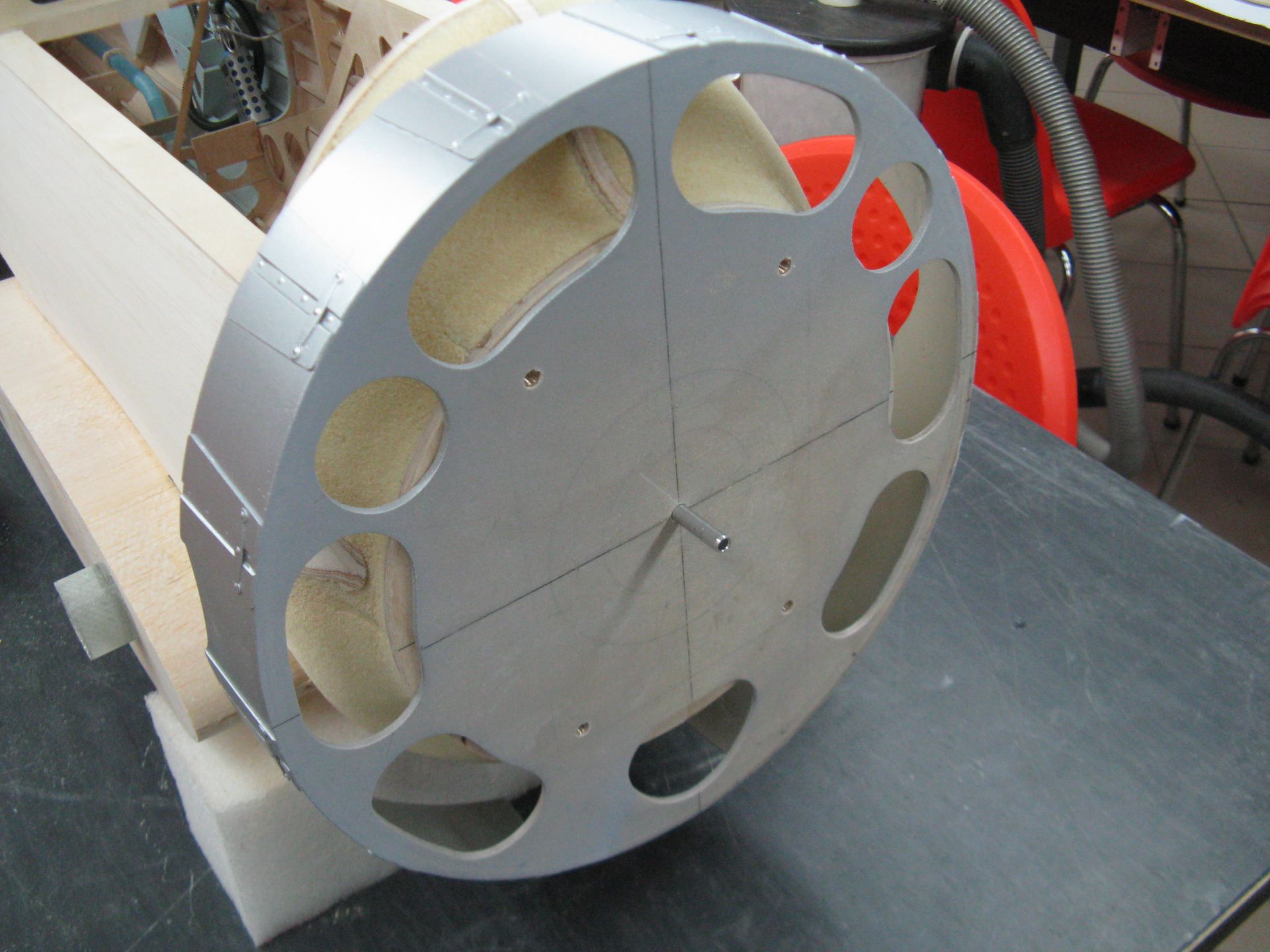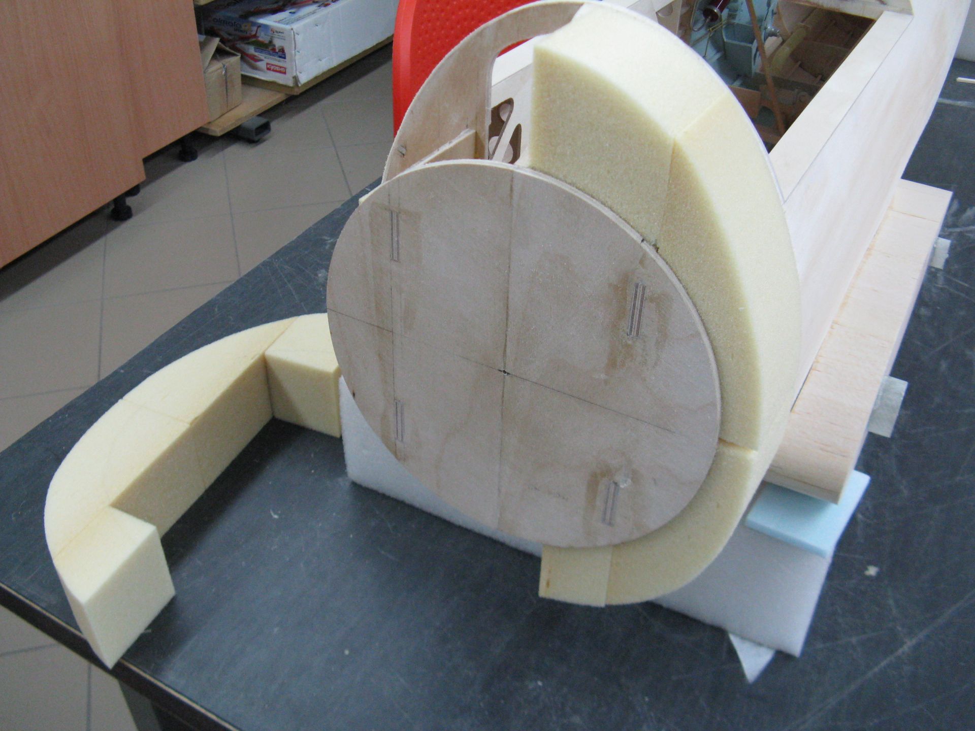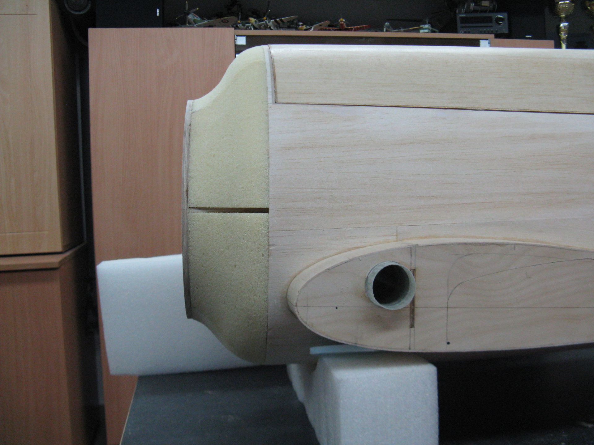 Kolejny krok, przejście przez kadłub dla kabli akumulatorów. Kopyto ze styroduru i nawinięte 2 warstwy balsy 1mm.
