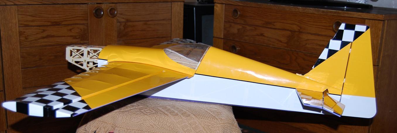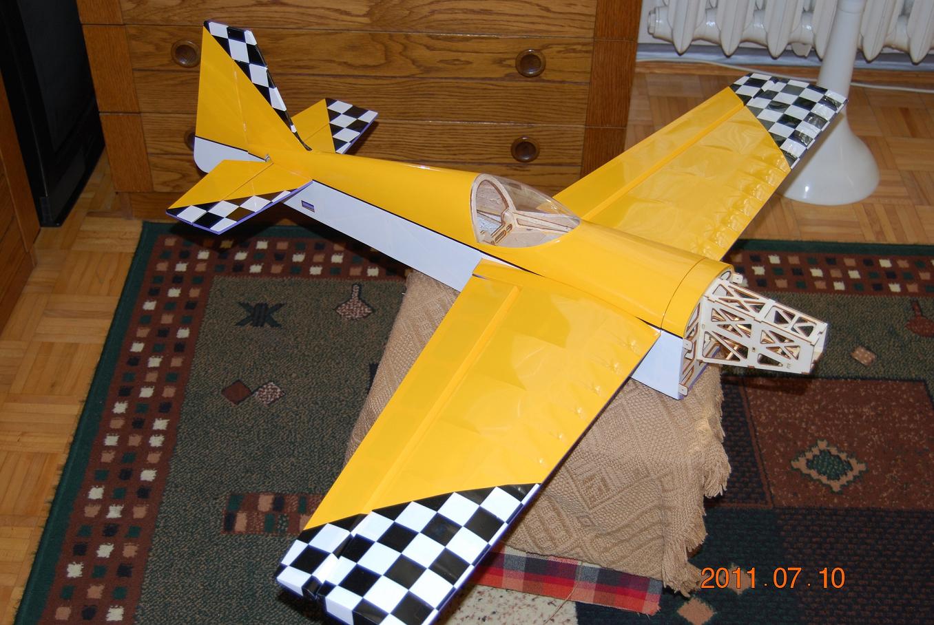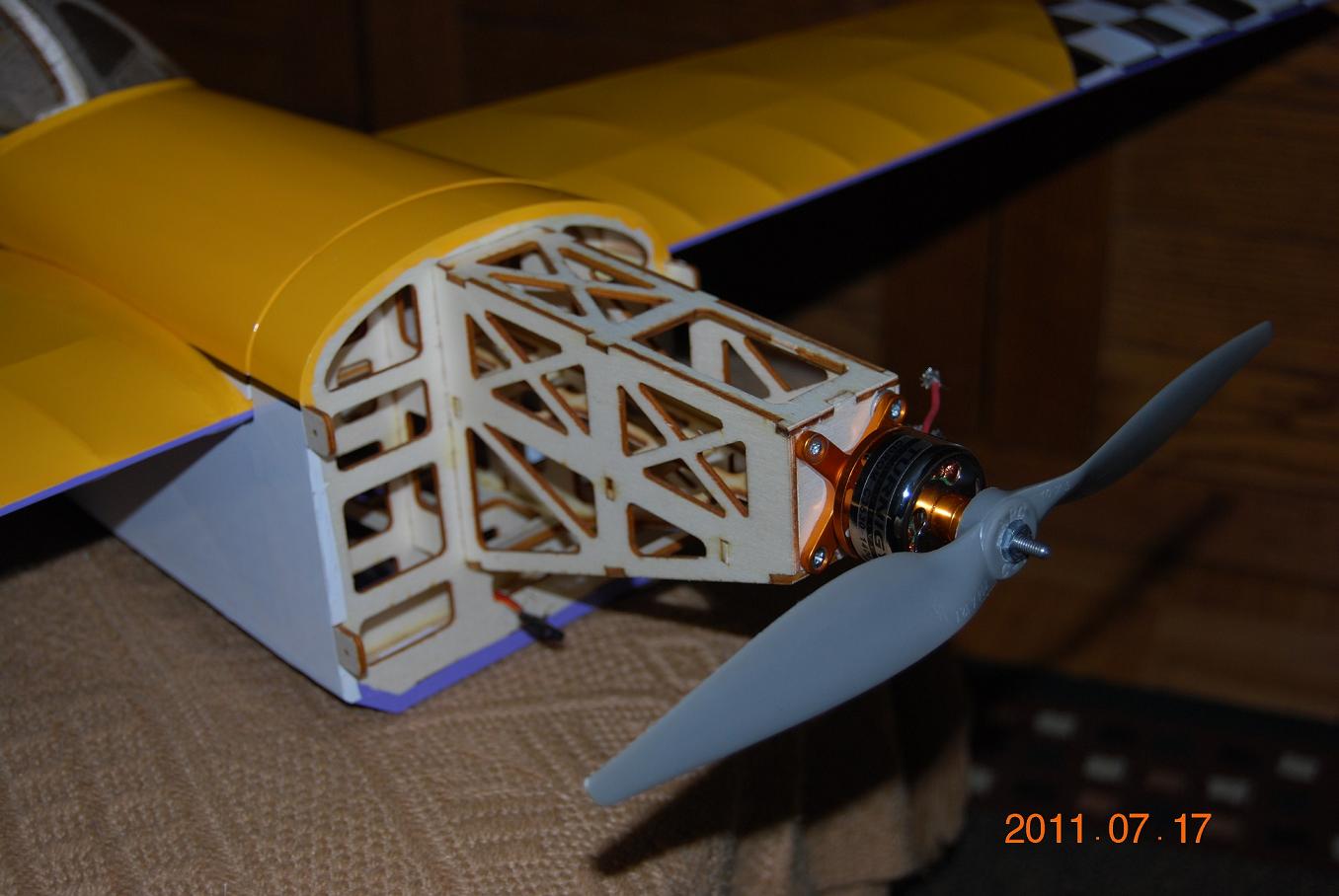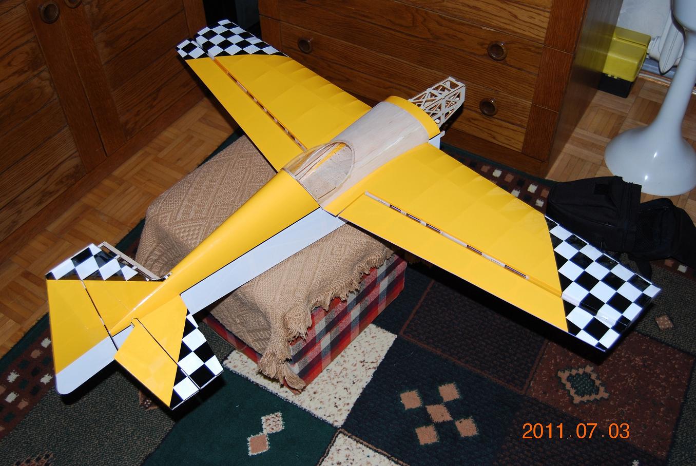 Owiewkę postaram się jakąś wyklepać z hipsu (2 elementy do sklejenia). Wczoraj zważyłem model bez maski i podwozia. Całość z serwami, silnikiem CD-ROM turnigy 3530, pakietem 2.2Ah 3S Turnigy, reglerem Sentry 40A, odbiornikiem wyszła 840g. Wyważa się bez problemu. Odpaliłem silnik na naładowanym pakiecie w 50%. Śmigło APC E 10x5. Model wyrywał z ręki do góry w pionie. Do oblotu pozostało niewiele pracy: wkleić 3 zawiaski do lotki (oczywiście mam jeden