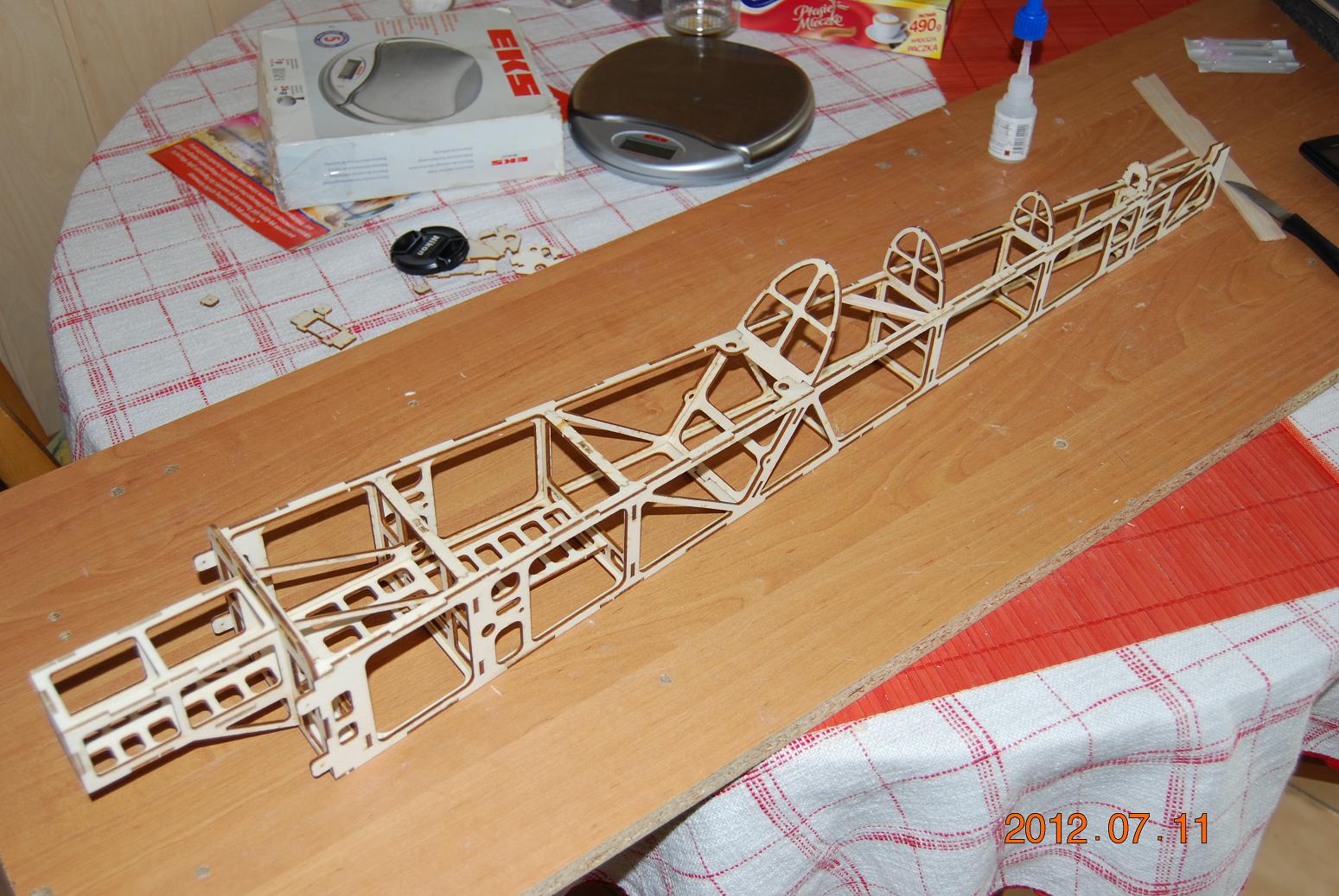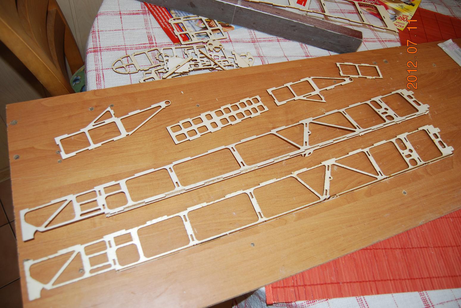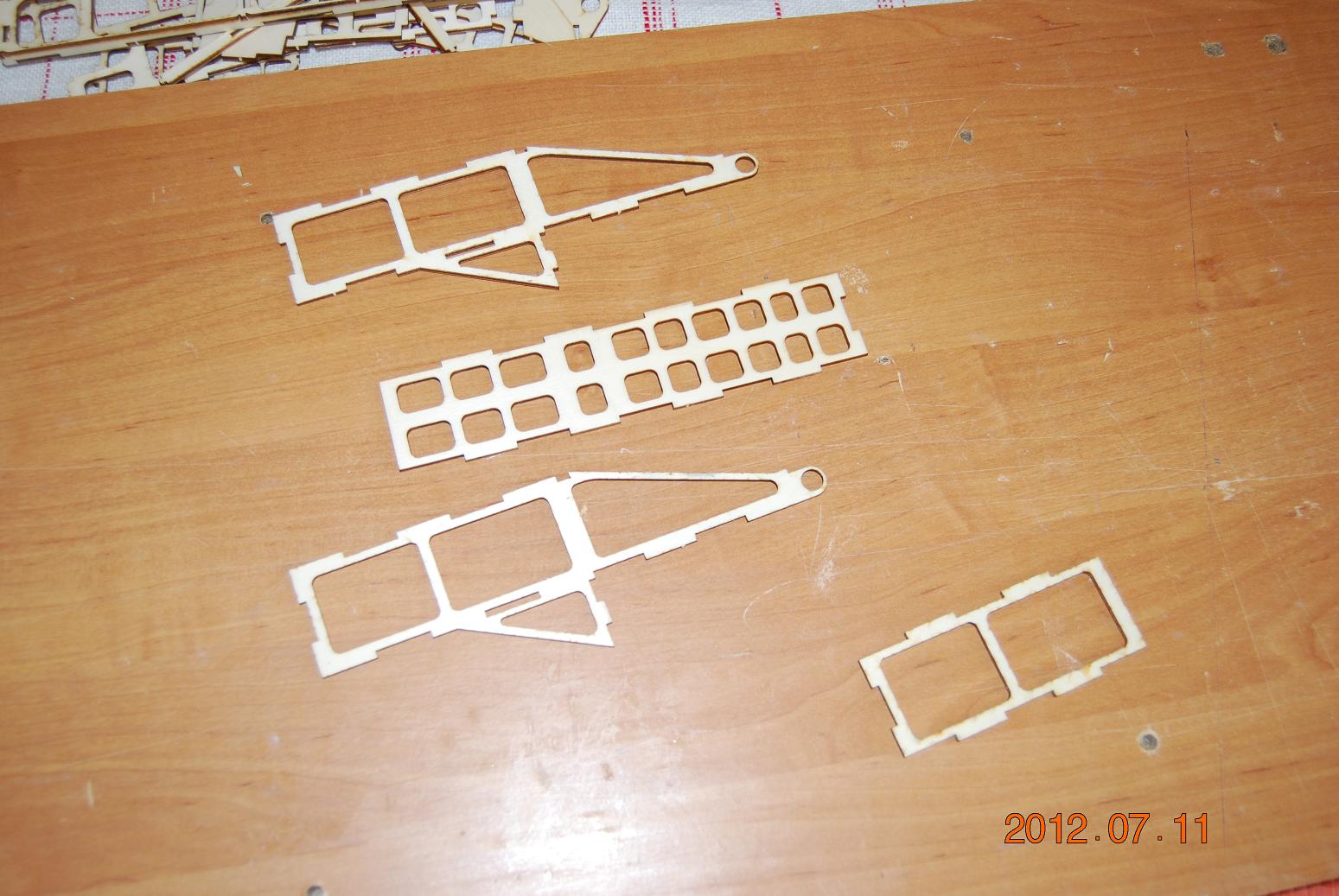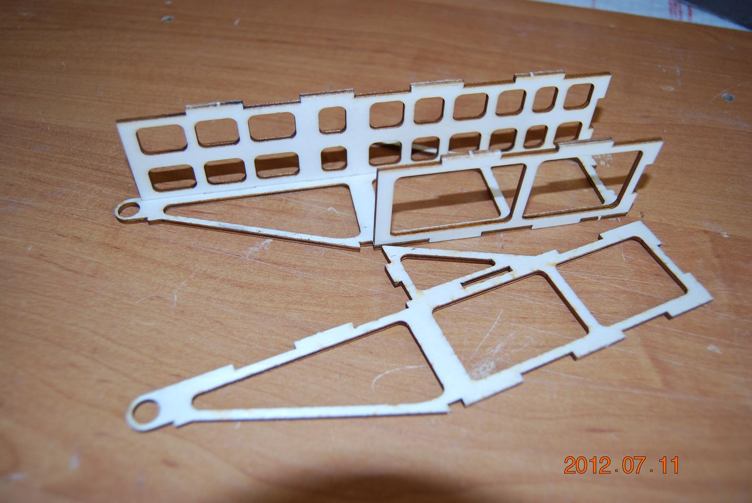 Dostałem dziś przesyłkę z wycinankami. Skleiłem próbny kadłub. Wszystkie sklejkowe elementy modelu ważą 90g. Reszta to balsa. Kadłub z ostatniego zdjęcia waży 96g.