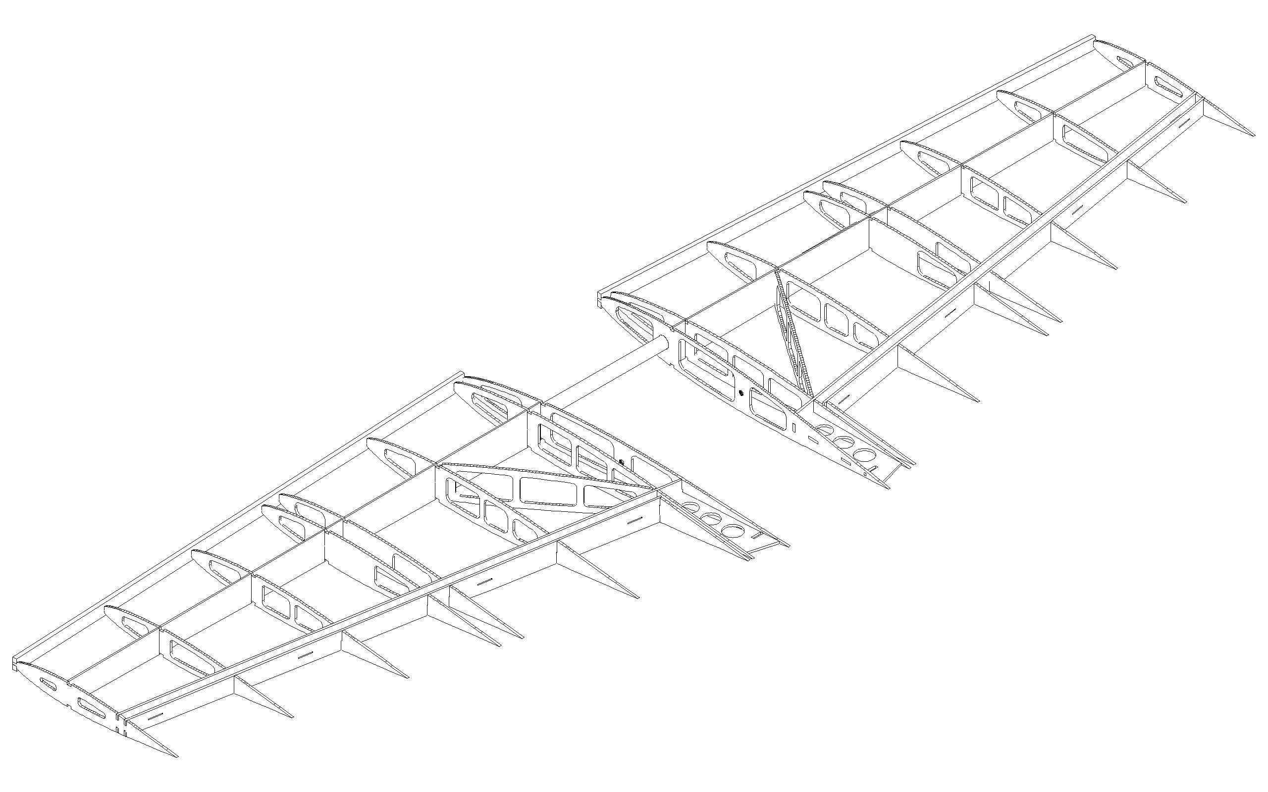 Witam . Masz Sławku w modelu dość długą rurę łączącą skrzydła i to ona będzie przenosić większość obciążeń . Możesz jeszcze dać paski balsy przez środki wycięć w pokryciu kesonu by zwiększyć sztywność i zapobiec zapadaniu się folii na owych ażurach . Ciekawe , że nikt w modelach nie stosuje dwu rur do łączenia skrzydeł a jak wiadomo co dwa dźwigary to nie jeden .