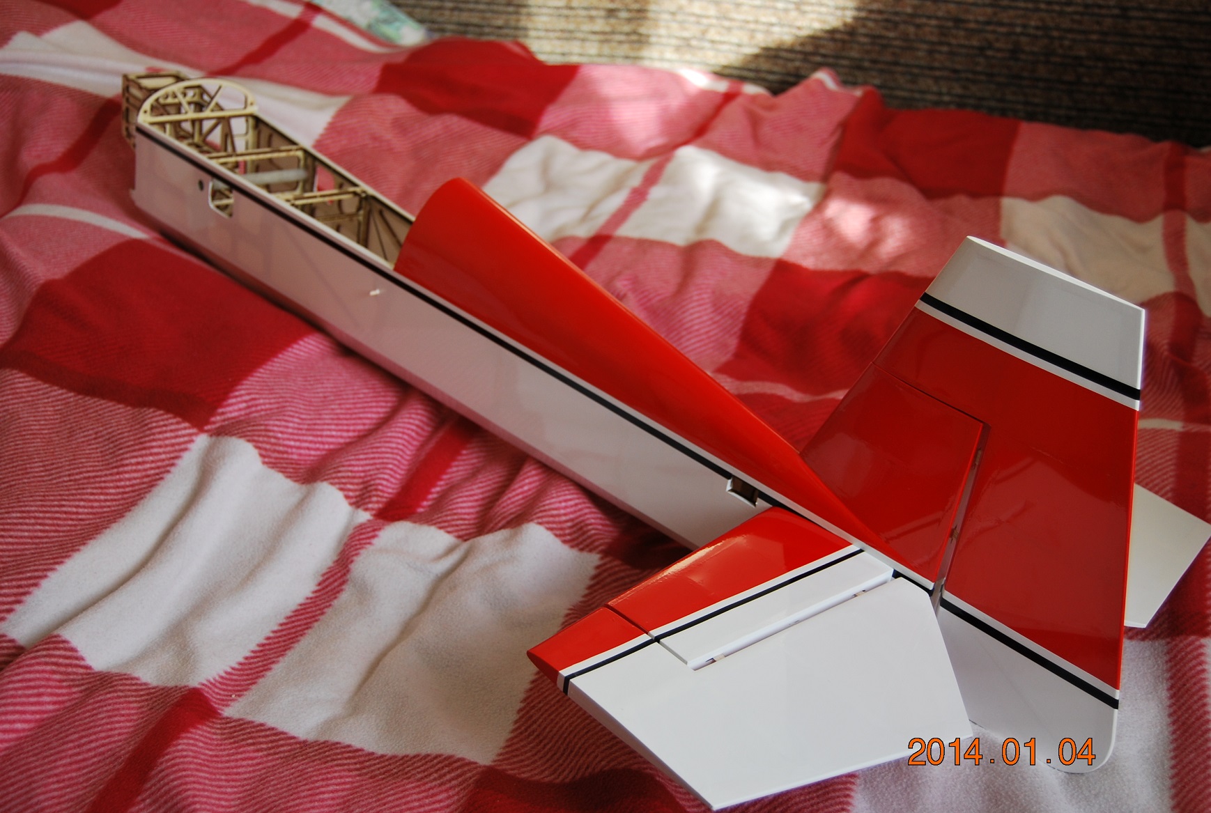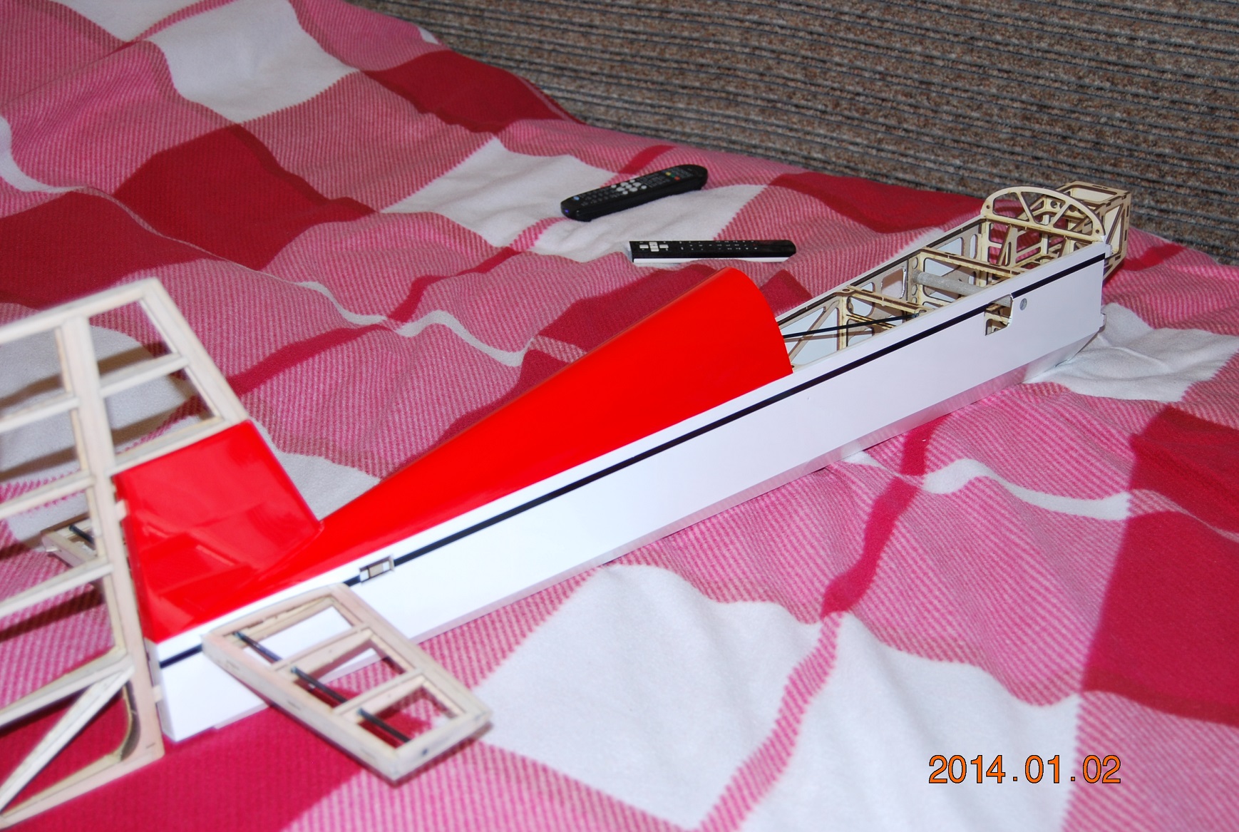 Zakupiłem serwa do Exty, narysowałem dźwignie i zamówiłem ich wyfrezowanie. Kupiłem dziś w Krakowie czerwoną folię. Podgoniłem trochę z kadłubem.