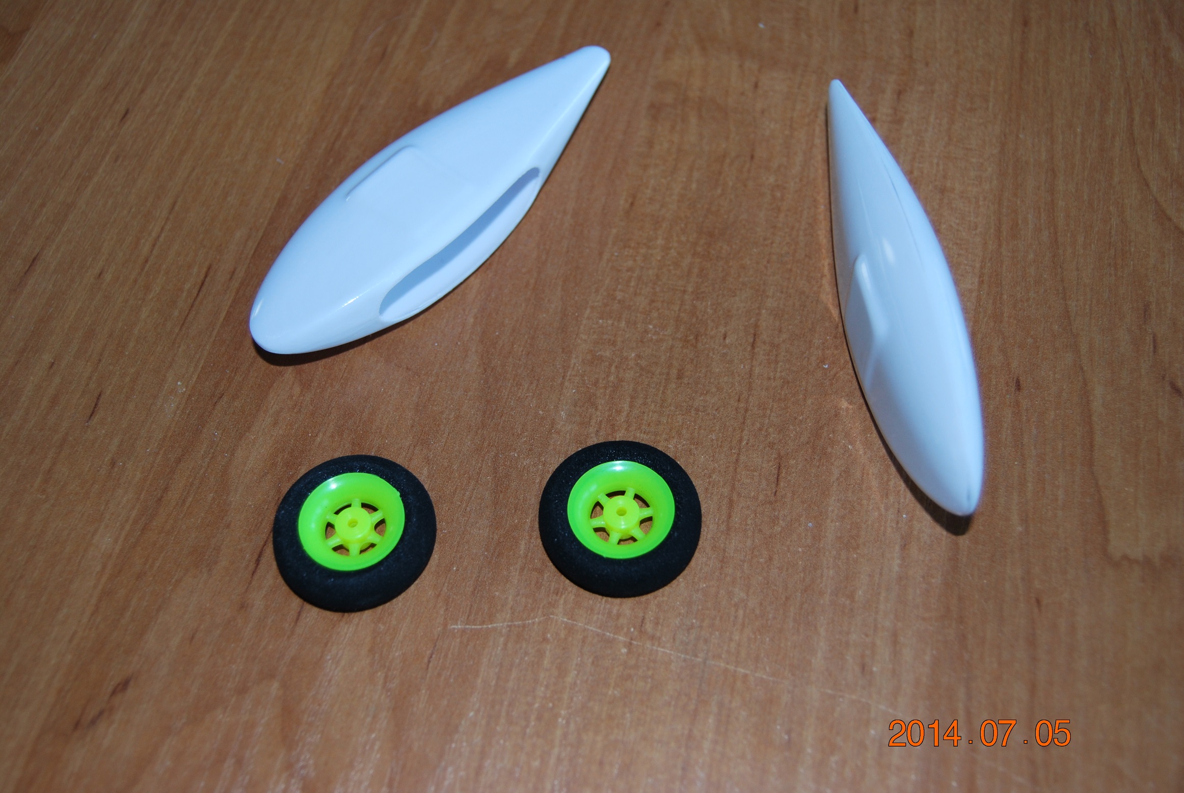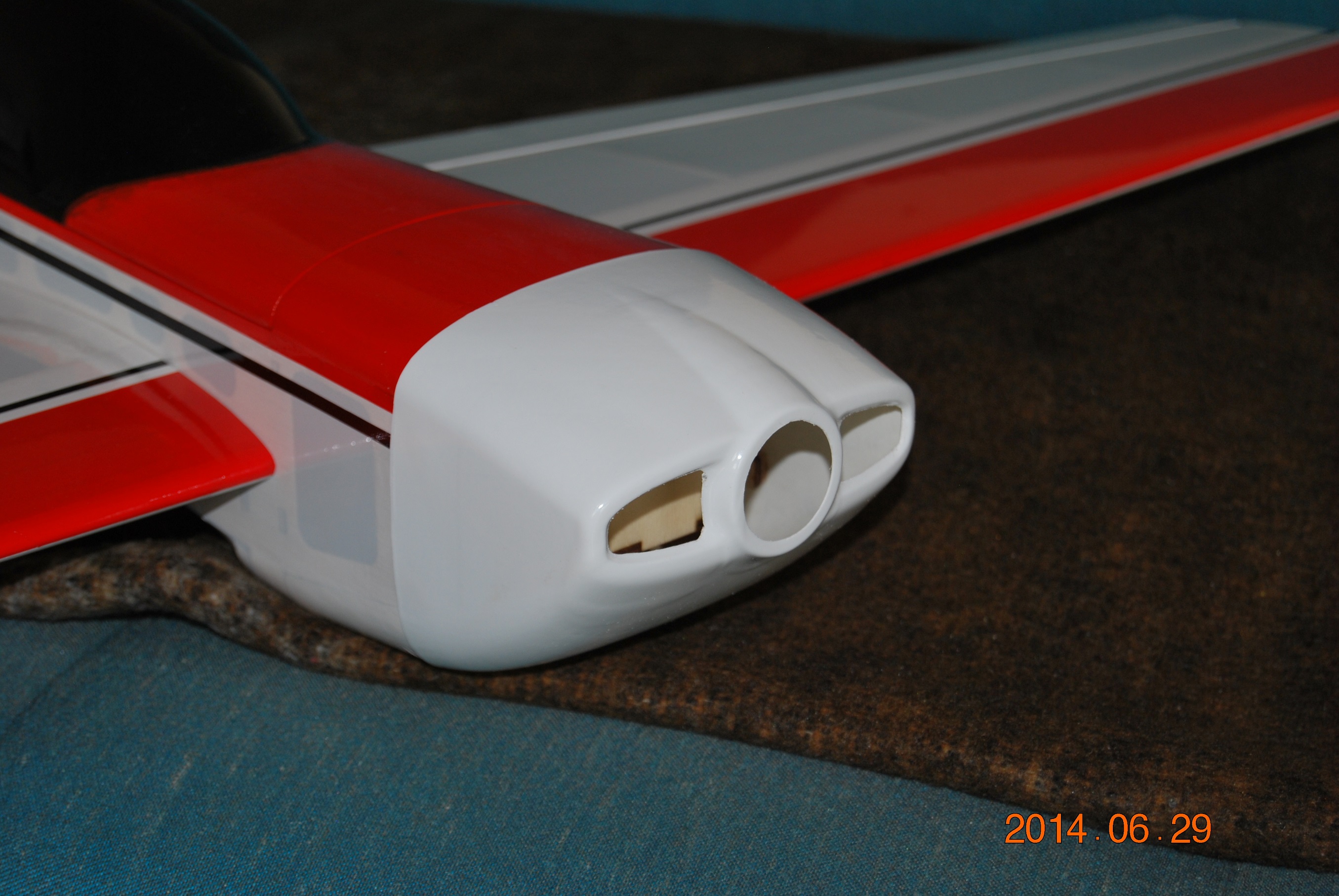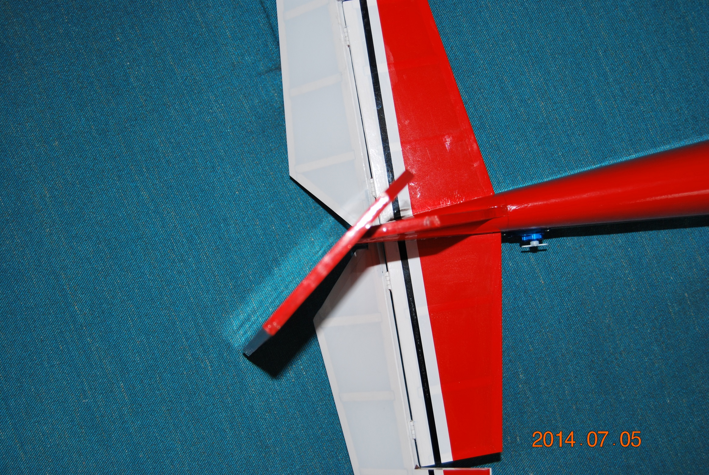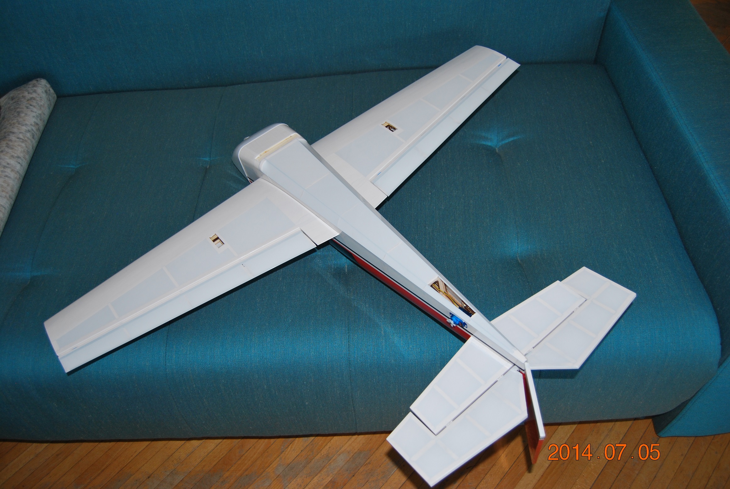 - zostało to co niezbędne żeby trzymała się folia i wyposażenie. Myślę że dla chcącego nie będzie problemem zejść poniżej 600g. Przy wadze 600g obciążenie pow nośnej będzie wynosiło 32g, przy 650g około 34g. Zobaczymy po oblotach. Jeżeli będzie ok to nic już nie będę zmieniał prócz kilku drobnych elementów. Jeżeli obciążenie okaże się za duże zwiększę cięciwę przy kadłubie o około 2cm a przy końcówce o 3cm. ten zabieg pozwoli na zwiększenie pow o około 2,5 dm2 co da zmniejszenie obciążenie pow nośnej co z kolei pociągnie mniejszą prędkość minimalną i takie tam bleblele- wiadomo o co chodzi. Tak czy inaczej, wklejony statecznik poziomy, wklejone zawiaski SK i SW, wycięty otwór odpowietrzający. Docięta osłonka silnika, doszlifowane mocowanie silnika (skłon itp) Wykonane osłonki podwozia. Zakres wychyleń SW i SK po około 45st.