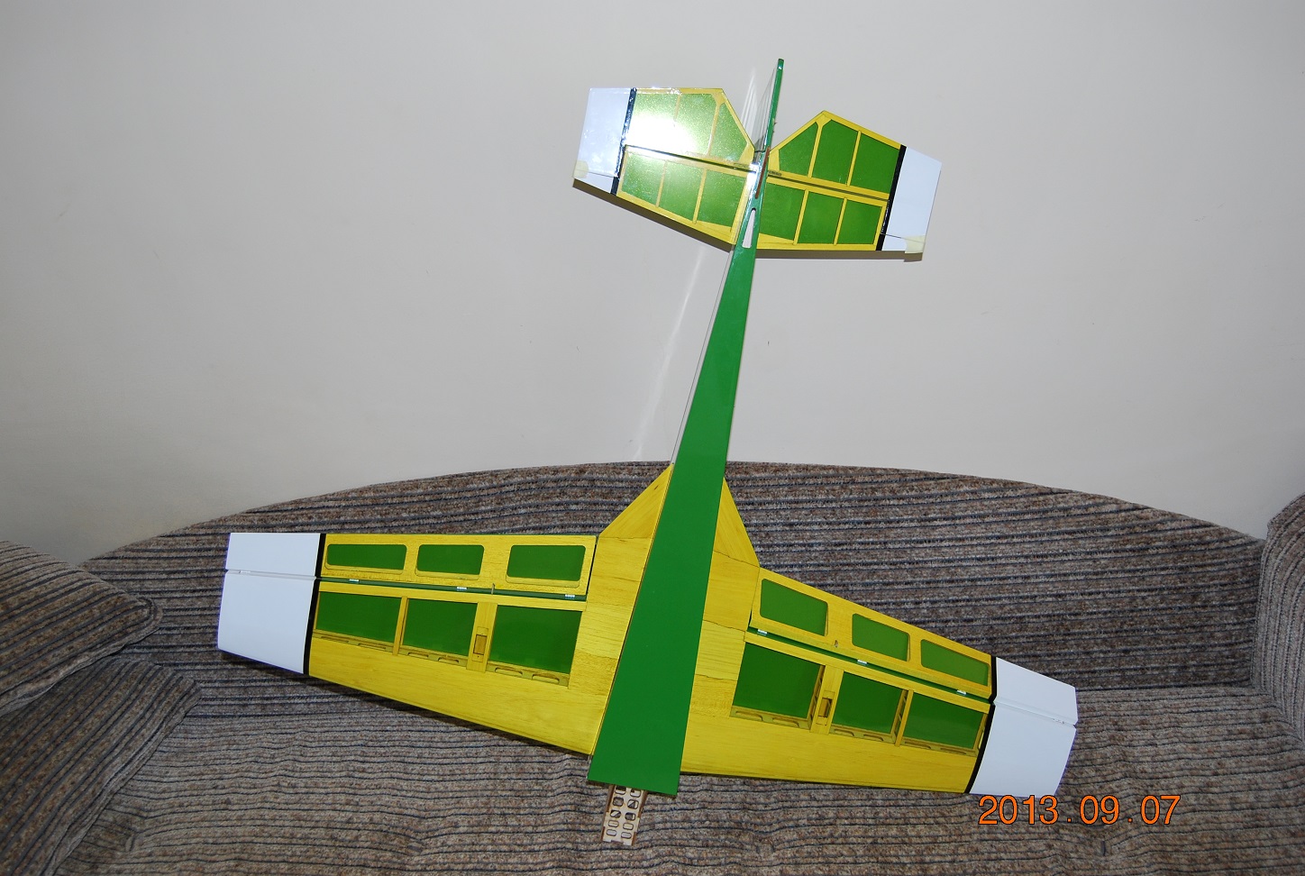 Okleiłem do reszty model. Zgodnie z przewidywaniem waga 370g. 200 g umieszczone w domku silnika równoważy model w zakładanym punkcie SC. Na tył dojdzie 20g w postaci serw i popychaczy co da około 280g na przodzie do zrównoważenia. Pakiet 1,5Ah + regler + silnik + śmigło wygeneruje jakąś tam masę (potem policzę) W sumie nie jest źle z wagą. Pierwsza wersja miała stateczniki o wadze 31g przed oklejeniem, usterzenie tej wersji waży 12g przed oklejeniem czyli 19g lżej , co więcej, z tego powodu odpadnie z mordy około 70g niezbędnych do zrównoważenia ogona. Oczywiście można powiedzieć że Katana mini PA waży pusta ( z podwoziem i maską) 370 g ale tam są inne pieniądze na wdrażanie modelu niż u mnie. Z drugiej jednak strony wiem już gdzie usunąć nadmiar materiału w ostatniej wersji zeby kolejne były lżejsze (o ile będą kolejne wersje). Póki co model prezentuje się tak jak na fotkach. Trochę skaszaniłem paski na SW ale na konkurs piękności przecież toto nie idzie.