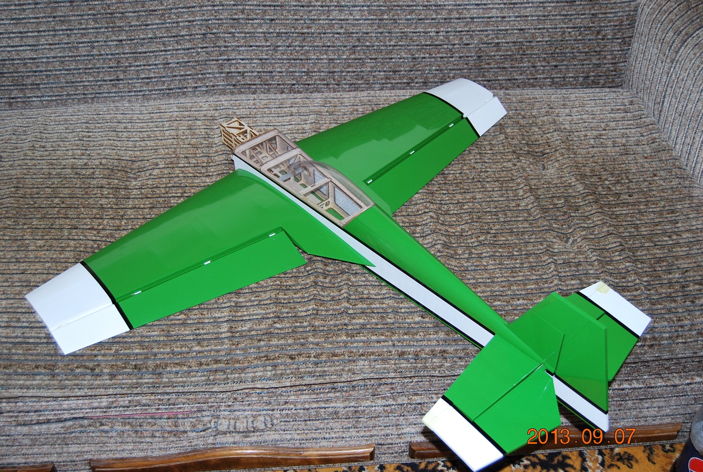 Uzbroiłem model, może jutro uda się oblatać. Waga z pakietem Dulasky 3s 1300mAh to 735g. Ni to dużo ni to mało. Podwozie zaadaptowane z kupionego od Tomka z pefemu Extrima. Tak jak już napisałem wcześniej zbić wagę można w kilku posunięciach : lżejsze lotki-odleci koło 20g, lżejszy odbiornik- 6014HS trochę waży a można zaoszczędzić 10g, regulator- tu można dużo bo ze 20g, wytłoczka kabiny 33g- można zrobić z cieńszej folii i z 10g ubędzie, kadłub i balsowe wręgi- tu też jeszcze można dużo podziałać. Dojdzie maska silnika z laminatu -około 15g.