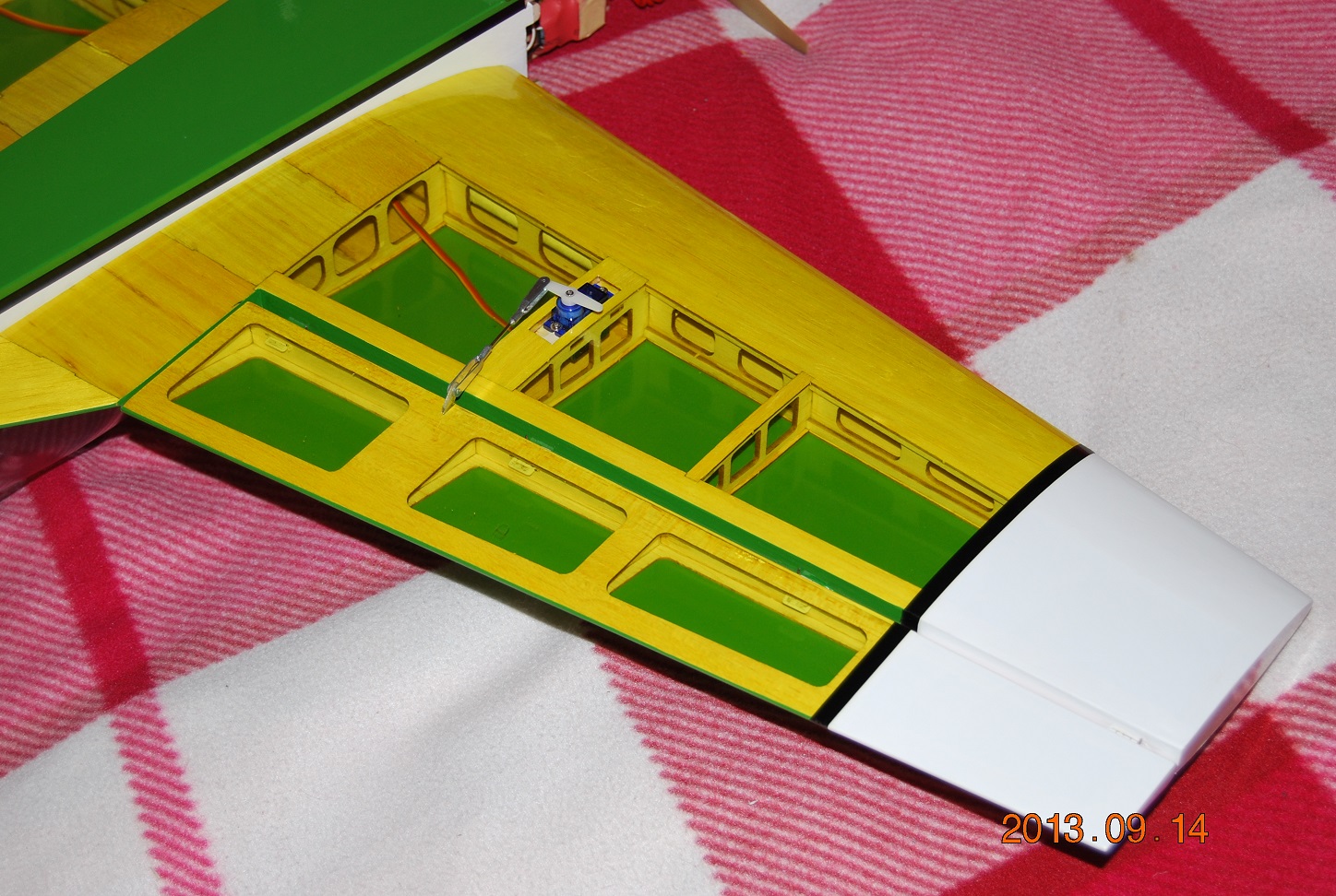 Założyłem serwa do skrzydeł, HXT900, takie miałem pod ręką i takie latały w tych skrzydłach przed dzwonem z zeszłego roku. Serwo od jednej z lotek wypluło zębatkę ale miałem tryby od GWS NARO PRO i okazało się że są identyczne :D . Miałem przypał z moją Futabą 12FG. Wydawało mi się że jest w złym mode więc zacząłem je zmieniać a tu żadnego efektu. Już myślałem że padł komputer , wszystko zrobiłem zgodnie z instrukcją. Szkoda tylko że nie dopisali w niej że aby zmiany zadziałały należy zresetować ustawienia drążków w DATA RESET. Dodam że radio ma soft 3.0. Tak czy siak poustawiałem wszystko i jest ok.