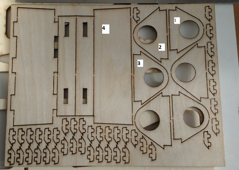 Elementy 1, 2, 3 nakleja się na trzy pierwsze żeberka w skrzydłach. Wzmacniają one żeberka w miejscu przechodzenia rury łącznika przy okazji wiążąc tą rurę z sosnowymi dźwigarami. Nie pamiętam z której strony ale przyklej do żeberek jednego skrzydła i złóż samo skrzydło na sucho, zobaczysz czy masz żeberka prosto czy trzeba przekładać. Elementy 4 służą do oklejenia łoża podwozia zrobionego ze balsosklejki. Służą temu żeby nakrętki kłowe miały od góry oparcie a a od dołu w miejscu mocowania podwozia półka była wzmocniona. Natomiast dwa podłużne elementy ze sklejki z podłużnymi otworami to wzmocnienia kadłuba w miejscu jego łączenia z dwóch połówek, chyba jest to w okolicach 3 wręgi. Pasek pasuje tylko w jedną stronę.