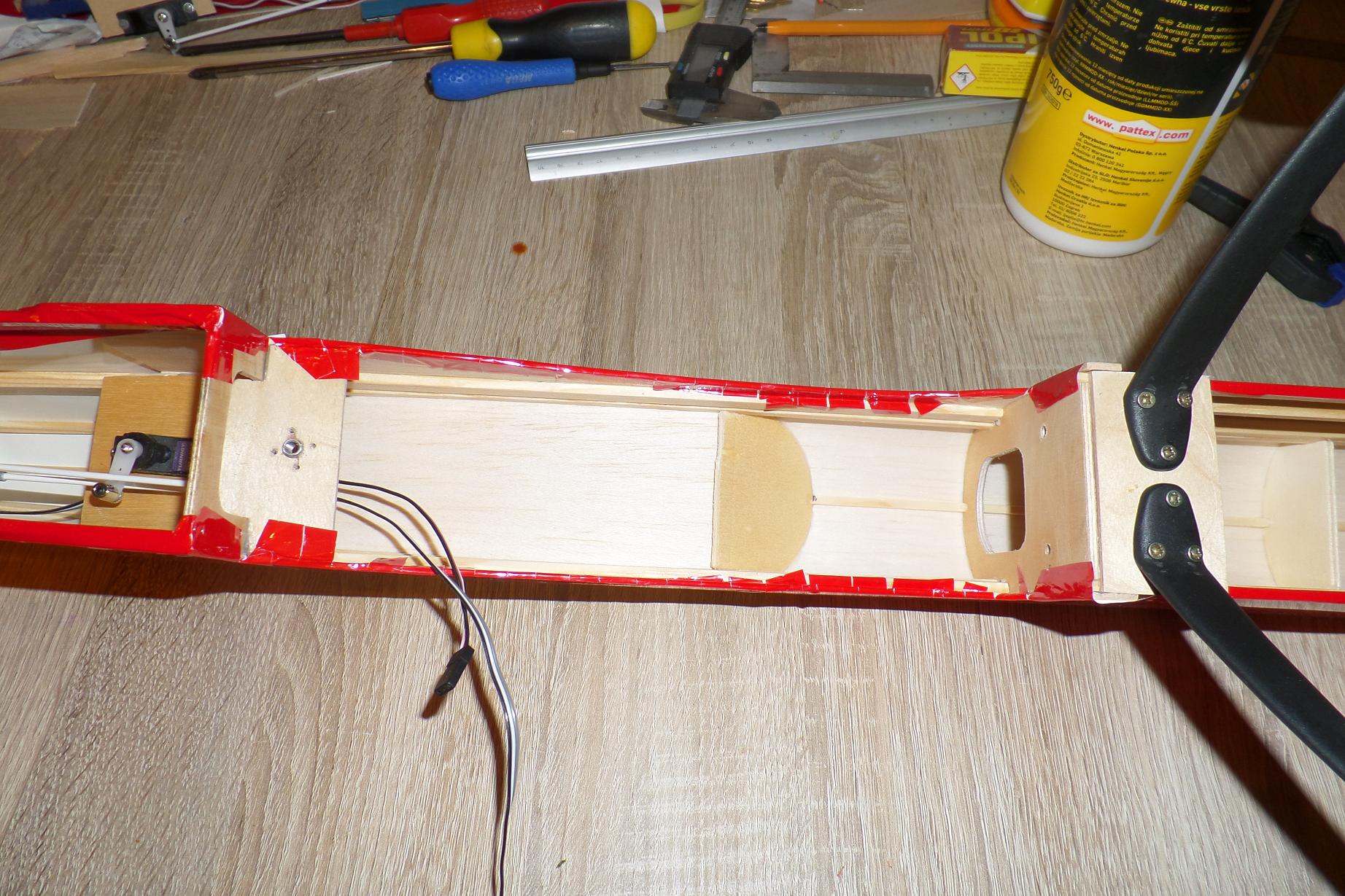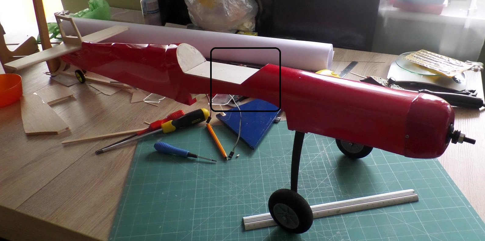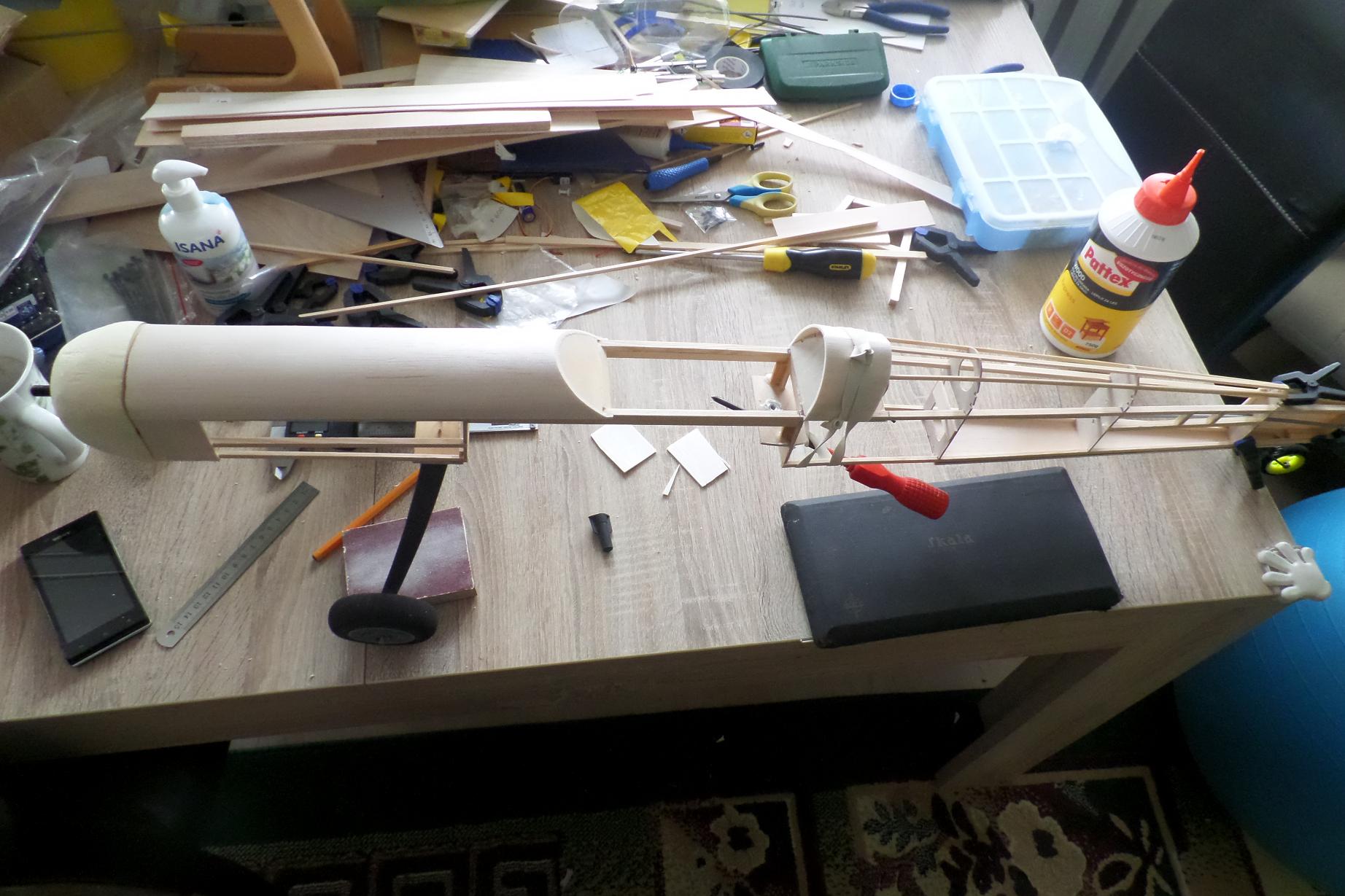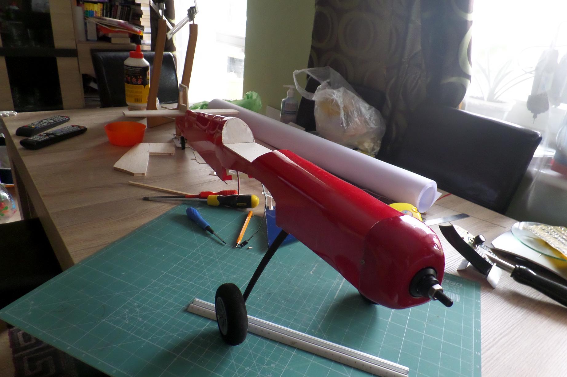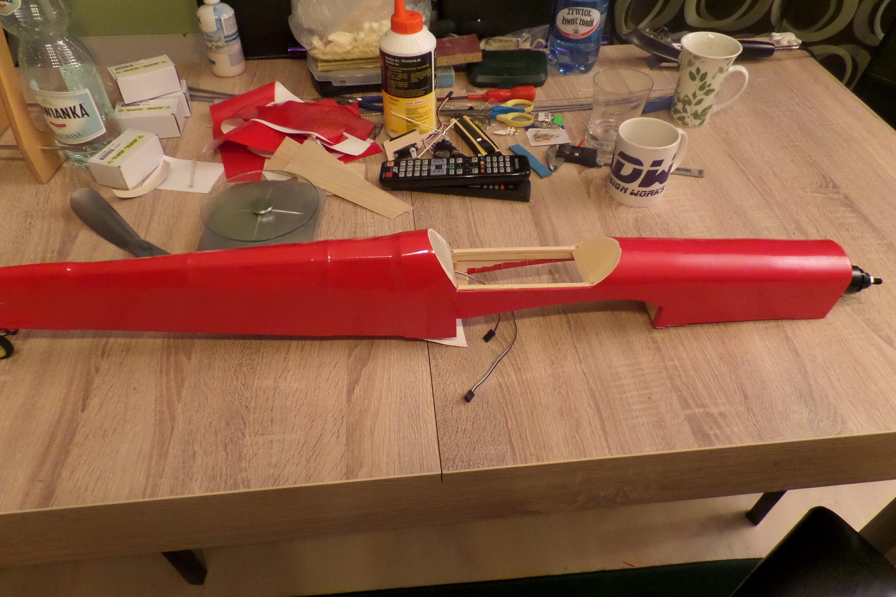 Przód (od silnika do podwozia) oparłem o stół, wyginałem przykładając siłę przy statecznikach.