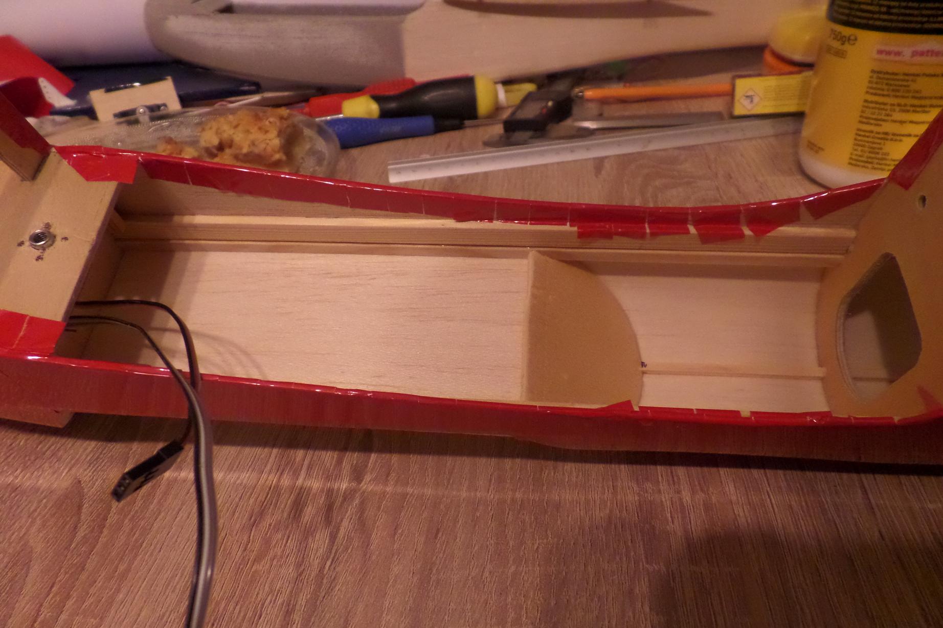 Za podłużnicę robi sosna 5x5 - w poprzedniej wersji (przed opisywanym na początku krecikiem) była tylko ona i faktycznie kadłub trochę pracował.