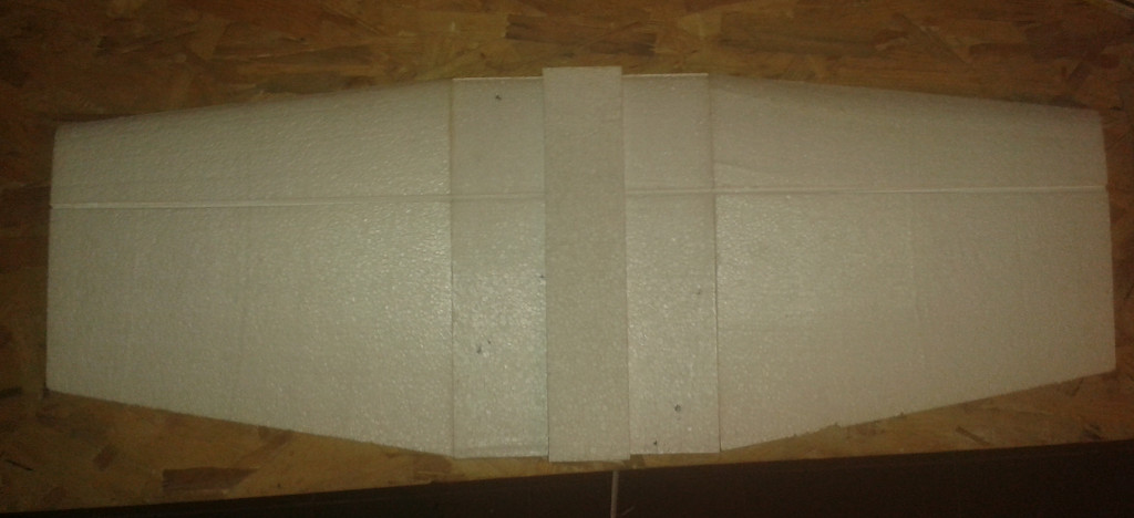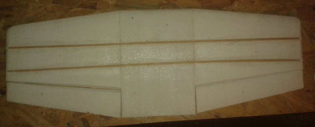 Wstępnie założyłem wykonanie całości ze styro na profilu symetrycznym NACA 0010. Skrzydła prostokątno-trapezowe. Trapezy na końcówkach mają 20cm, od strony kadłuba 30cm, rozpiętość części trapezowej 30cm/stronę. Środek - prostokąt 20cm rozpiętości. Sterowanie jak to w delcie - lotki, brak steru kierunku.