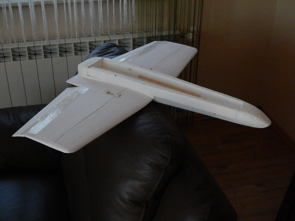 Wersja 1 prawie skończona - zostały stateczniki pionowe, montaż wyposażenia i pierwsze testy. Waga tego co na zdjęciu - ok. 200g. Z wyposażeniem zmieszczę się w 700g.