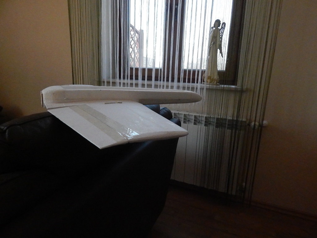 Skrzydło i lotki oklejone. Twardość i sztywność taka, że wydają się niezniszczalne. Waga ok 150g.
