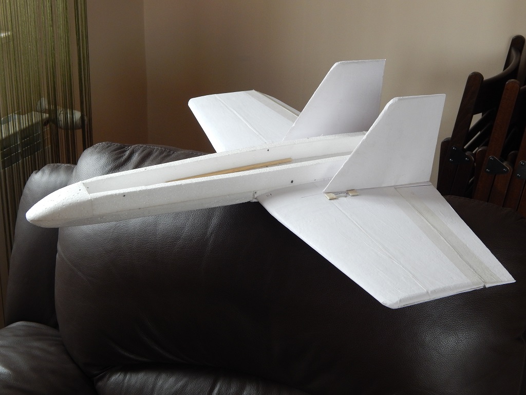 Z uwagi ze z tego typu modelami nie mam żadnego doświadczenia i jest to zupełny eksperyment, pierwsze loty chcę wykonać najszybciej jak się da - bez napędu, tylko sterowanie i wyrzut z ręki. Jeśli pomysł się sprawdzi - model będzie przewidywalny i sterowalny, dokończę budowę i poćwiczę z napędem.