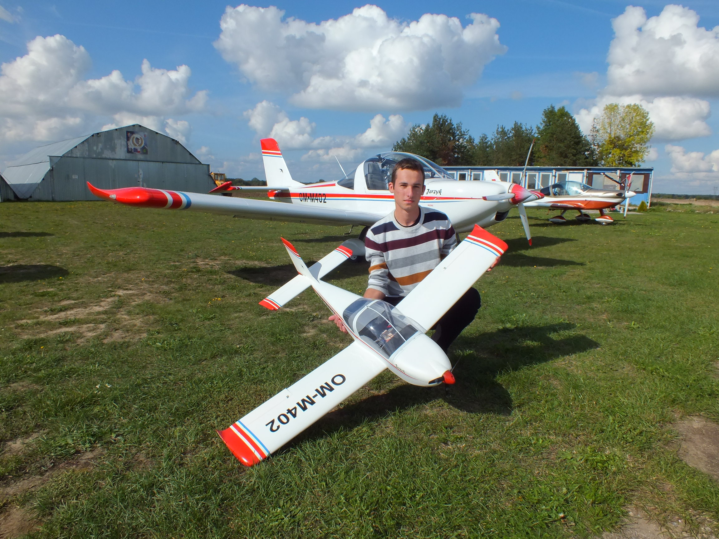 Oblot miał miejsce na lądowisku w Tuszowie Narodowym. Warunki oceniam na średnie, wiatr ok. 3m/s z Północy, który powodował znaczne rotory od lasu. Na starcie dał o sobie znać lekki niedobór mocy, użyty silnik ma 1200g ciągu statycznego natomiast model waży 2.2kg więc stosunek mocy do wagi wynosi troszkę ponad 1:2 co jest jednak trochę maławo. Jednak po oderwaniu od ziemi nie jest tak tragicznie. Na pierwszy lot wybrałem start z trawy, ponieważ do wyboru miałem jeszcze wąską asfaltową drogę, lecz bałem się o utratę kierunku przy starcie, a szkoda było by zarysować nowy lakier Po sporym rozbiegu i oderwaniu dał się odczuć przesunięty do tyłu ŚĆ. Pomimo znacznego doważenia w postaci 10cm kawałka pręta tzw. "żebrówki" nadal pasuje przesunąć go do przodu o 1-1.2cm. Wznoszenie jest możliwe po uprzednim rozpędzeniu konstrukcji i z zakresem obrotów w przedziale 85-100%, lot poziomy jest możliwy przy 60% wychyleniu przepustnicy. Ciężko mi powiedzieć jak zachowuje się model w spokojnym powietrzu ponieważ warunki nie były miarodajne. Pękaty kadłub jest podatny na boczne podmuchy, turbulencja tego dnia dała się bardzo we znaki. Model wytrącany z równowagi powracał do poprzedniego stanu co powinno potwierdzać założenia i konstruktora samolotu i moje. Prędkość lotu realistyczna jak na tą skalę. Zrobiłem jeden 8 minutowy lot, w tym parę zakrętów i trzy imitowane podejścia do lądowania. W jednym z zakrętów troszkę się wyluzowałem i gwałtowny podmuch spowodował że model sypnął się delikatnie w korek, natychmiast odpuściłem SW i wyprowadzenie nastąpiło równie szybko jak wprowadzenie, ze zmianą wejściowego kierunku o ok. 30st. Zaskoczeniem było dla mnie jak model się "niesie". Jak dotąd to był to pierwszy tak ciężki model, którym latałem i muszę powiedzieć że nawet jak na moje doświadczenie to wymagał sporo uwagi przy planowaniu lądowania. Potwierdza to szczególnie już finalne lądowanie w którym znowu za szybko się wyluzowałem i model po fazie podprowadzenia zamiast ładnie wytrzymać na wysokości ~20cm to wypłynął mi na ok 1m i następnie wszystko potoczyło się bardzo szybko, dodałem lekko gazu żeby nie wytracił zbytnio prędkości lecz stres zrobił swoje i model lekko przepadł z wysokości ok.40cm. Efektem tego było lekko odgięta goleń podwozia głównego, lecz jest to łatwa w naprawie usterka. Satysfakcja po oblocie była bardzo duża, mam zamiar wprowadzić kilka zmian m.in dołożyć trochę masy na przód, dobrać wielkość stałych trymerów na lotkach, SW i SK, wsadzić mocniejszy napęd (ok. 2kg ciągu, Reg. 40A ale to na przyszły sezon), Wzmocnić konstrukcję kółka przedniego (wydaje mi się delikatne jak na start z trawy). Mam nadzieję że uda mi się wykonać jeszcze lot w tym sezonie to zobaczę czy te zmiany coś wniosą. Trochę obawiam się tylko o czas lotu. Mam do dyspozycji pakiet 3000mAh i po tych 8, może 7 minutach lotu jego napięcie wynosi 12.1V. Trochę boję się odcięcia zasilania, ponieważ już drugiej próby podejścia nie będę miał, więc wolałem już drugi raz nie próbować. Na koniec mogę powiedzieć że warto było tyle czasu poświęcić na dopieszczanie szczegółów, których może nie widać ale ma się świadomość że tyle pracy nie poszło na marne. bardzo miłe są również uwagi od gapiów no i pozytywne opinie z tzw "lotniskowej loży szyderców"
