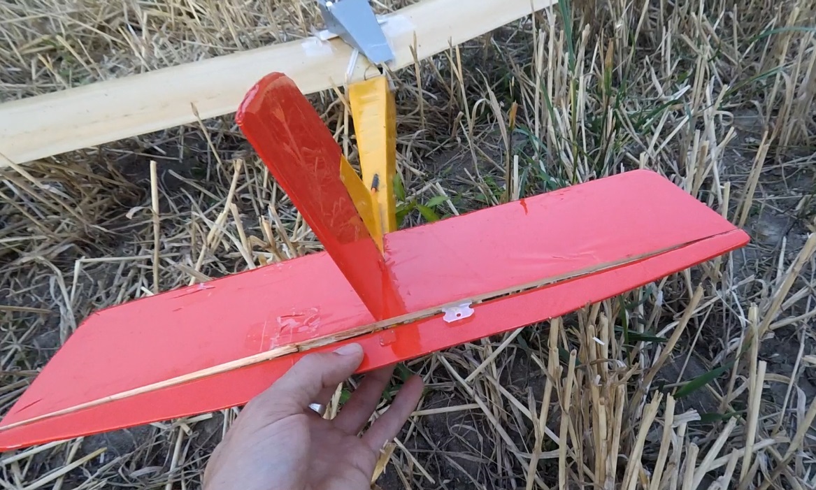 Następnego dnia, na ściernisku, przyklejam samą owiewkę do modelu i robię próbny oblot - jak zachowa się z dodatkowym elementem. Wpływ owiewki jest znaczny, model słabiej się wspina no i bez silnika lata bardziej jak samolot niż szybowiec
