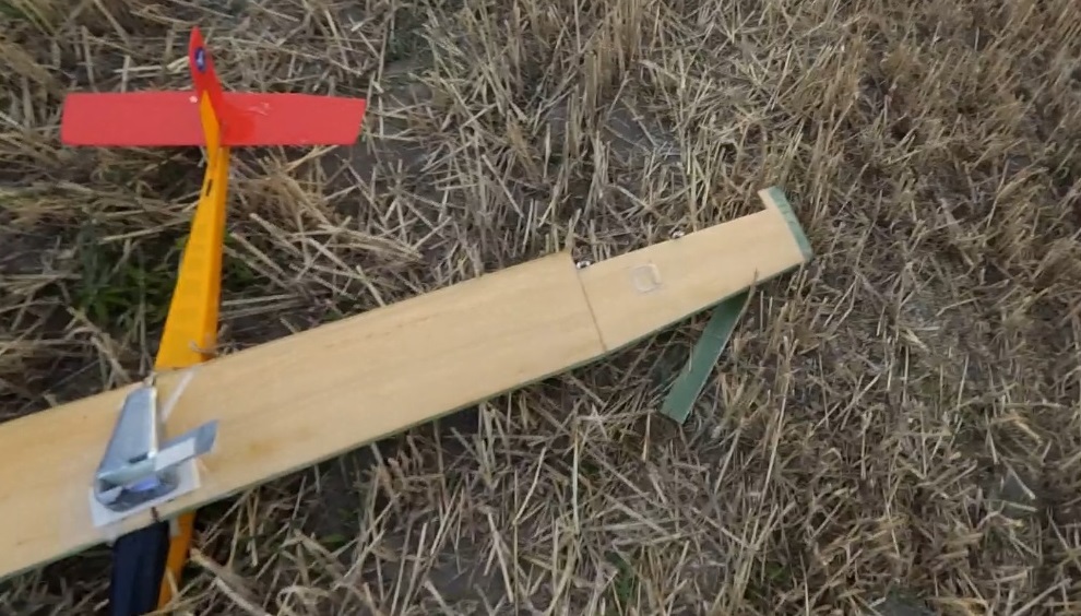 Skrzydła na gumie nieco zamortyzowały uderzenie, wyrwało lewą lotkę (od pionowego przyspieszenia) wraz z popychaczem (i przy okazji tryby w serwie). Ster wysokości ucierpiał podobnie jak lotka wyrywając się z zawiasów