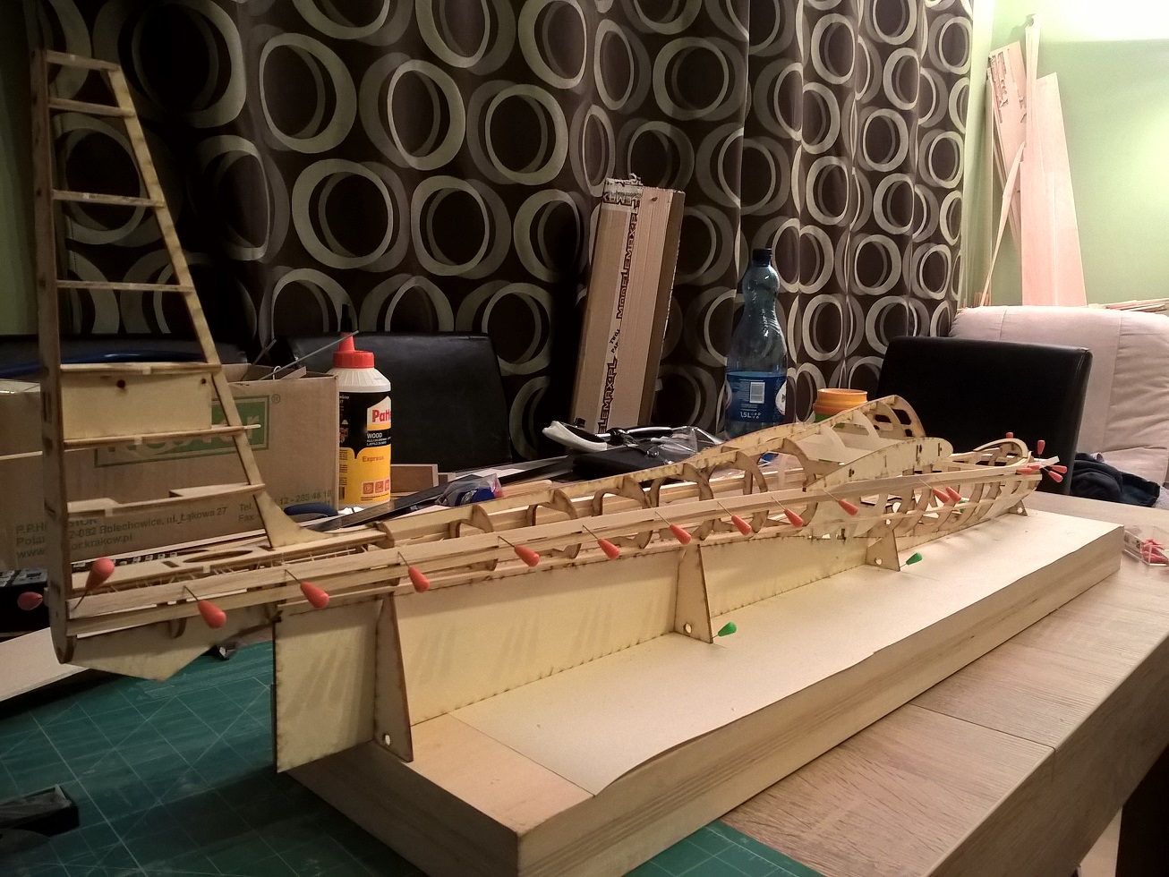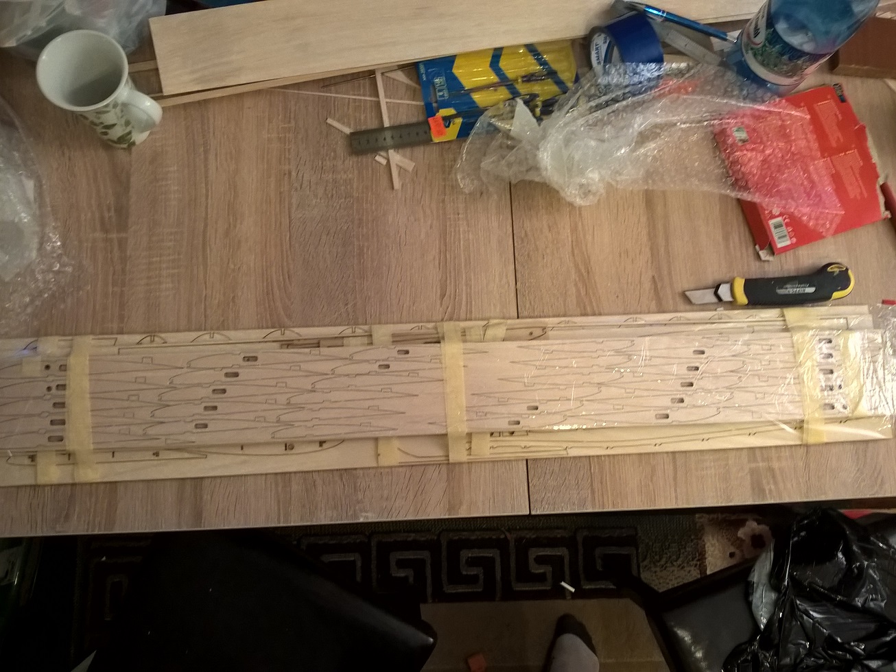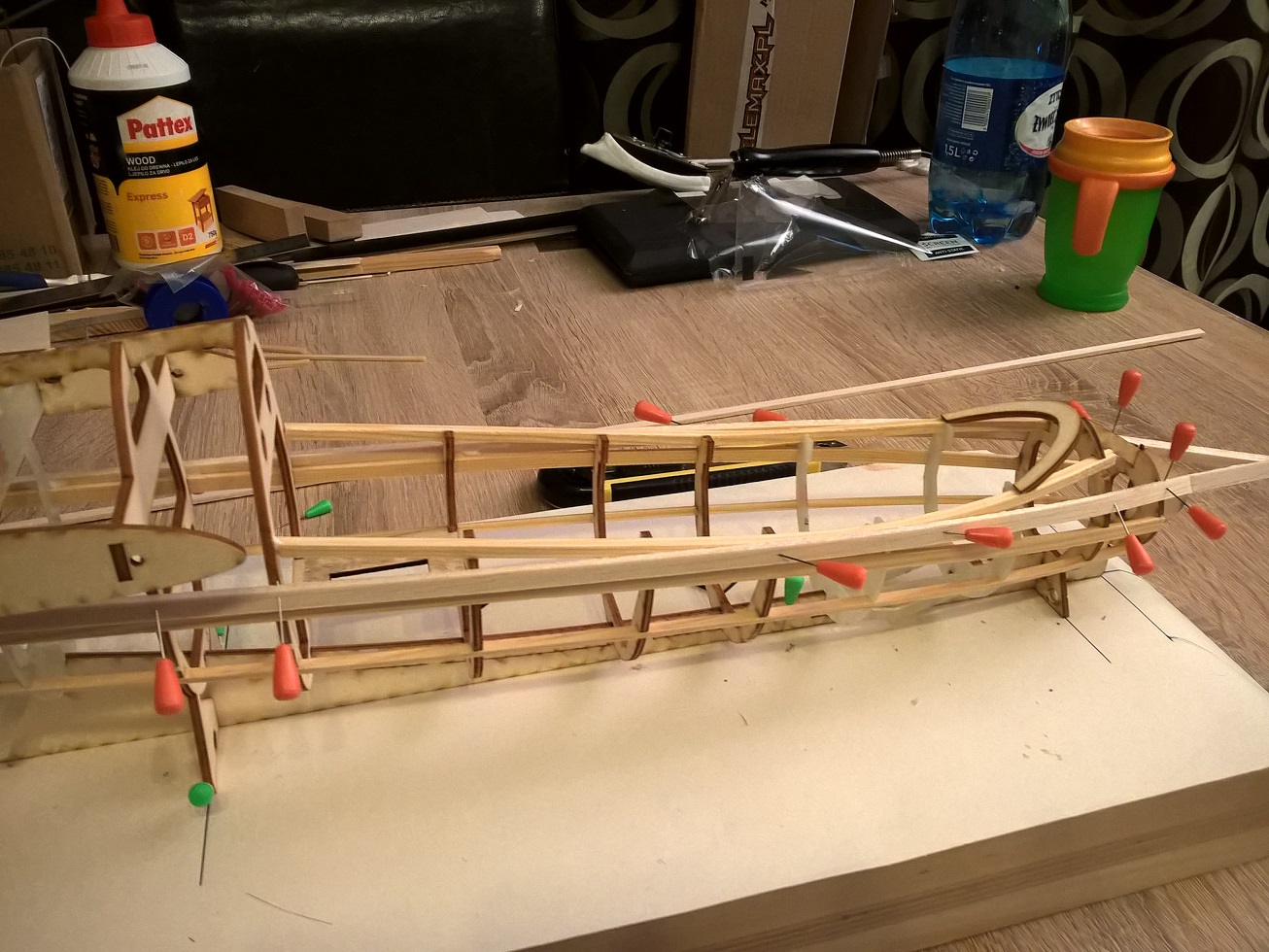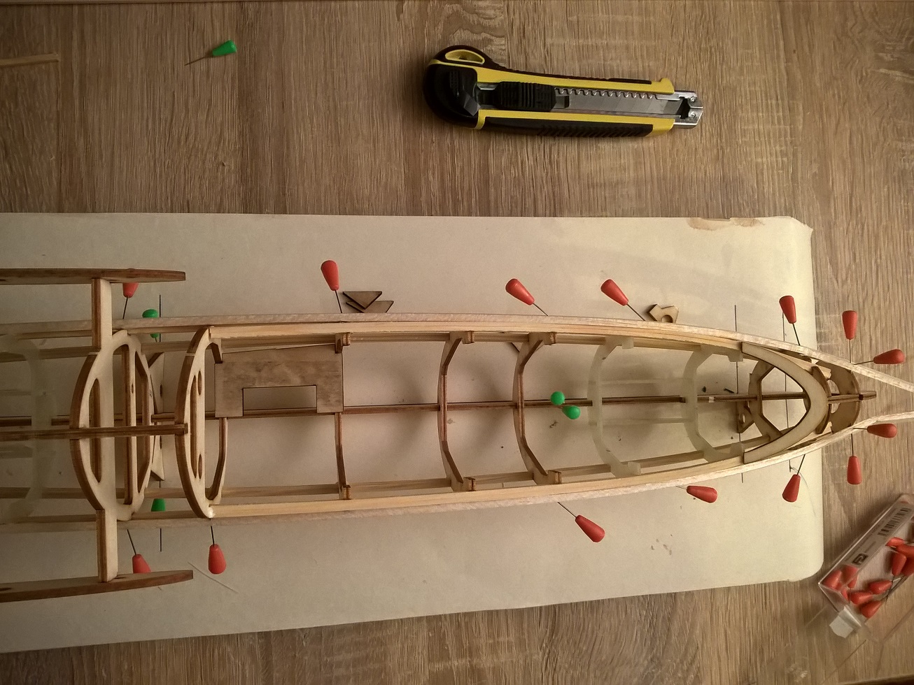 Widok na przód. Dziób stanowi całość wraz ze stępką i podłużnicą. Wręgę #1 trzeba wsadzić lekko rozchylając stępkę.