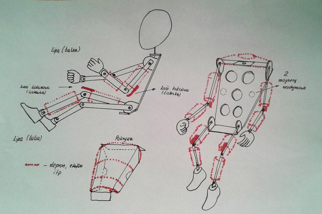 Moja niezrealizowana propozycja. Linki napędów aby nie pracowały jałowo, można wykorzystać do napędu kończyn „Felka”. Konstrukcja jest bardzo prosta i wykonać ją można z balsosklejki, sklejki albo z cienkiego aluminium. Obłe kształty to depron, styropian, etafon itp. Na to dajemy kombinezon z płótna i nic będzie nie widać. Aby przy projektowaniu sylwetki nie pogubić proporcji mężczyzny, ściąga z dziedziny plastyki.