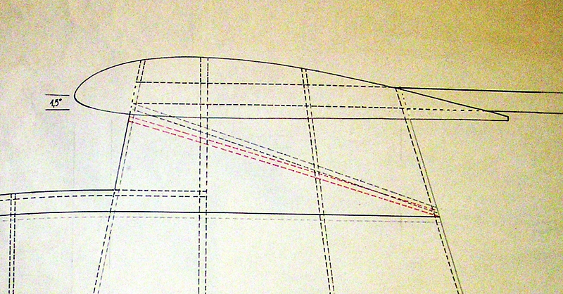 ... I właśnie... Do tej piątej szło wszystko błyskawicznie. Jednak z szóstą... No było trochę problemów i przede wszystkim upłynęło sporo czasu. Mimo, że na planach, z których staram się to wszystko rozrysować, są podane wymiary itp., to jednak tak fajnie nie wychodzi. Po paru godzinach pracy zrozumiałem i doszedłem do wniosku, że pewne niezgodności są spowodowane przede wszystkim tym, że nie będzie profilu oryginalnego. To niby pierdoła, ale naprawdę dużo. Przeliczając rysunki p. Luranca wychodzi tak: wymiar zmierzony na rysunku pomnożyć prze 38 albo przez 58,3 i podzielić przez 5 (skala modelu...)... no nie ma takiej opcji, żeby nie było błędu! Na pewien trop postępowania naprowadziła mnie ta listwa pomocnicza, zaznaczona tu na czerwono: